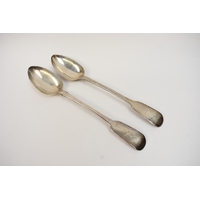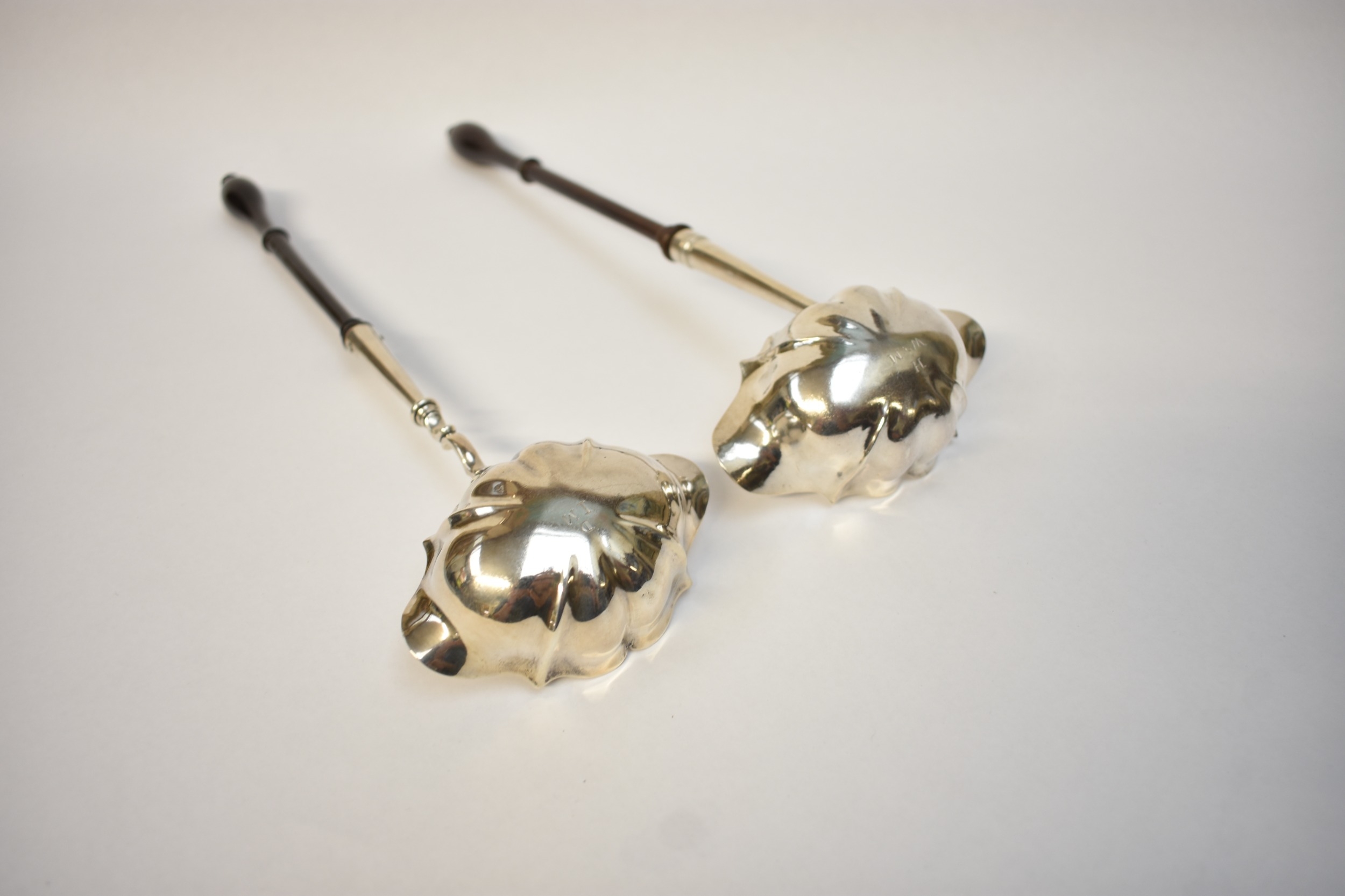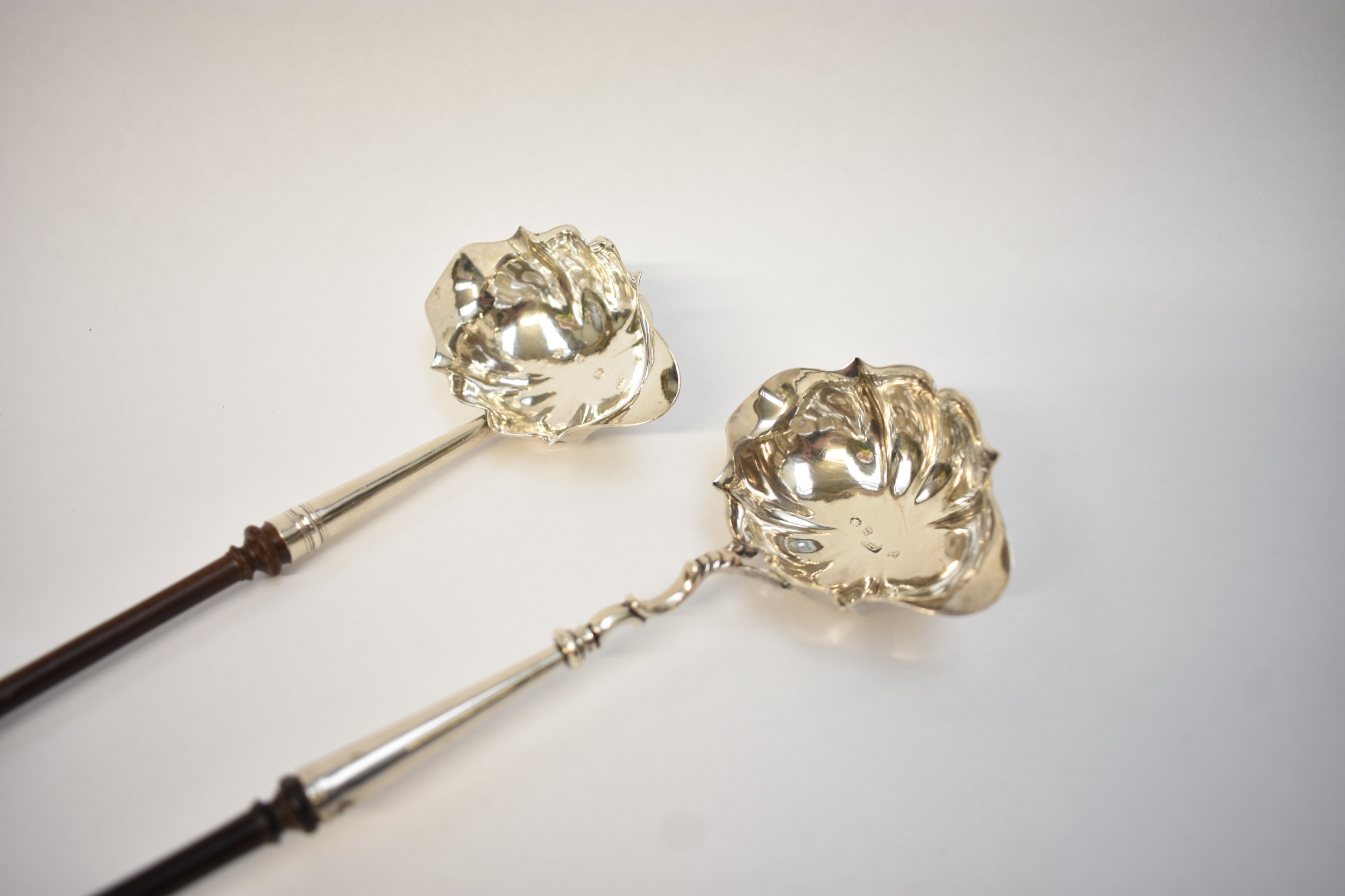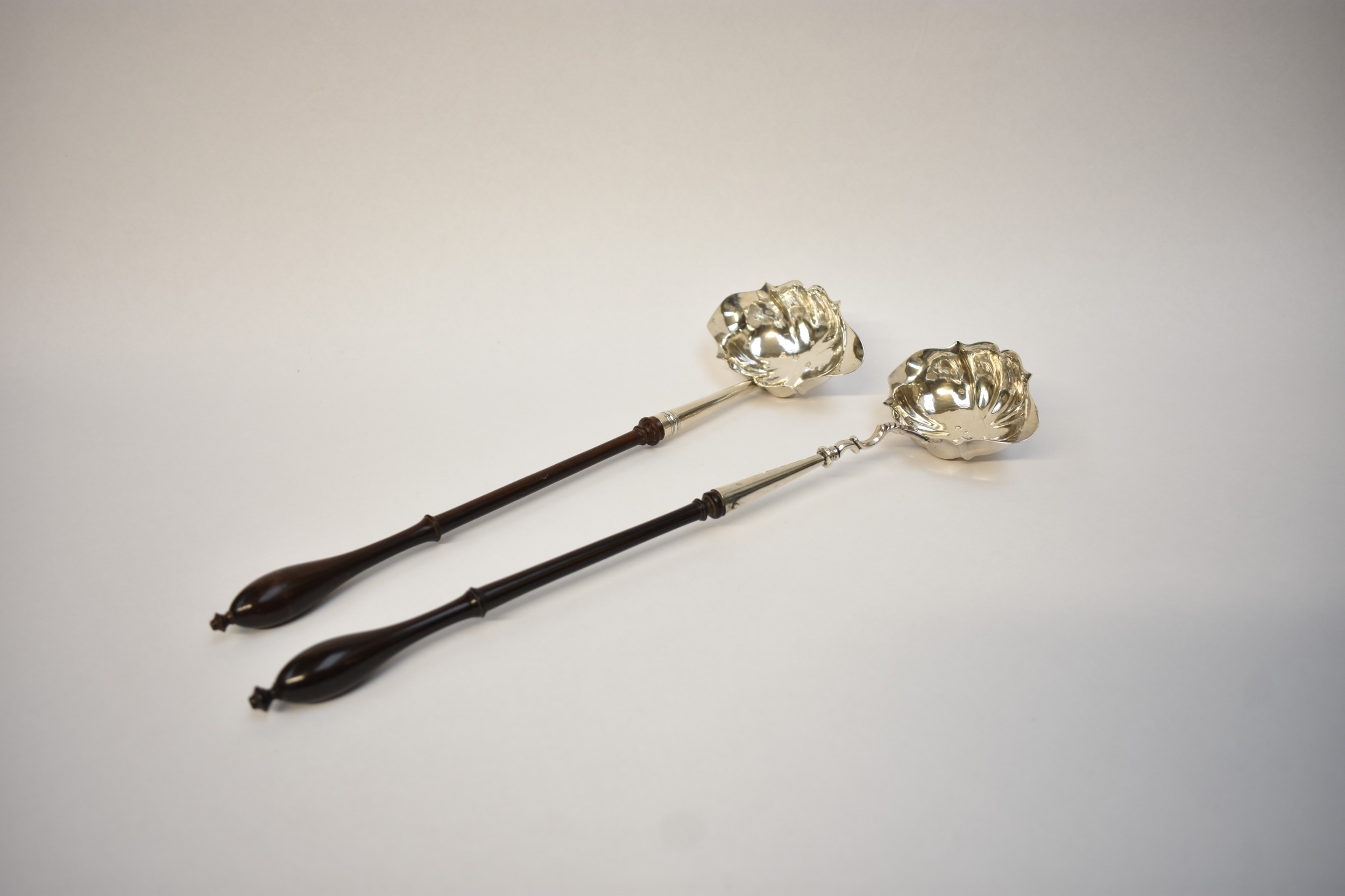 "PG" (?), toddy ladle with scalloped bowl and turned handle, London 1823, and an earlier example, dated 1754, maker's mark worn, both monogrammed, length 34cm and 32cm respectively