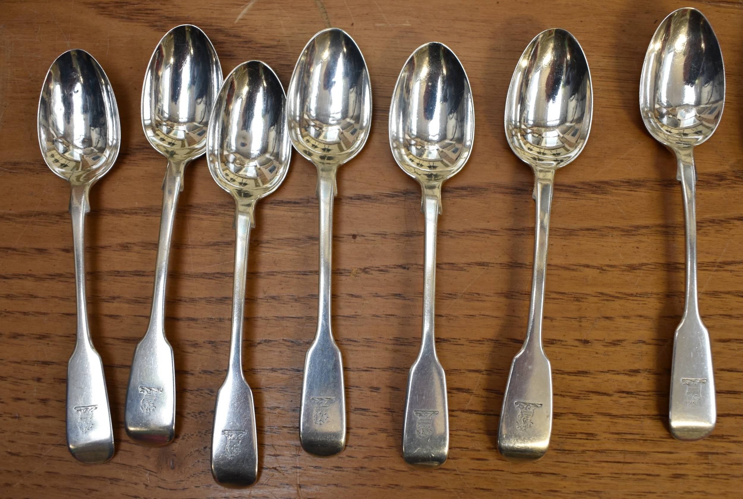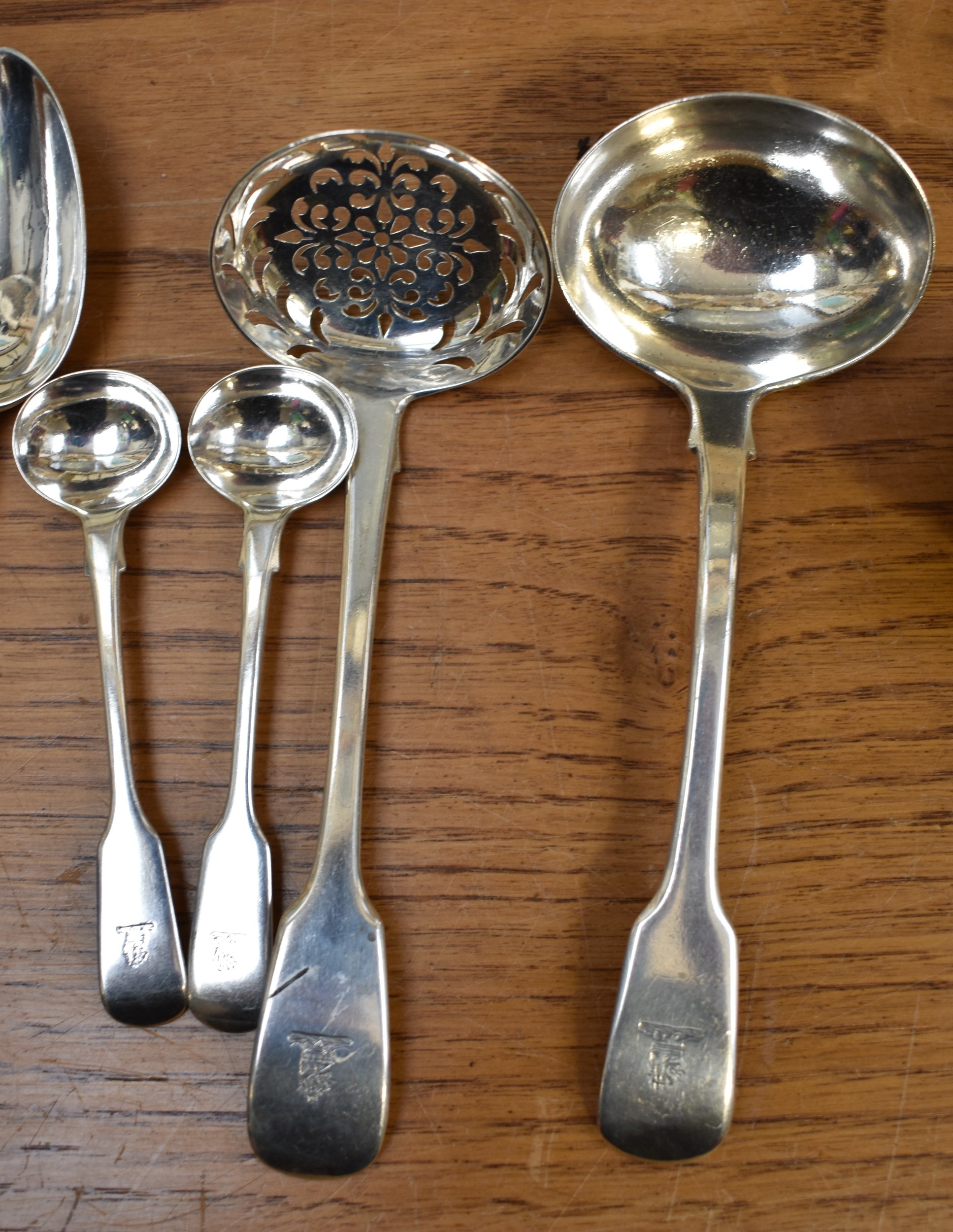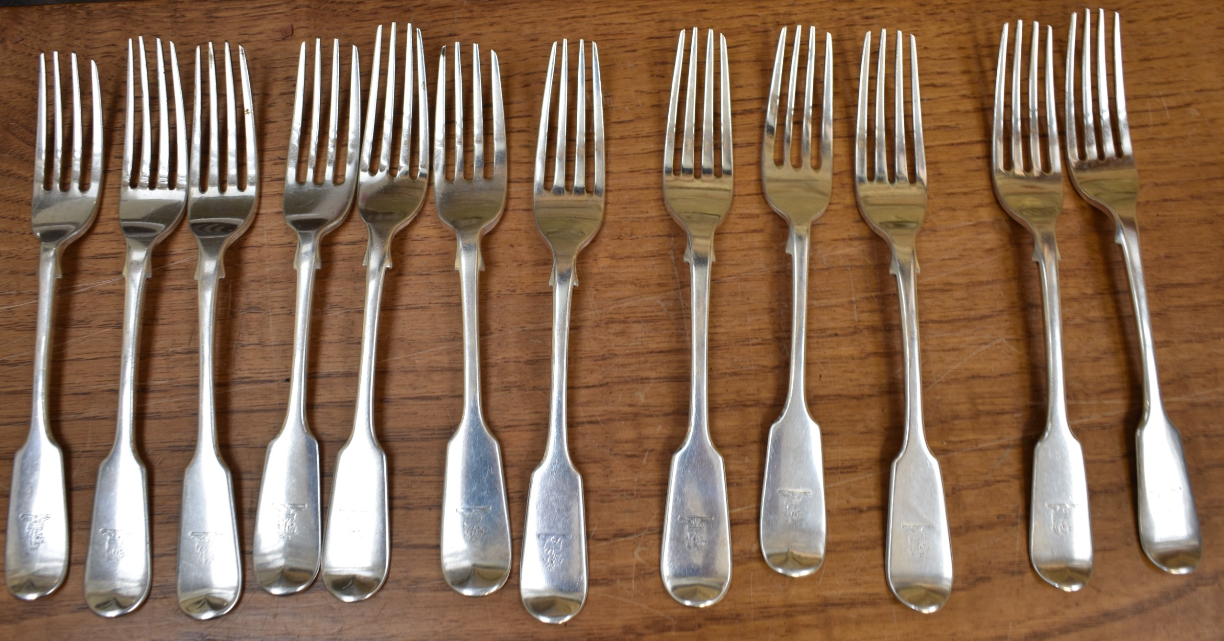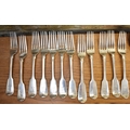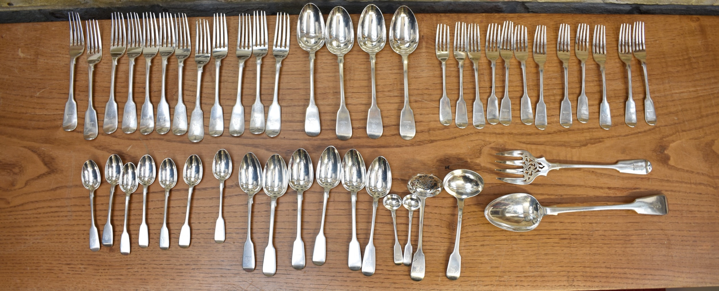 A matched part canteen of silver cutlery all with lion crest to handles comprising twelve small forks, twelve large forks, four serving spoons, a basting spoon, serving fork, seven teaspoons, six dessert spoons, ladle, sifting spoon and two condiment spoons various makers, majority are Victorian, 2600g