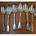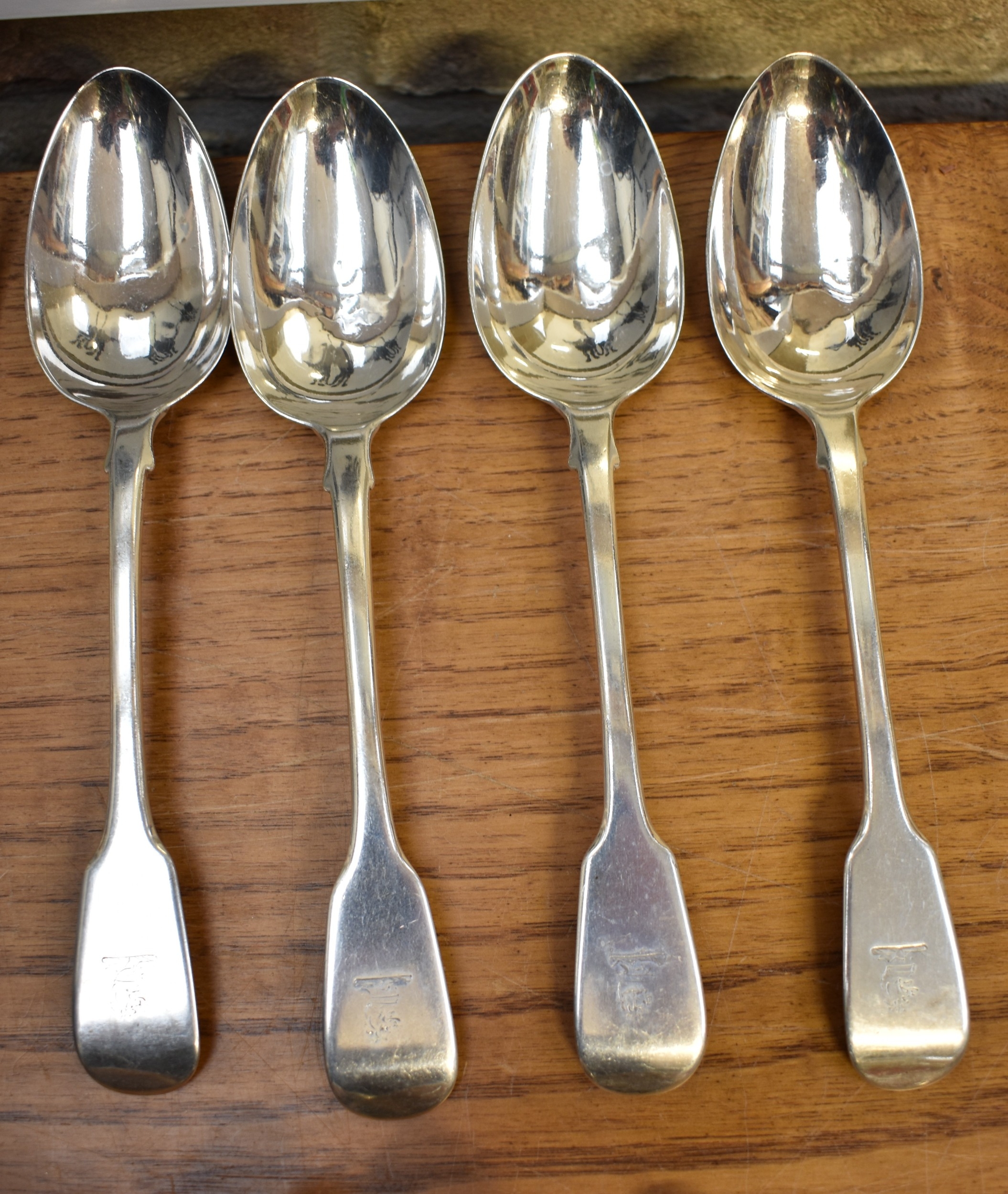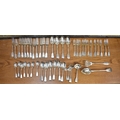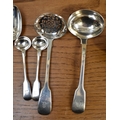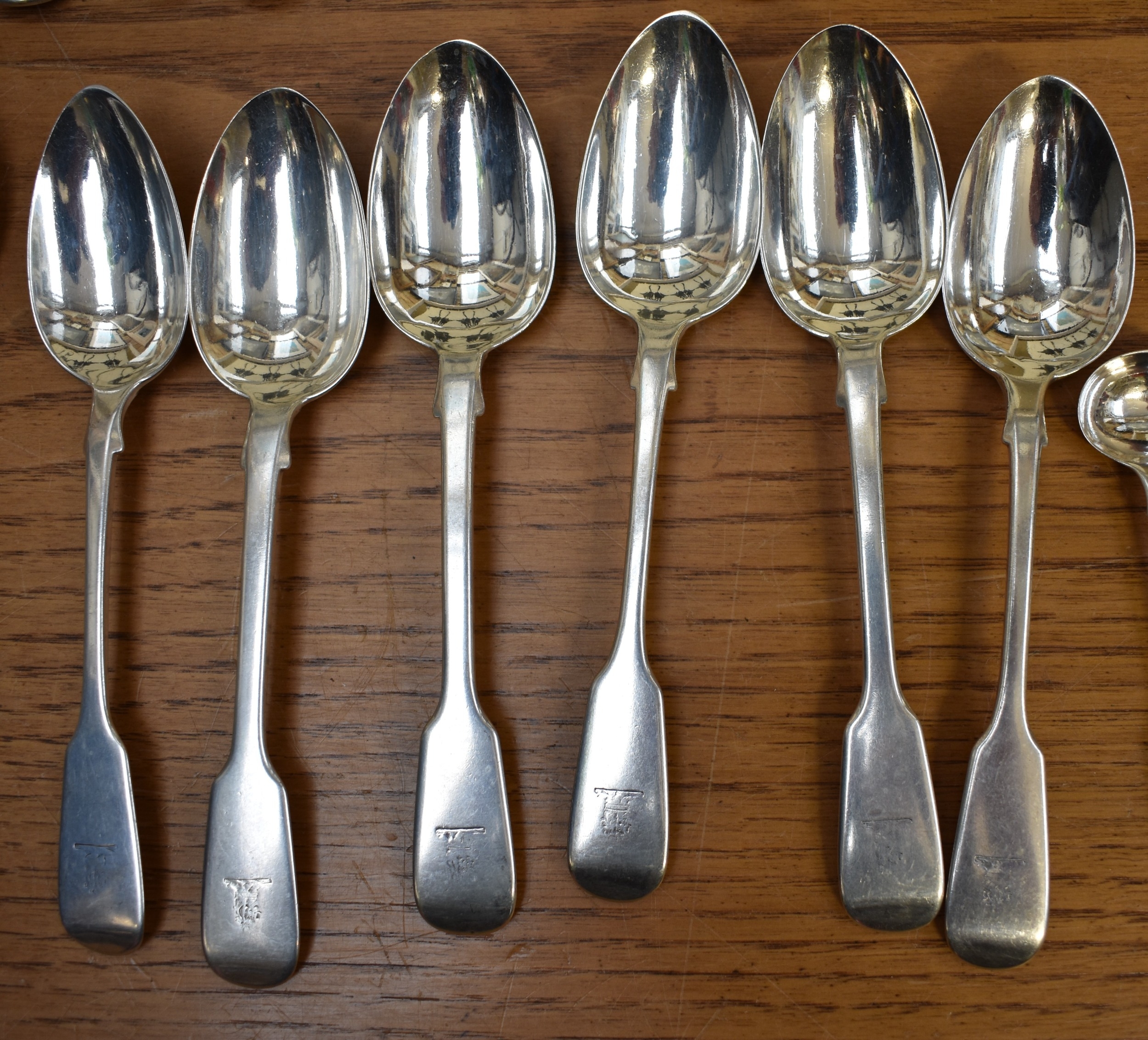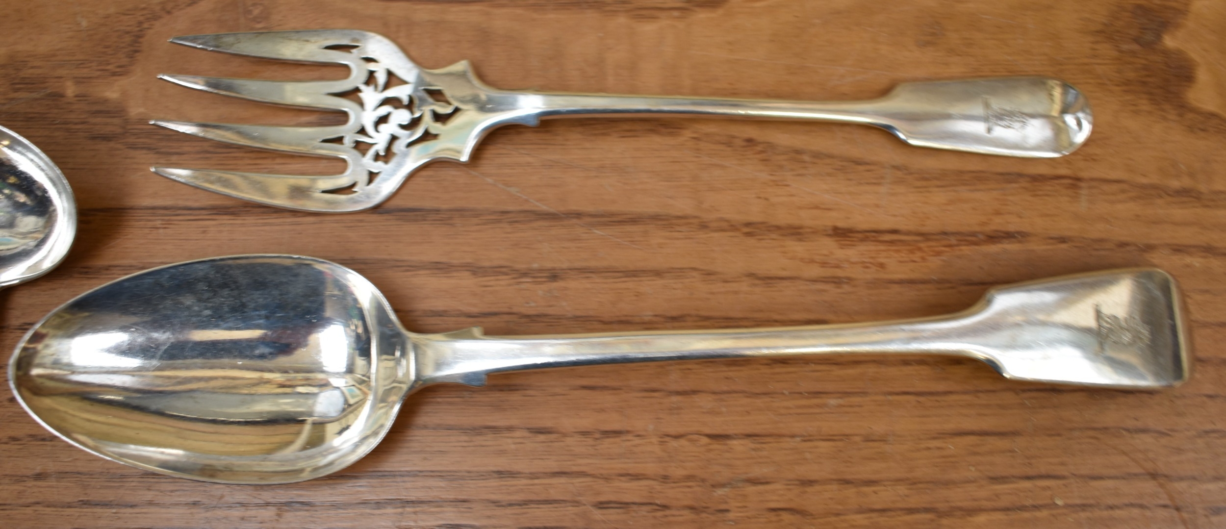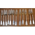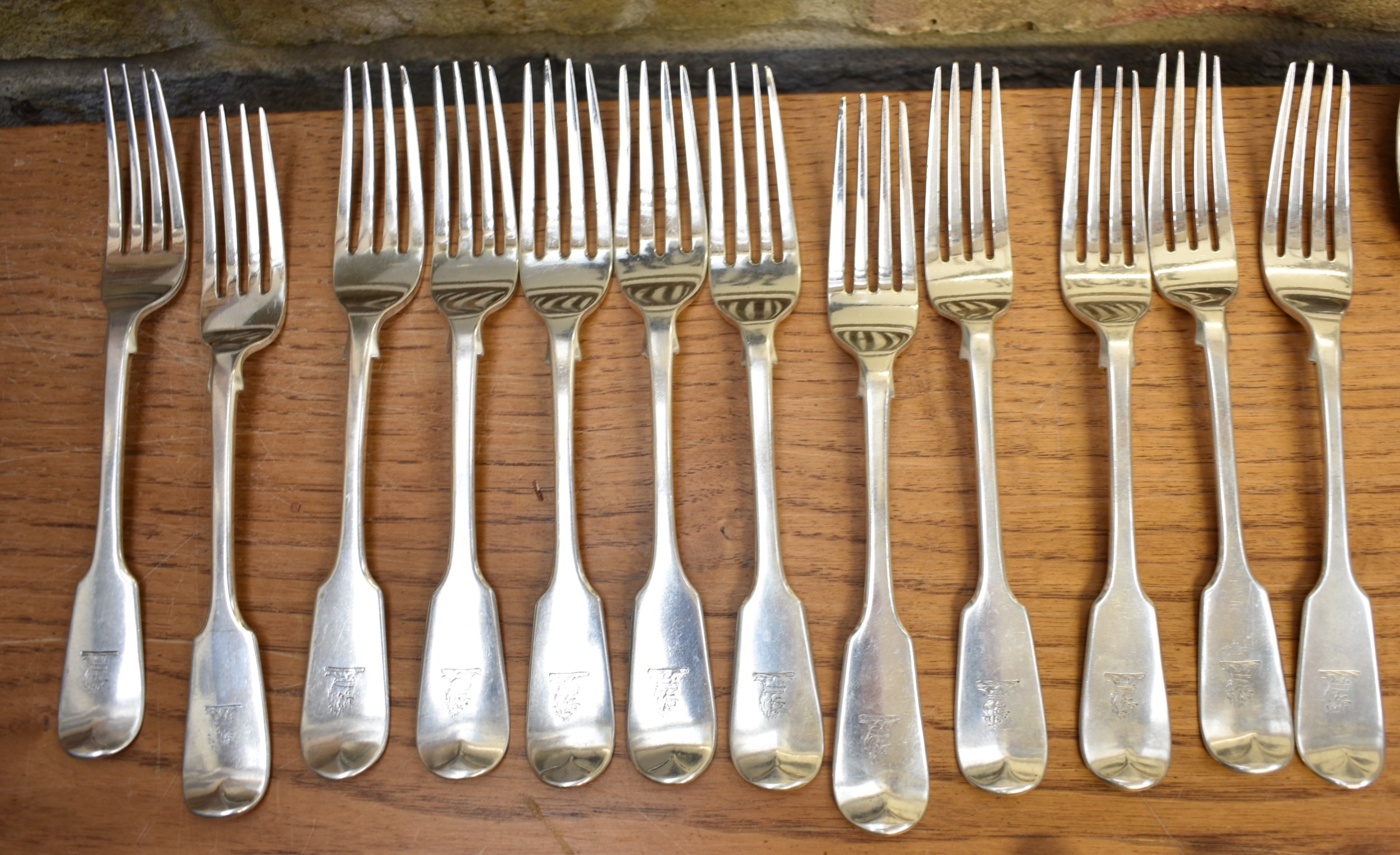 A matched part canteen of silver cutlery all with lion crest to handles comprising twelve small forks, twelve large forks, four serving spoons, a basting spoon, serving fork, seven teaspoons, six dessert spoons, ladle, sifting spoon and two condiment spoons various makers, majority are Victorian, 2600g