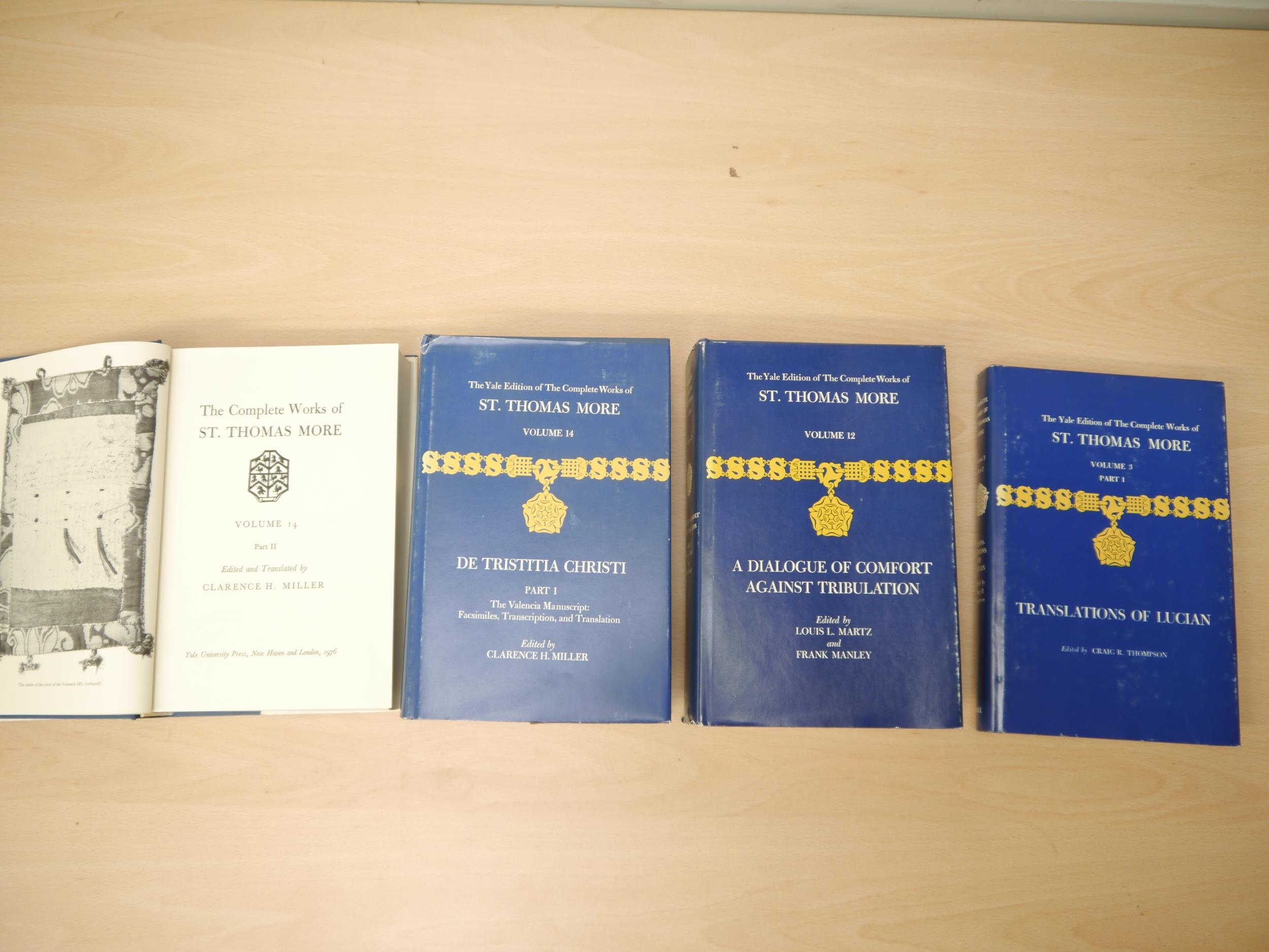 Thomas More; Craig R. Thompson, Clarence H. Miller and others: 'The Yale Edition of the Complete Works of St. Thomas More', New Haven & London, Yale University Press, 4 various volumes, comprising 'Volume 3 Part 1 Translations of Lucian', 1978, 2nd printing, 'Volume 12 A Dialogue of Comfort Against Tribulation', 1976, 'Volume 14 De Tristitia Christi Parts I & II', 1976, 2 volumes, all original cloth gilt, dust wrappers, vol 14 part II also in a part I dust wrapper (4)