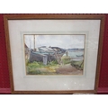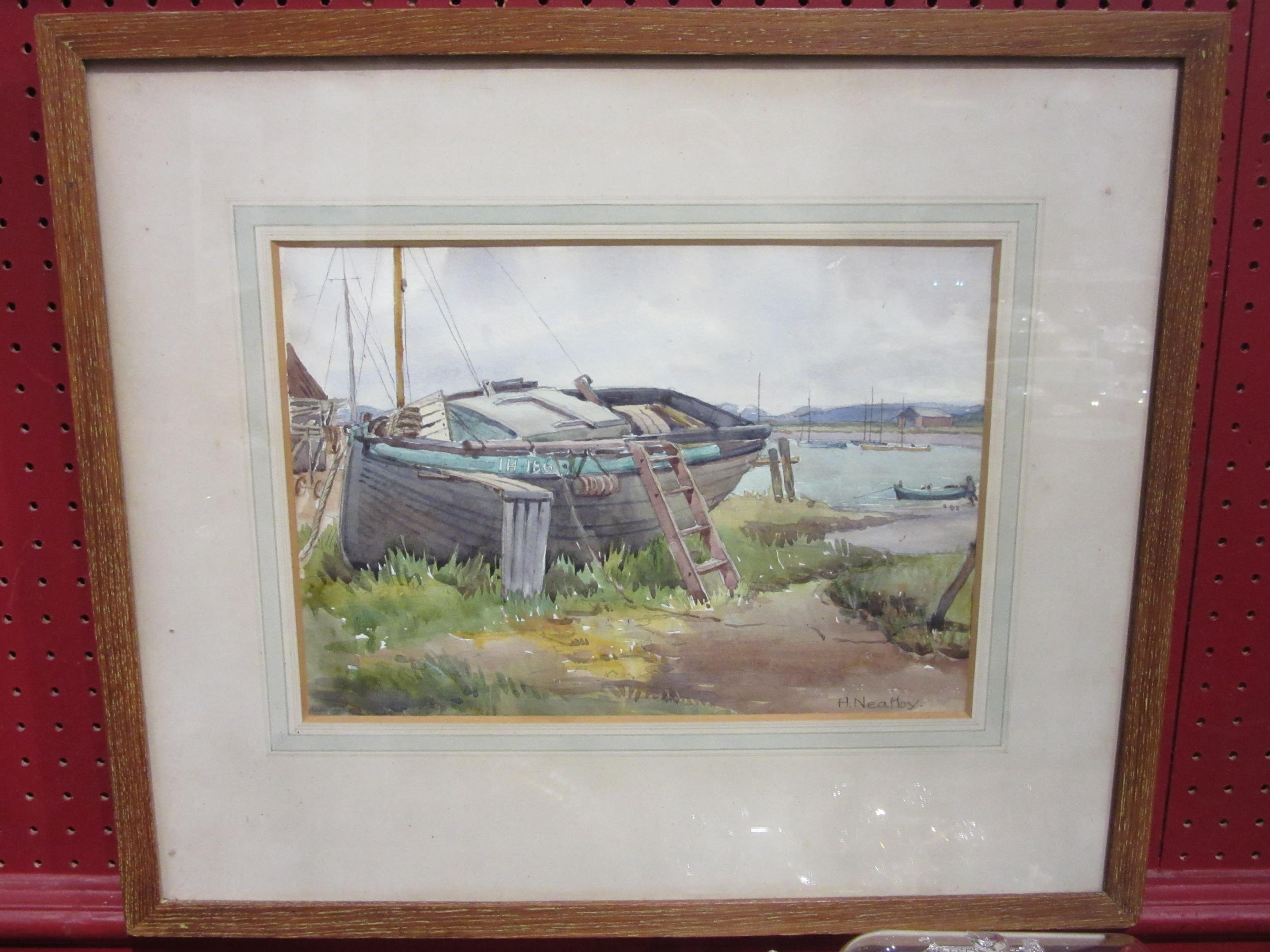 H. NEATBY: Watercolour of beached sailing vessel, signed lower right, framed and glazed, 22cm x 31cm image size