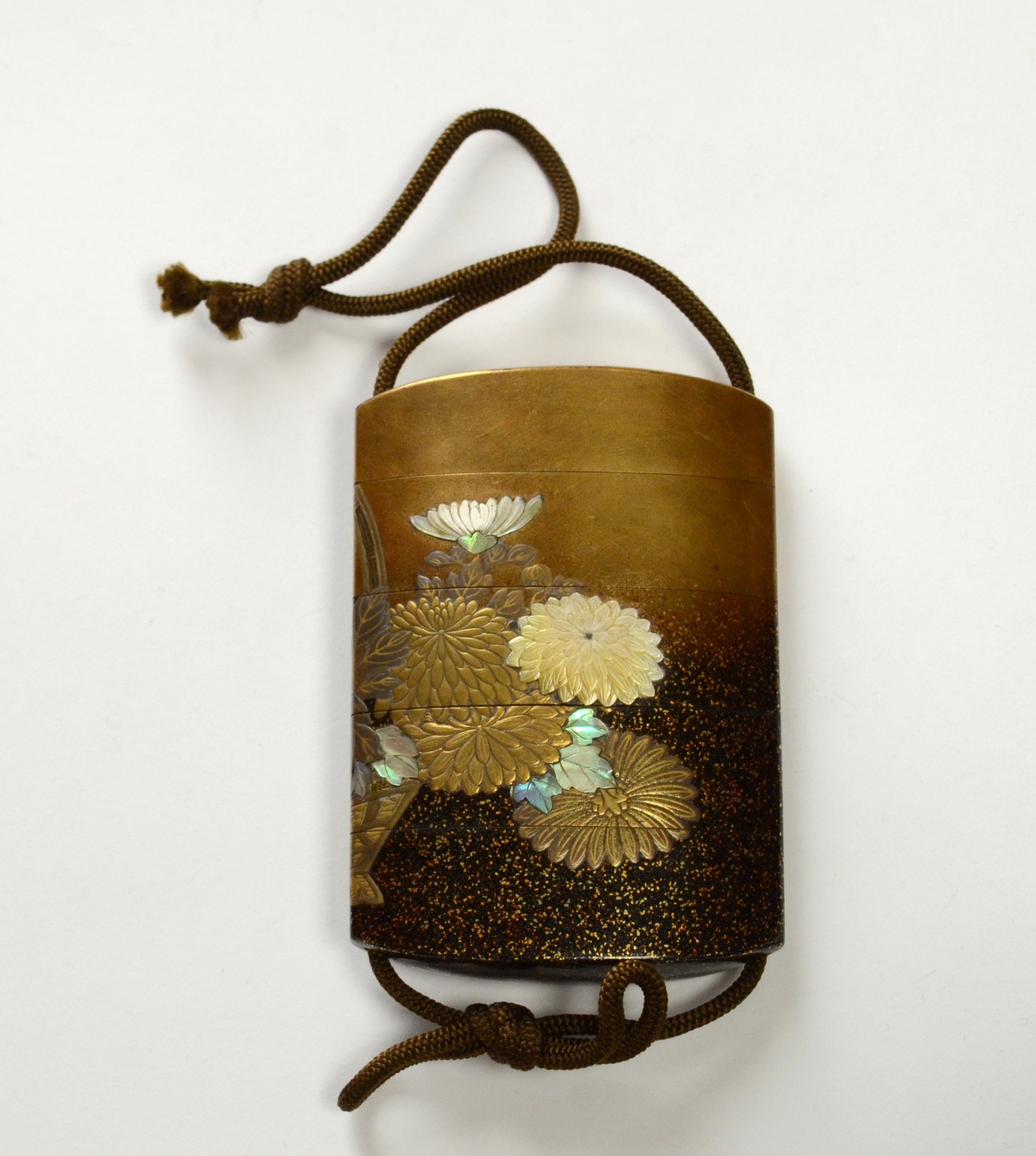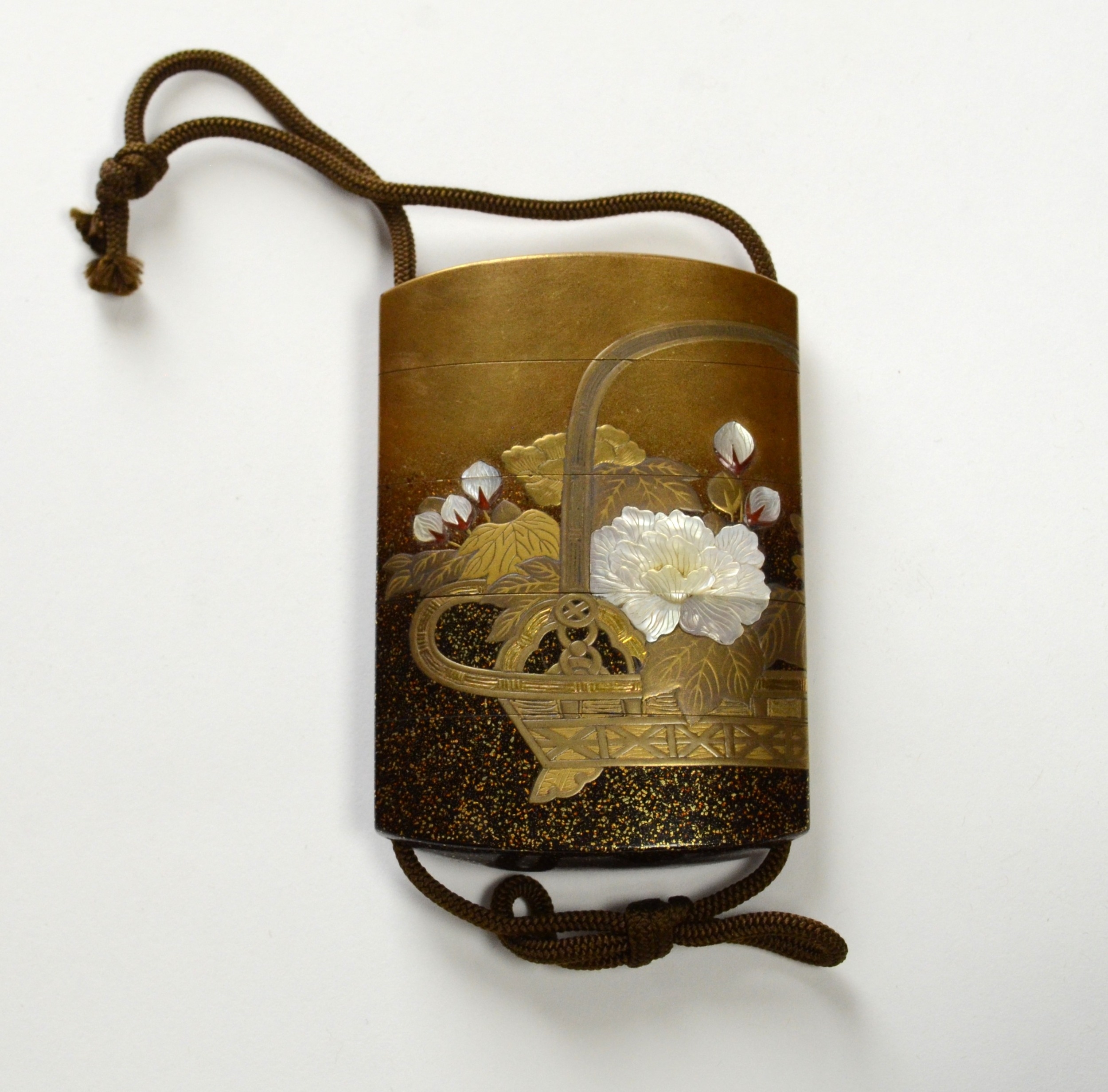 KAJIKAWA- A four case lacquer inro decorated in gold hiramakie with 'flower basket' using shibayama carved shell and takamaki-e flowers, signed to base7.2cm high, 5.3cm wideProvenanceHenry Potter Stevens Collection no 17