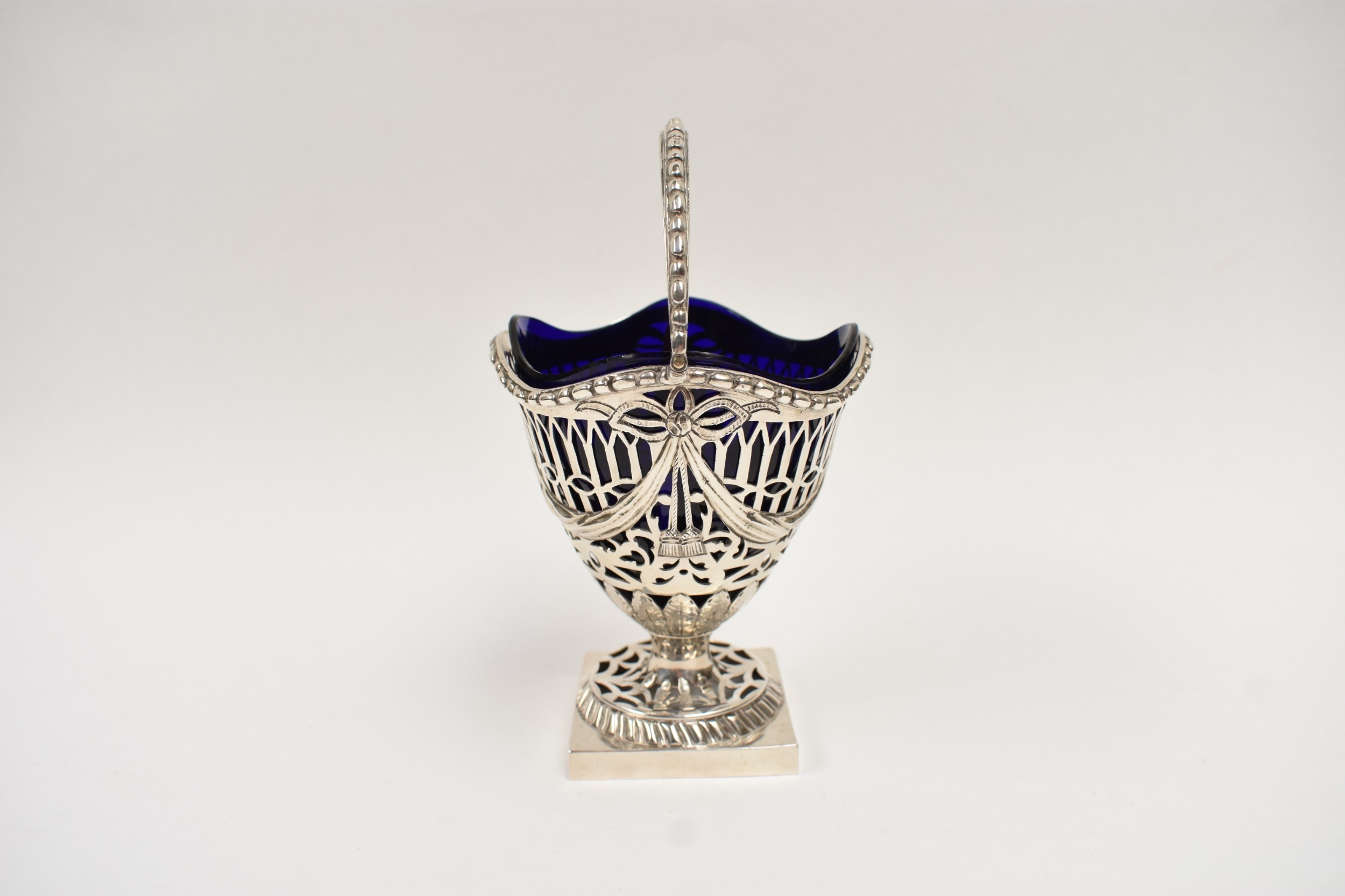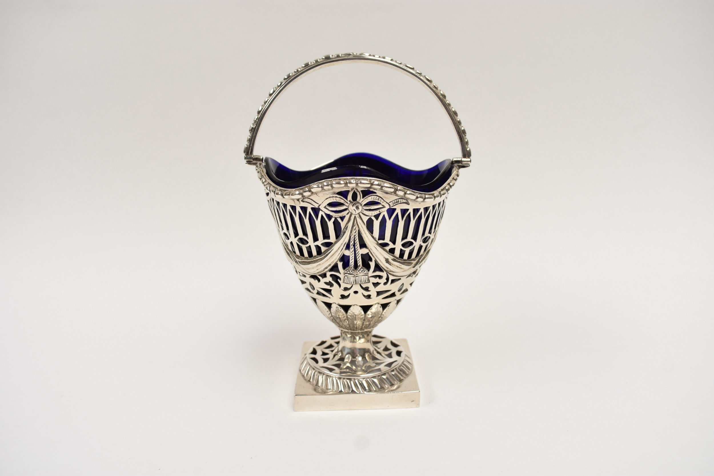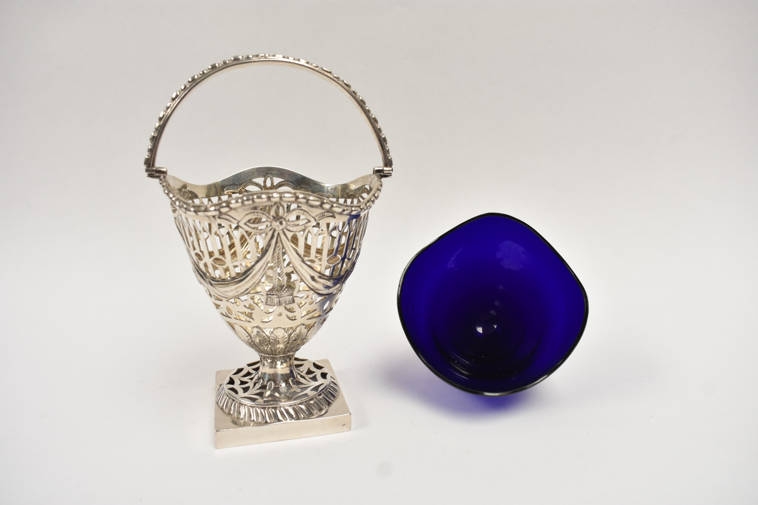 A George Nathan & Ridley Hayes silver sugar basket of classical design with swags and tassels, Chester 1895, blue glass liner with slight nibbles, split to rim, 11.5cm tall. 174g