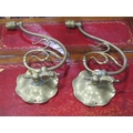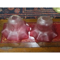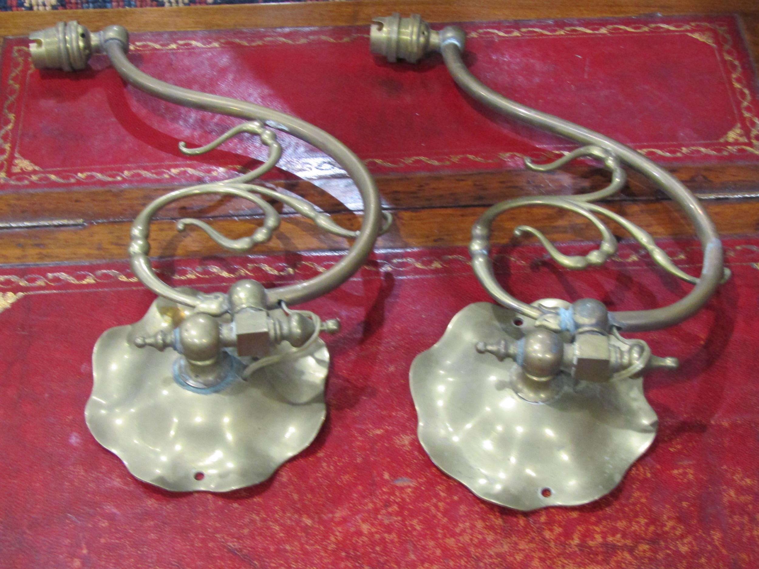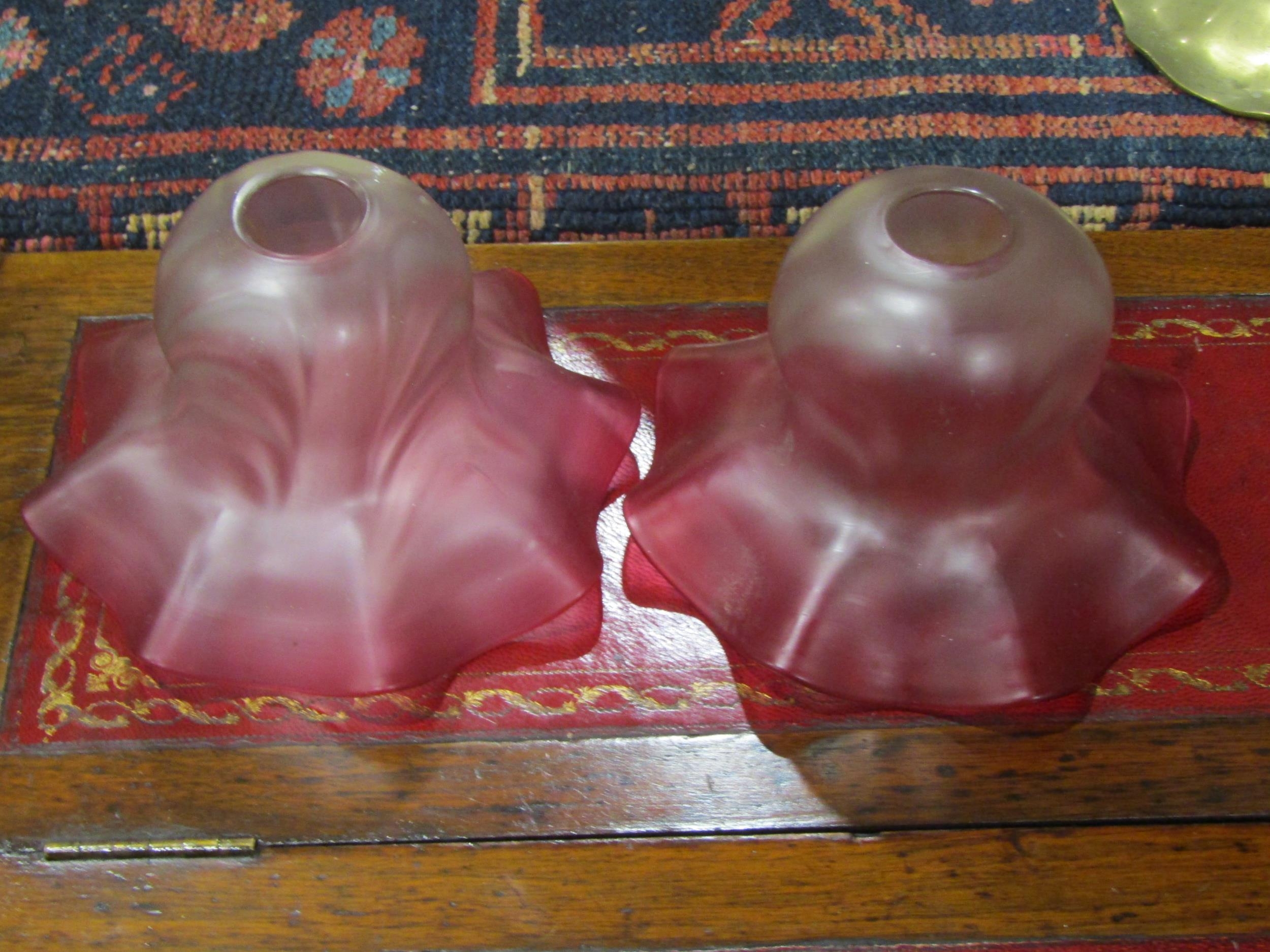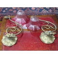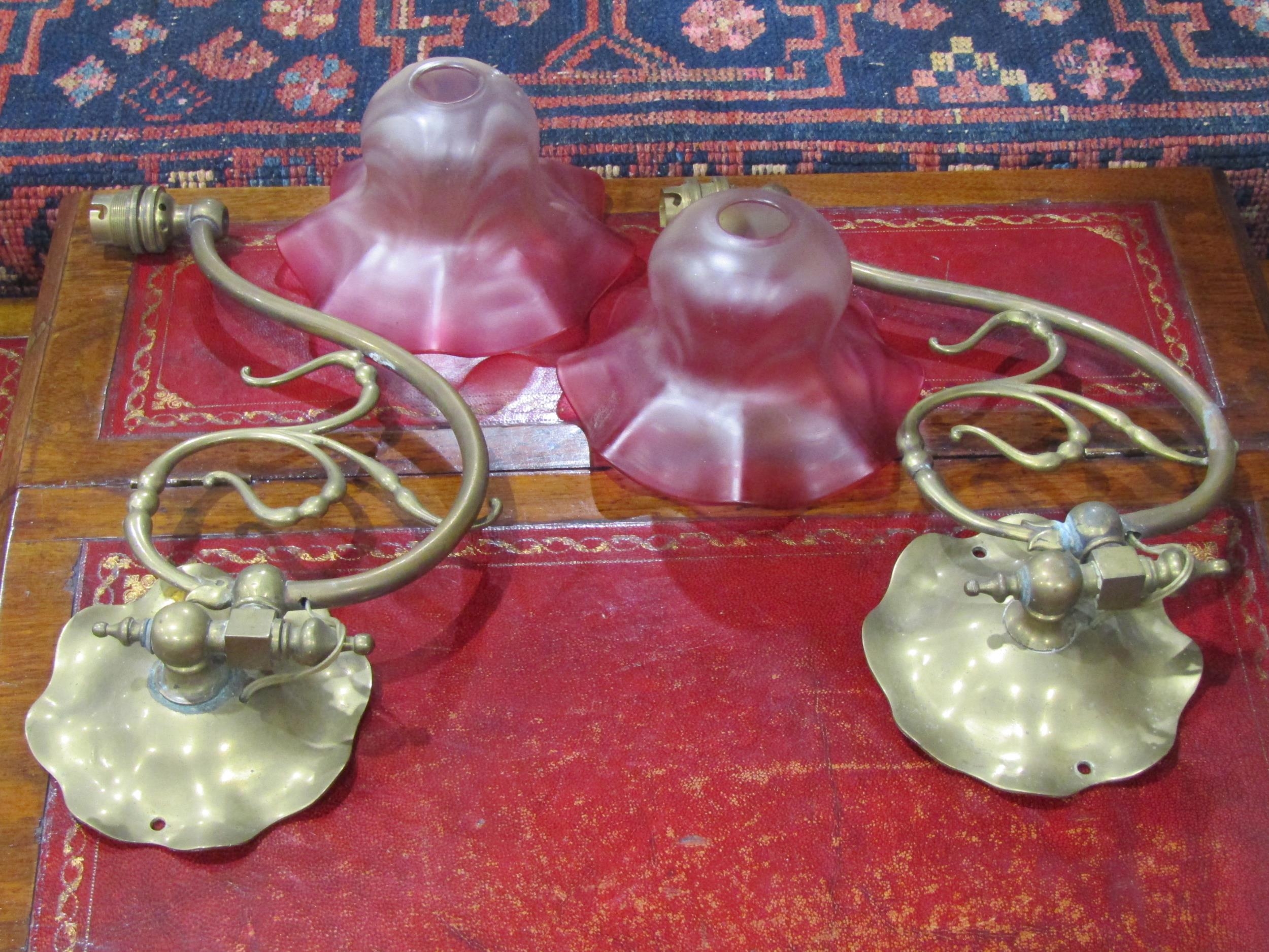 A pair of vintage brass wall lights with mulberry coloured g...