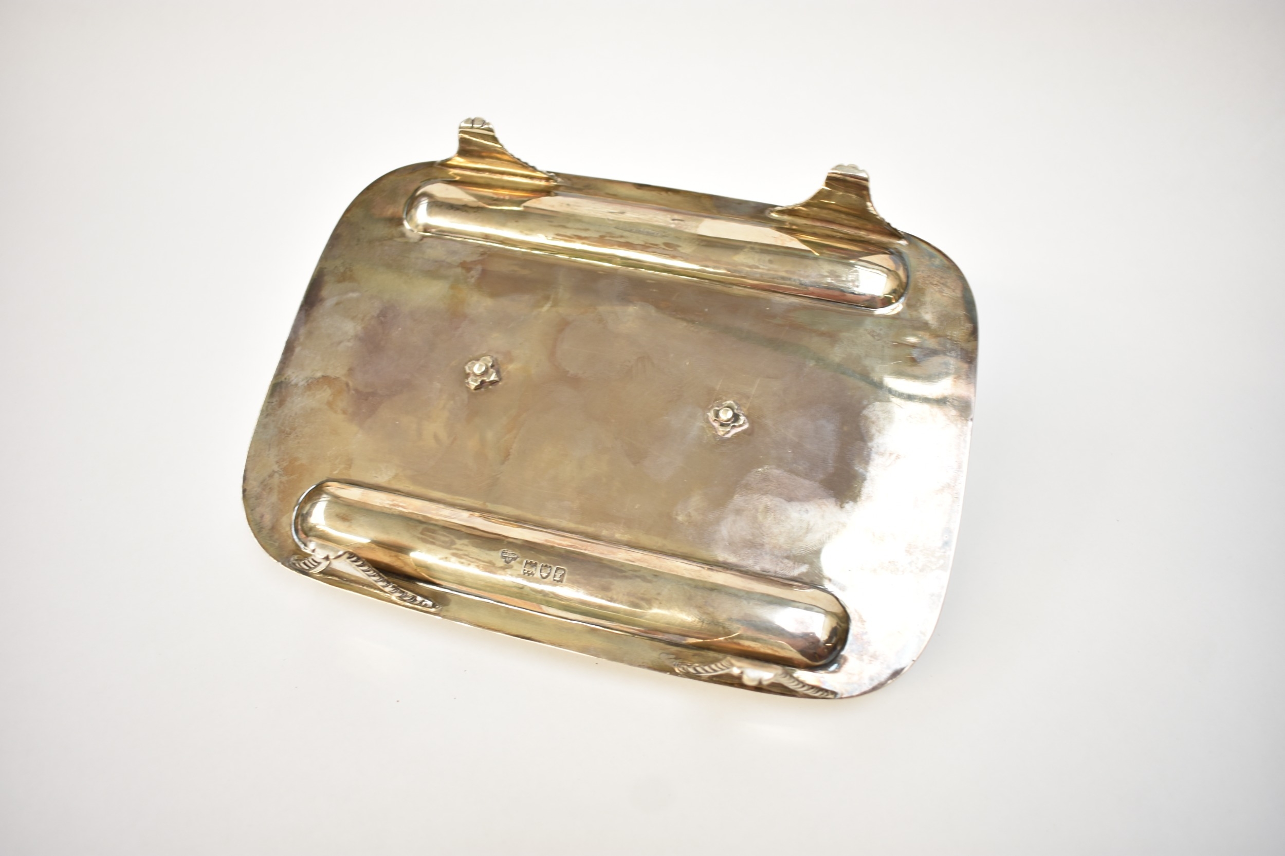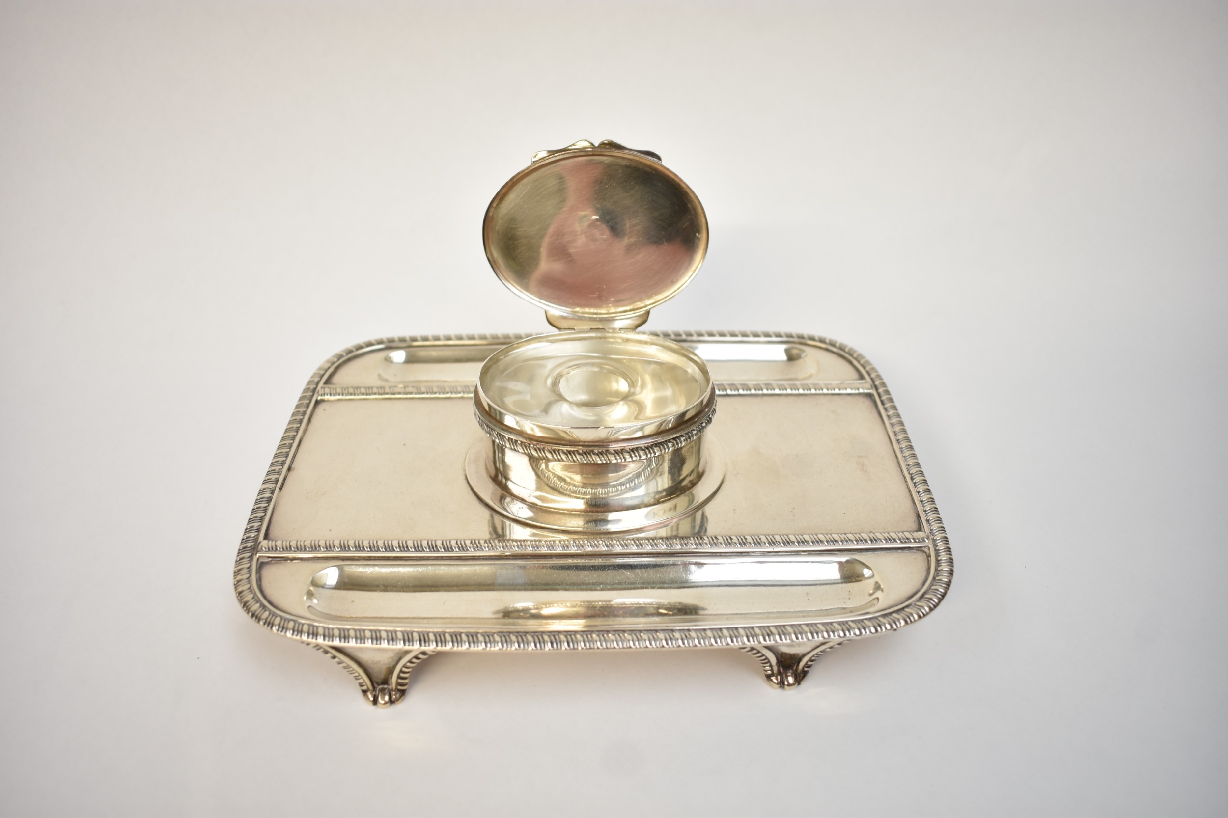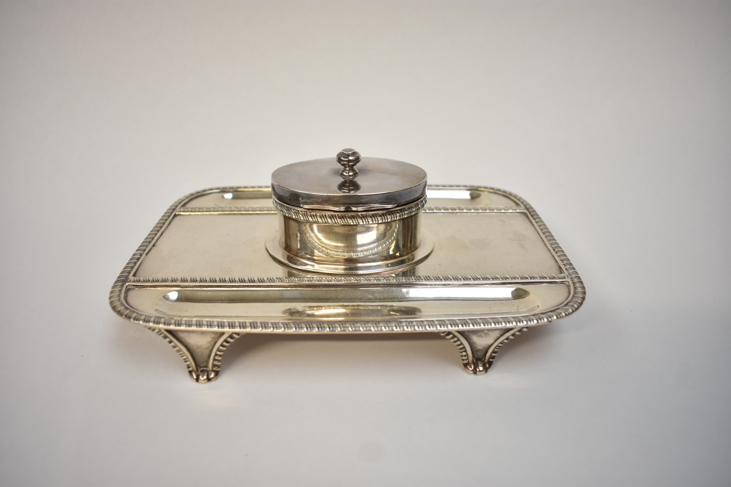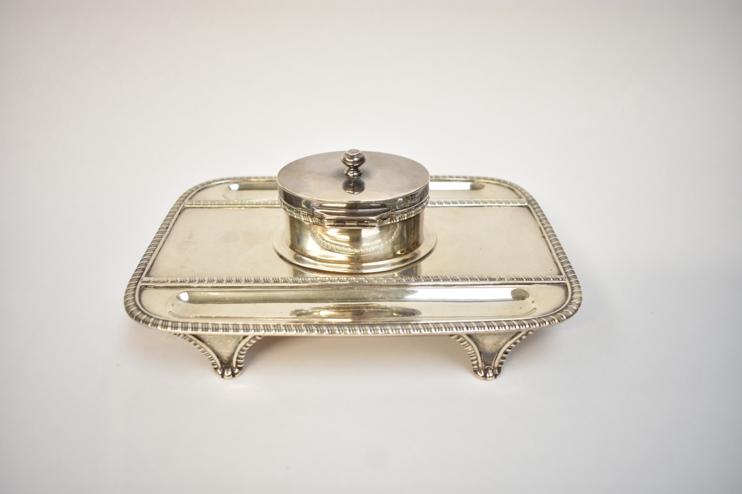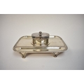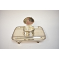 A C&S Ltd silver desk pen and ink stand with central lidded inkwell with glass liner, London 1901, 7cm x 20.3cm x 14.5cm, 460g
