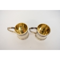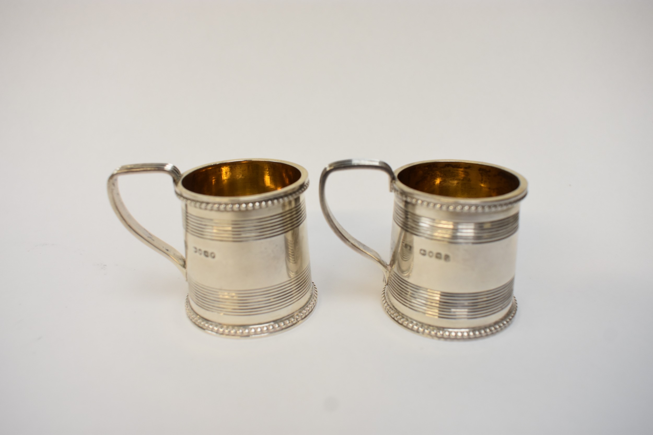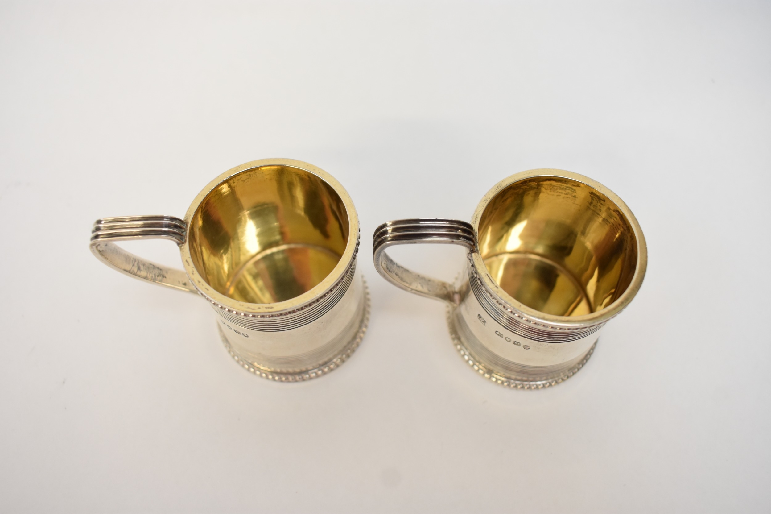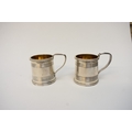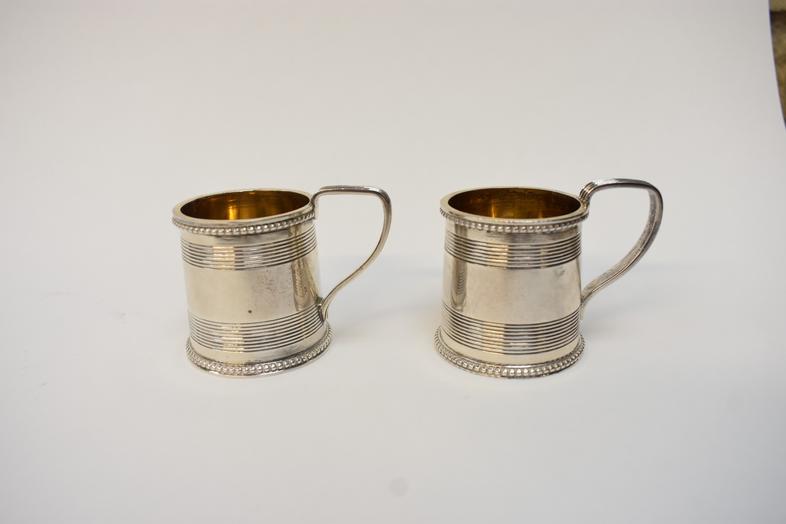 A pair of Victorian silver miniature tankards in the George III style, each with beaded rims, tramline decoration, and reeded handles. London 1867. By Richard Sibley II. 5cm tall. 100g.