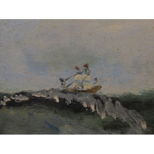 An oil on board of a ship at sea, framed, 26cm x 48cm image size