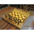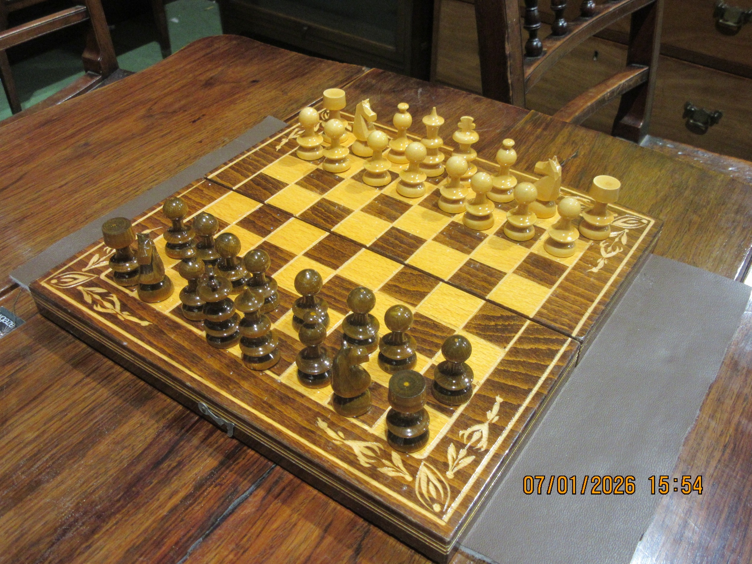 A wooden chess set with box board