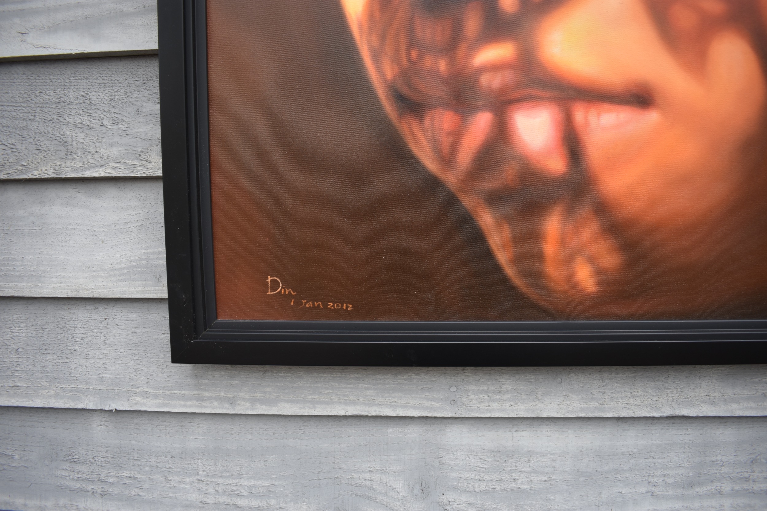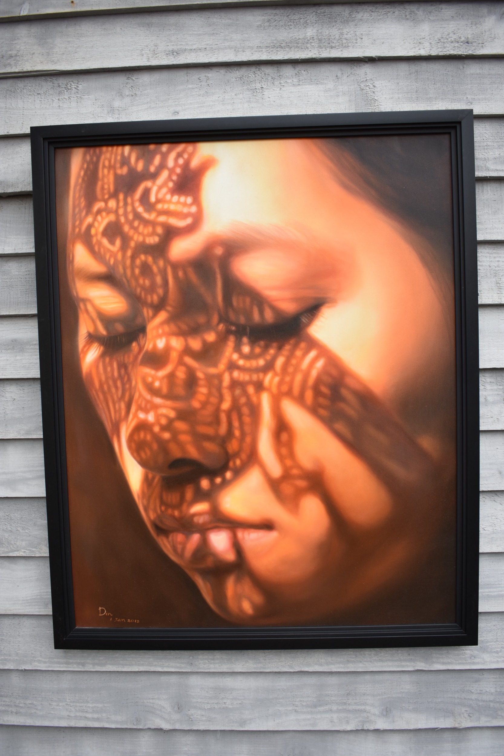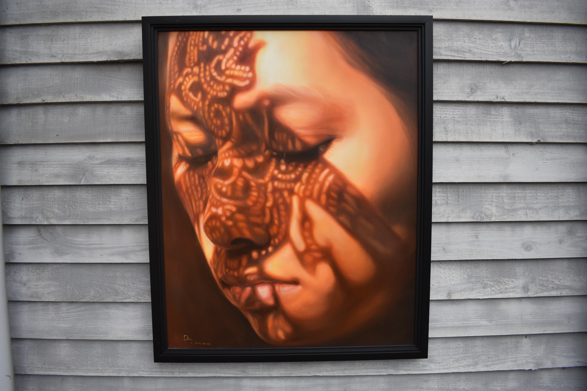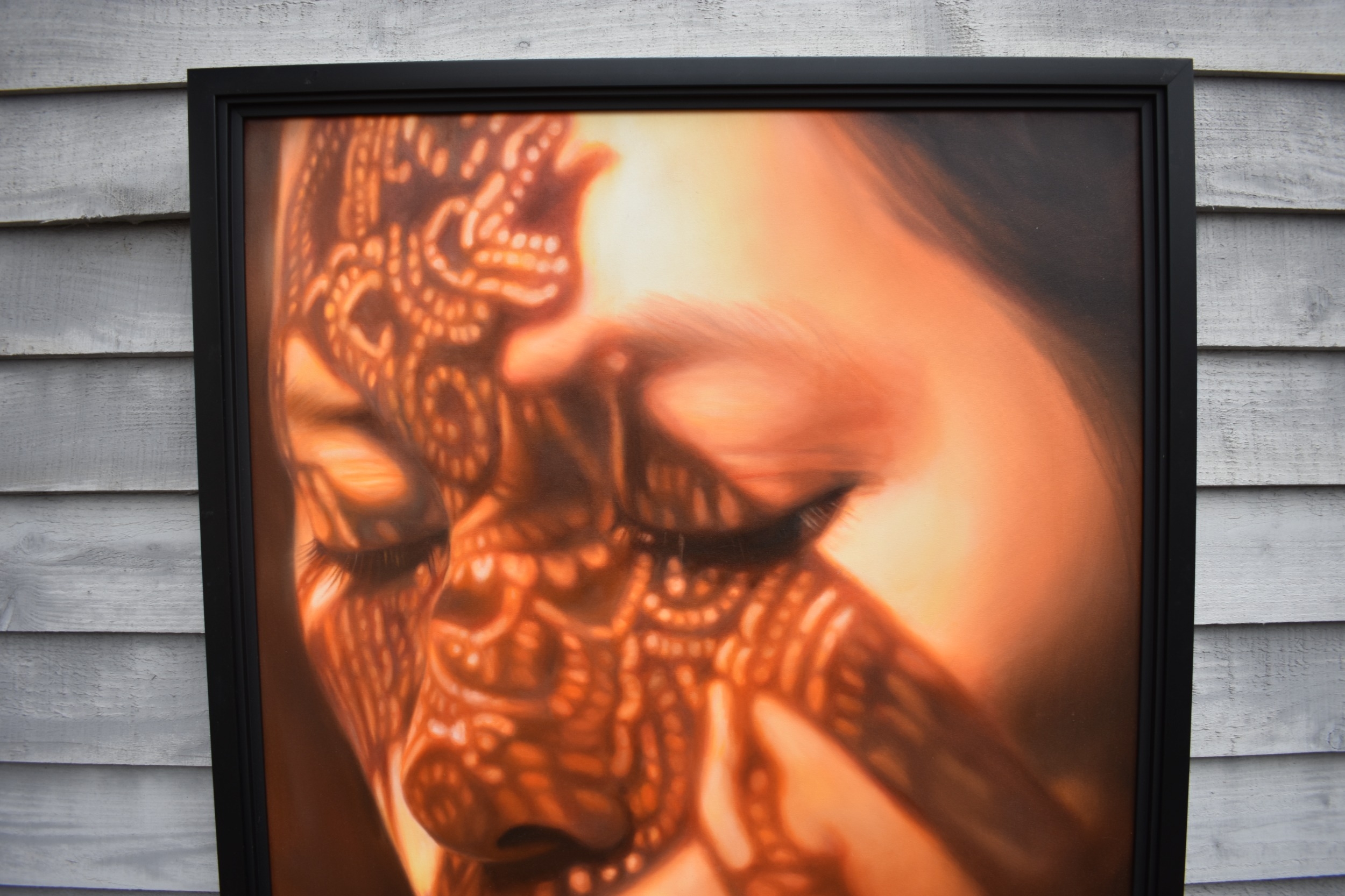 KARUNA PANUMES (b. 1967) Thai Contemporary Artist: Self-portrait executed in oils on canvas, in meticulous detail that make them stunningly life-like, they articulate her emotions with a spiritual intensity that's compelling and honest. Mysterious shadows and light patterns fall on her impassive features. These are rich in the symbolism of Thai culture. Dated 2012. 99cm x 79cm