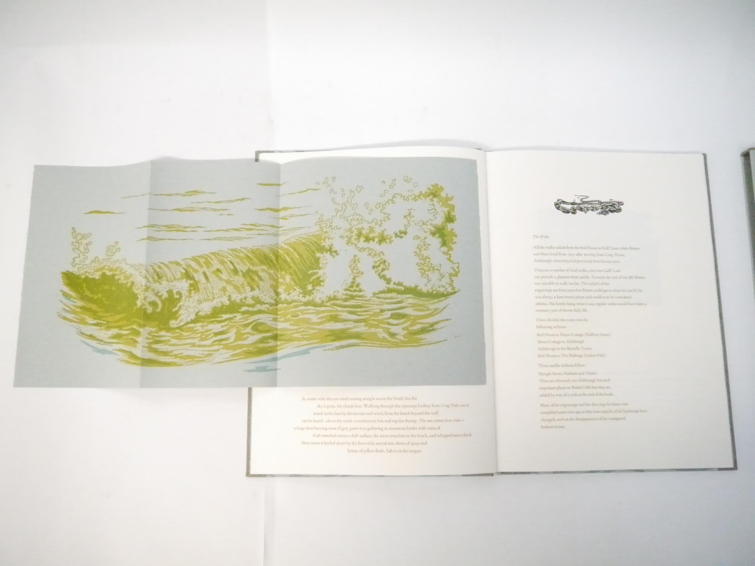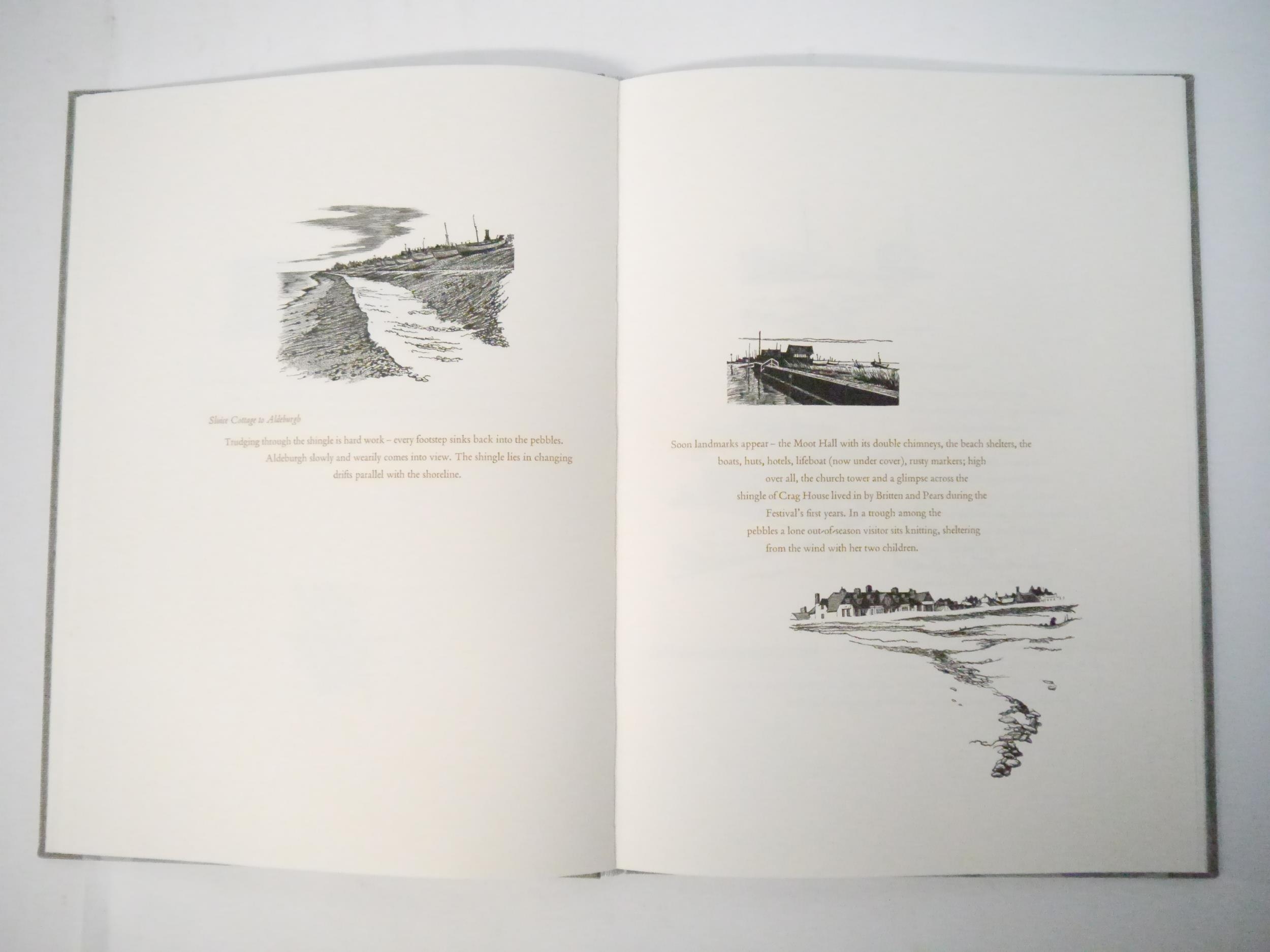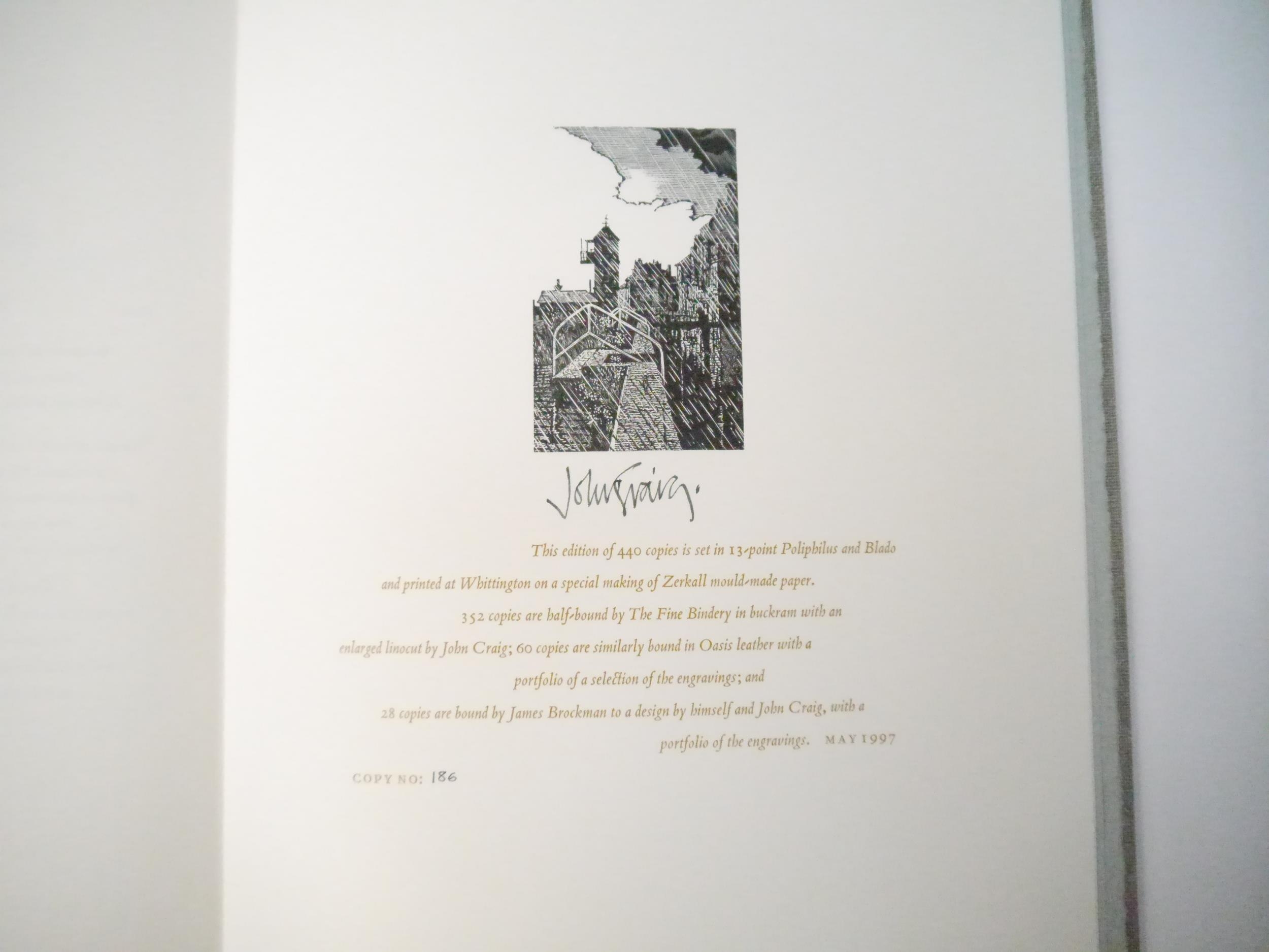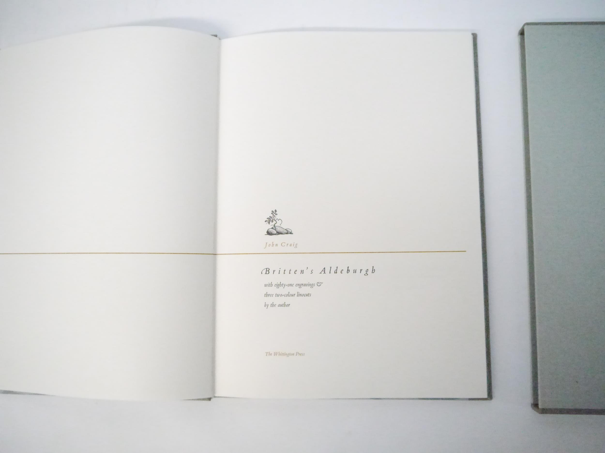 Whittington Press. John Craig: 'Britten's Aldeburgh', Whittington Press, 1997, limited edition, Printed at Whittington on Zerkall mould-made paper in an edition of 440 copies, of which this is number 186 of 352 numbered copies signed by the author and bound in half-buckram, 81 wood engravings (several tipped in), and 3 two-color linocuts (tipped in) by John Craig, large 4to (33 x 23.5cm), original half grey buckram, printed paper label to spine, decorated paper covered boards of an enlarged linocut by John Craig. Fine in original slipcase