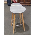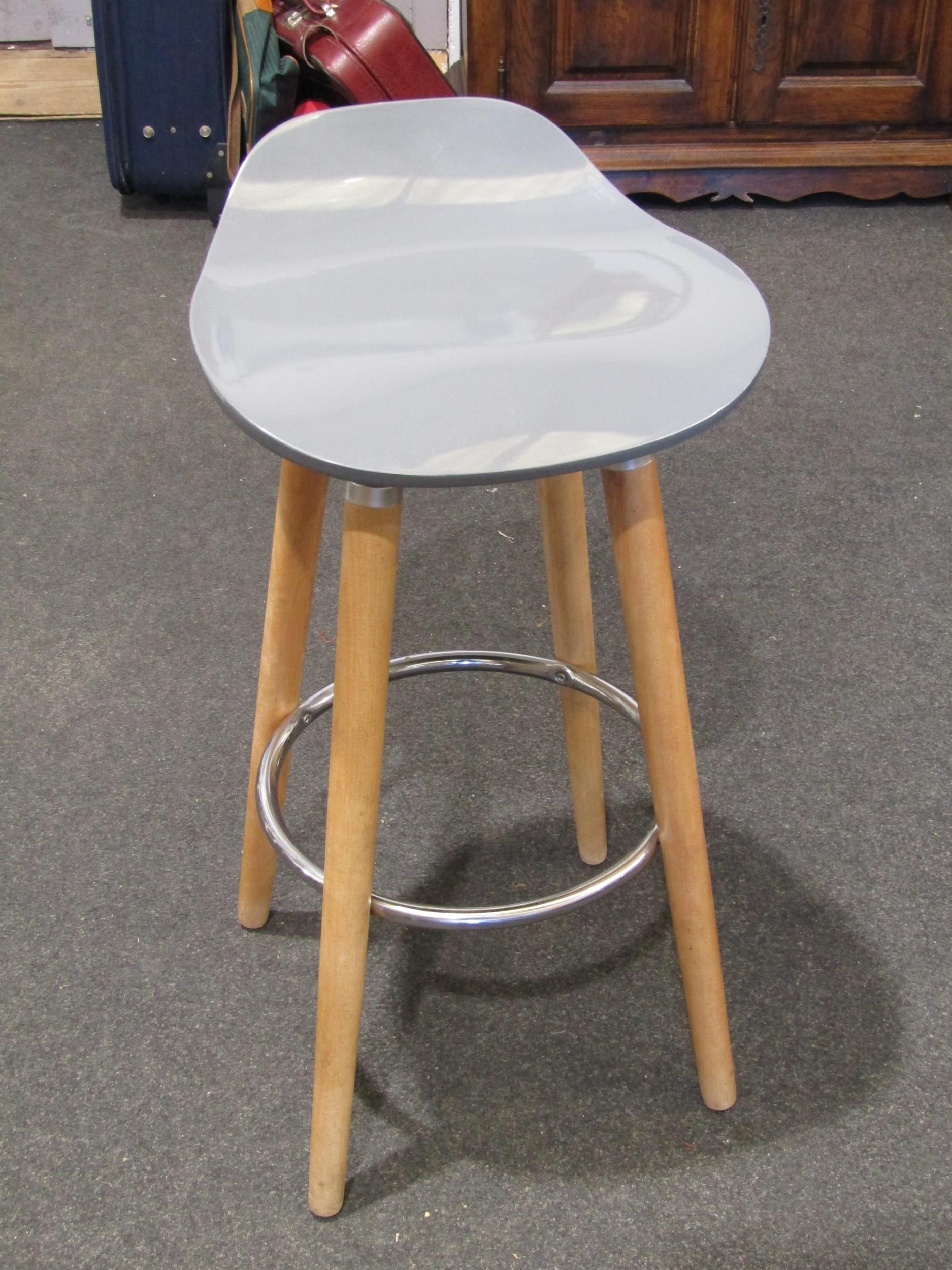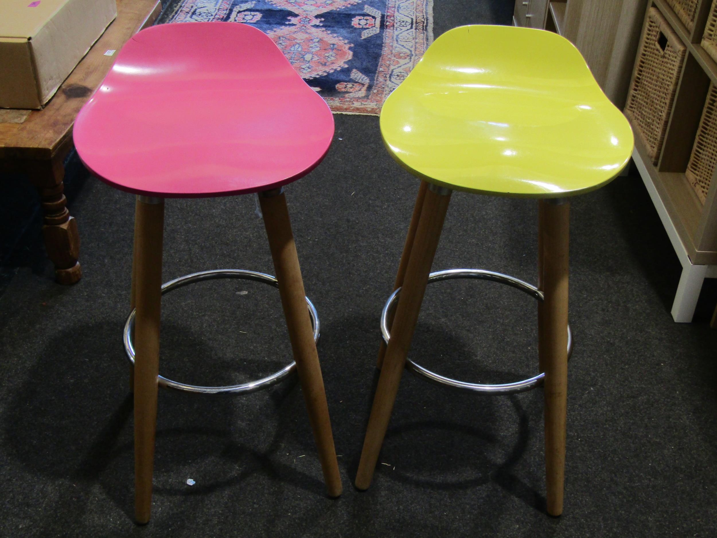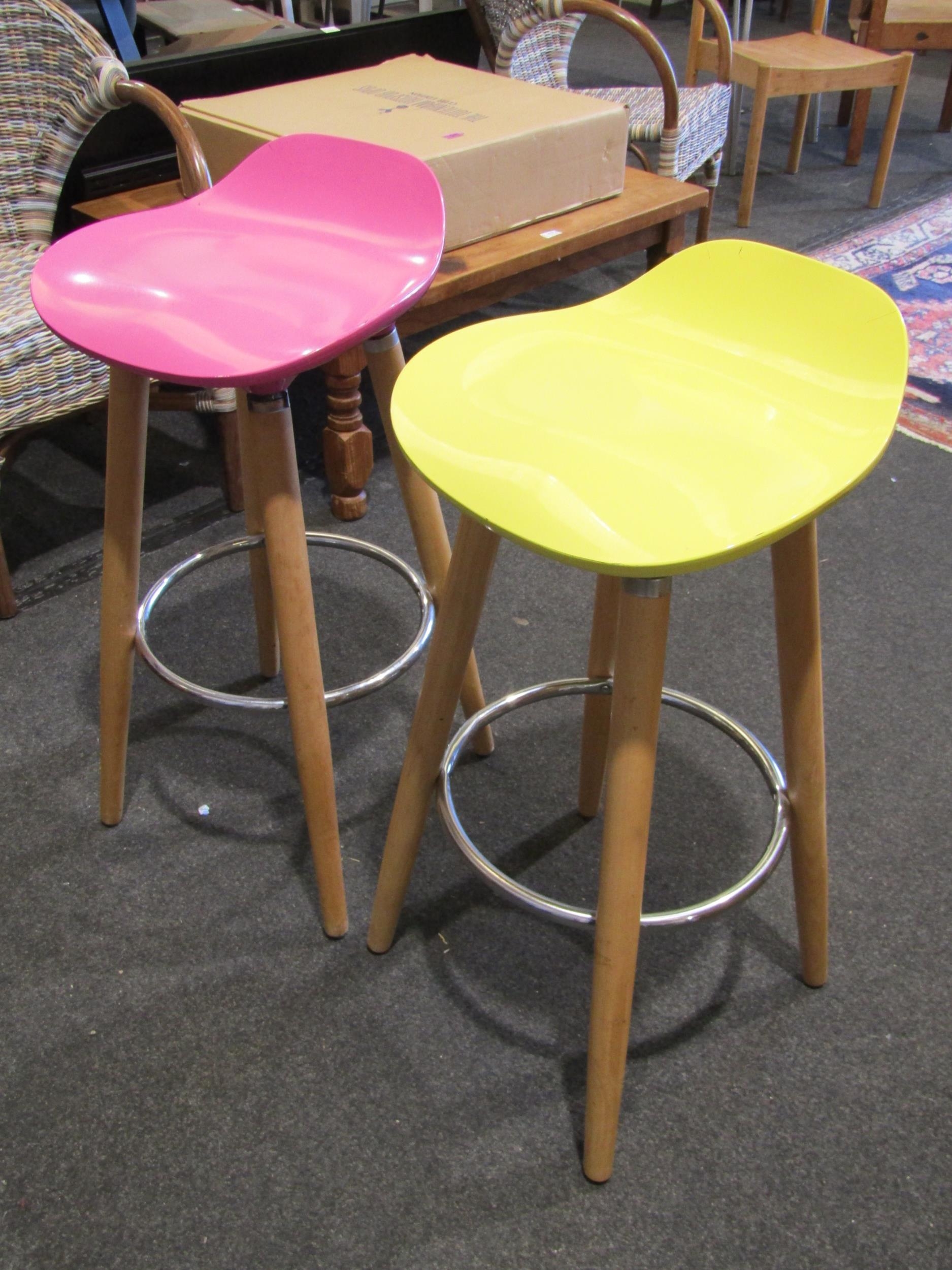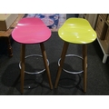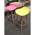 Three modern bar stools with grey, yellow and pink seats. Wo...