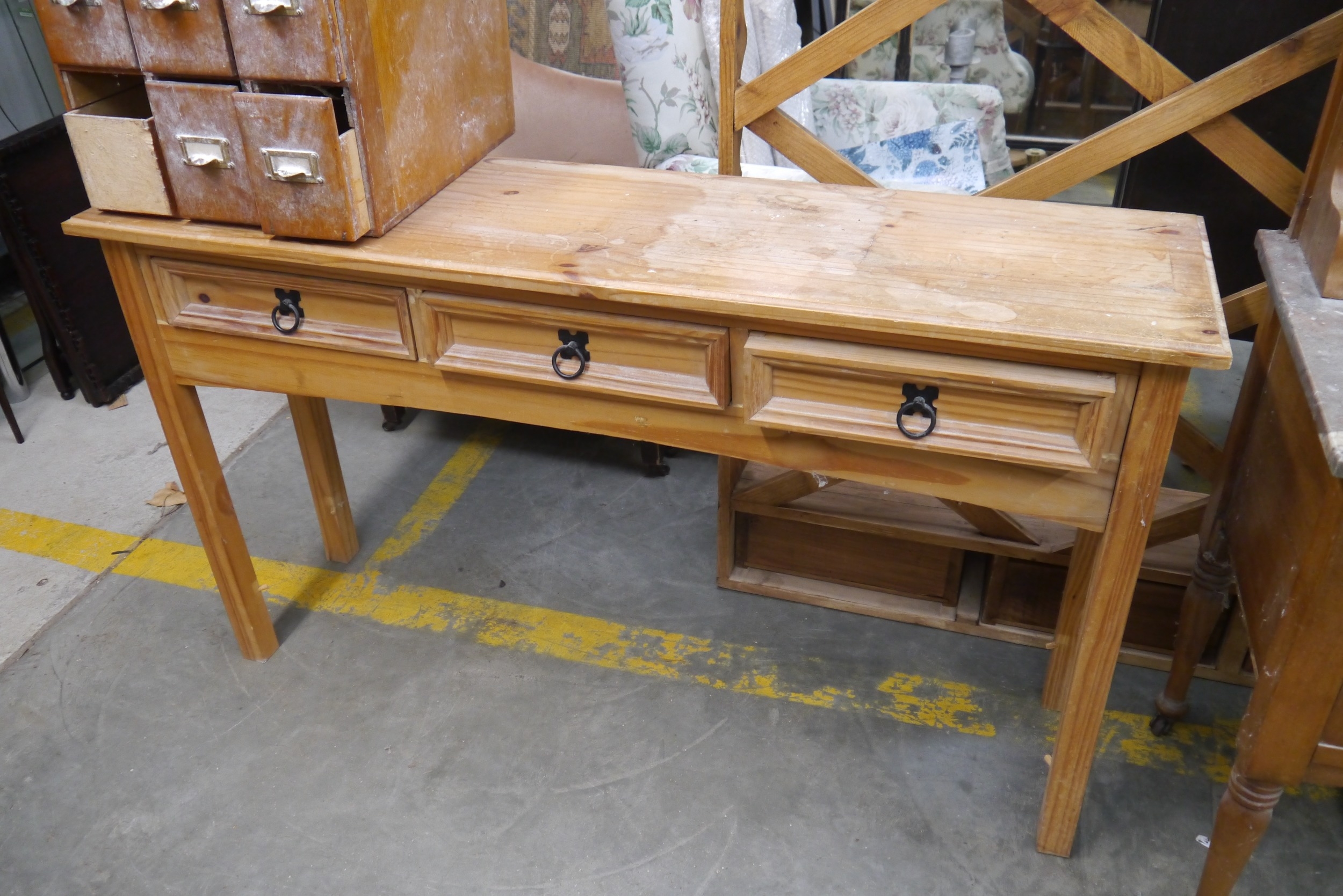 A Mexican pine three drawer side table
