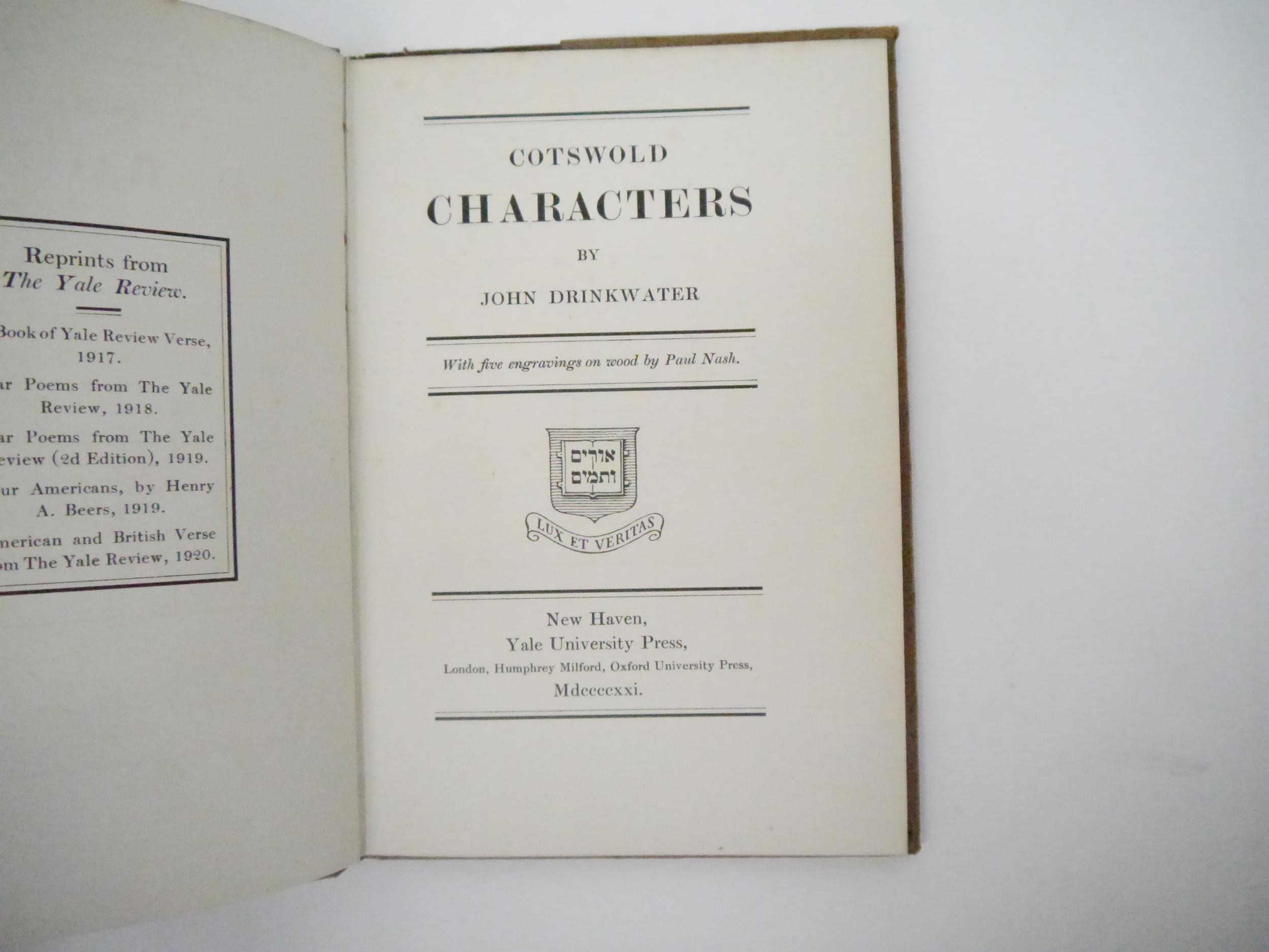 Paul Nash (ill.); John Drinkwater: 'Cotswold Characters', Yale University Press, New Haven, and Oxford University Press, London, 1921, 1st edition, five engravings on wood by Paul Nash complete, 54pp, original boards, printed paper label to front cover, dust wrapper ($1.40 price intact)