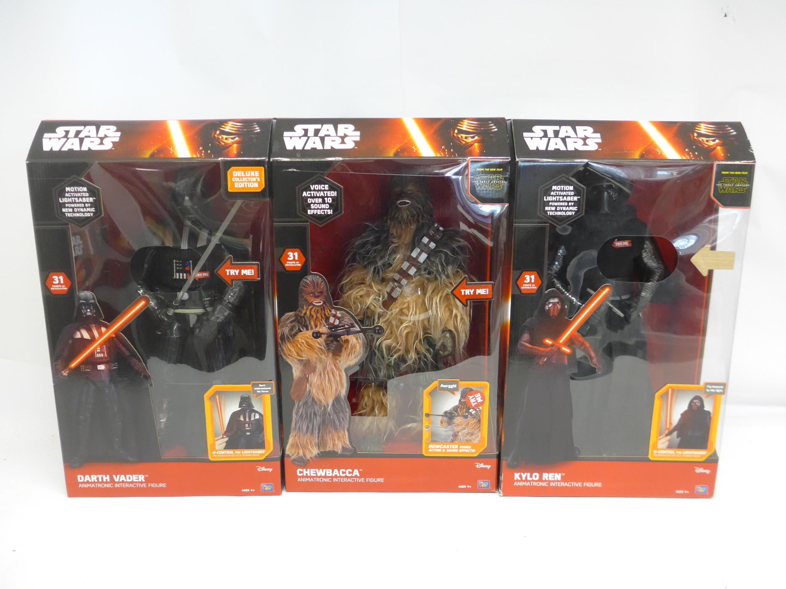 Three boxed Thinkway Toys Star Wars animatronic interactive figures to include Darth Vader, Chewbacca and Kylo Ren (3)