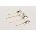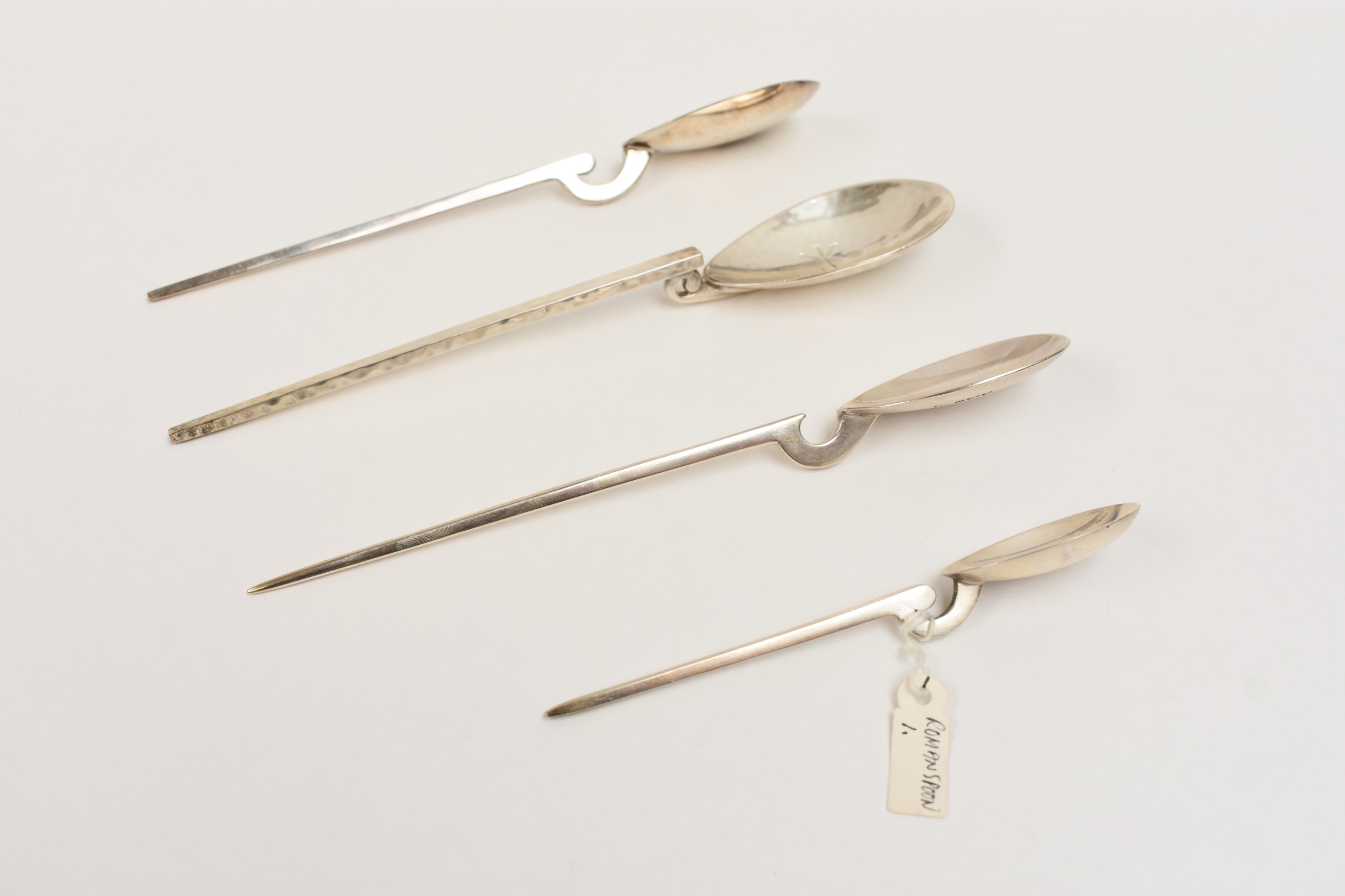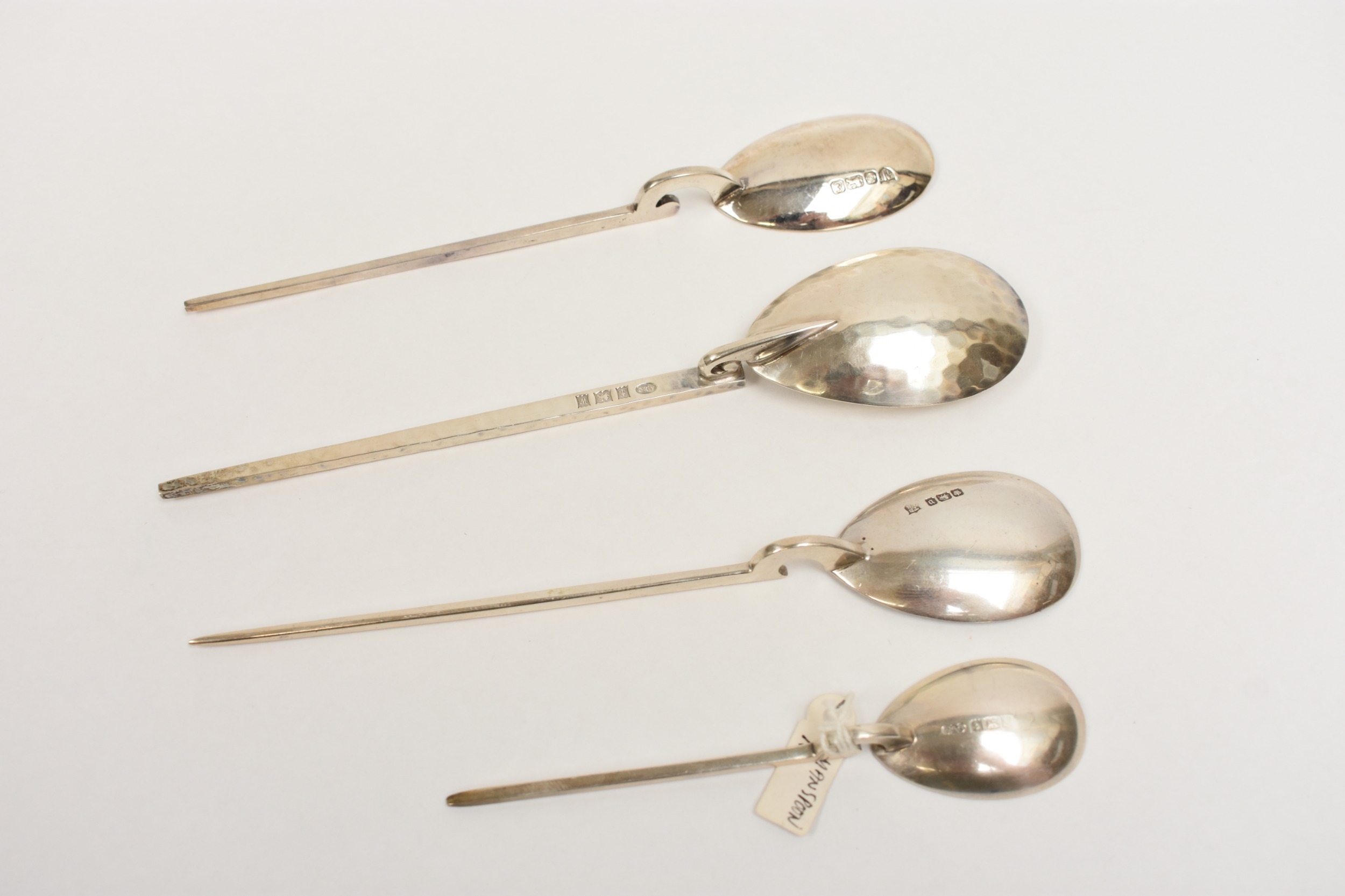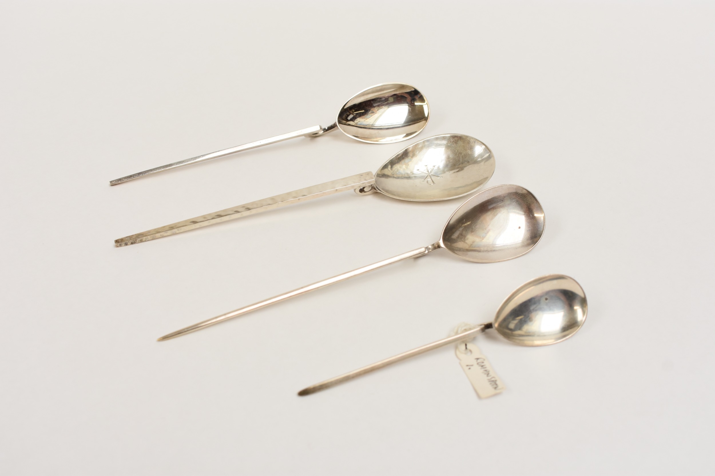 An Albert Edward Jones silver Roman style spoon, lightly hammered decoration, etched to bowl PX?, Birmingham 1971, 16.5cm long, a similar spoon by E.P Mallory and Son Ltd, Sheffield 1972, 15.5cm long and two others Thomas Bradbury and Sons Ltd, Sheffield 1978 and Turner and Simpson Ltd, Birmingham 1960's, 81.1g (4)