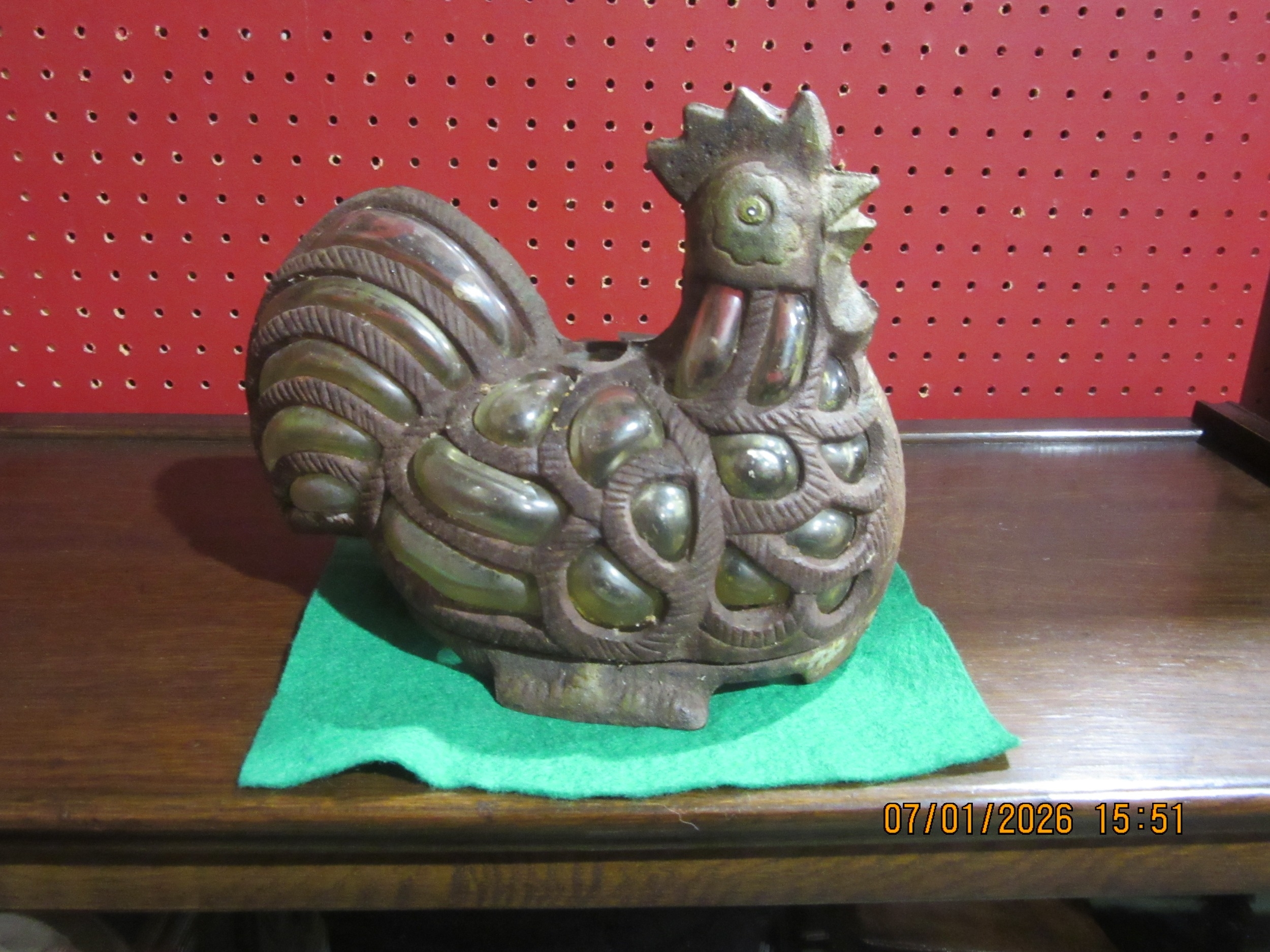 A cast iron and glass tealight in the form of a chicken