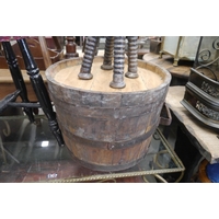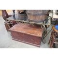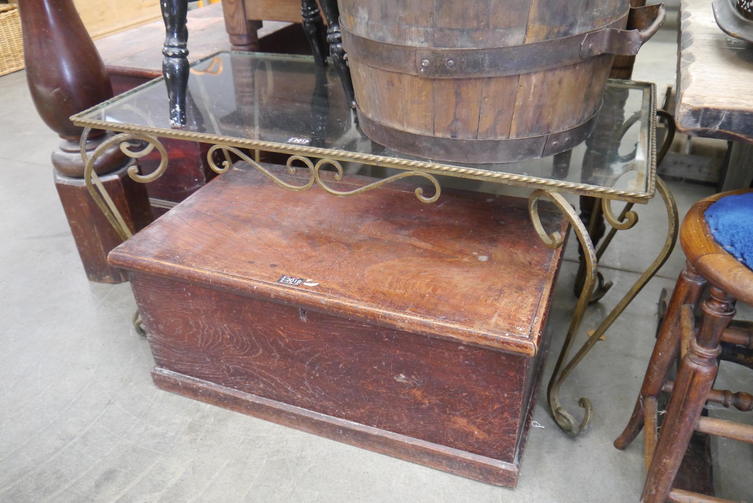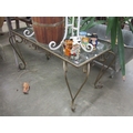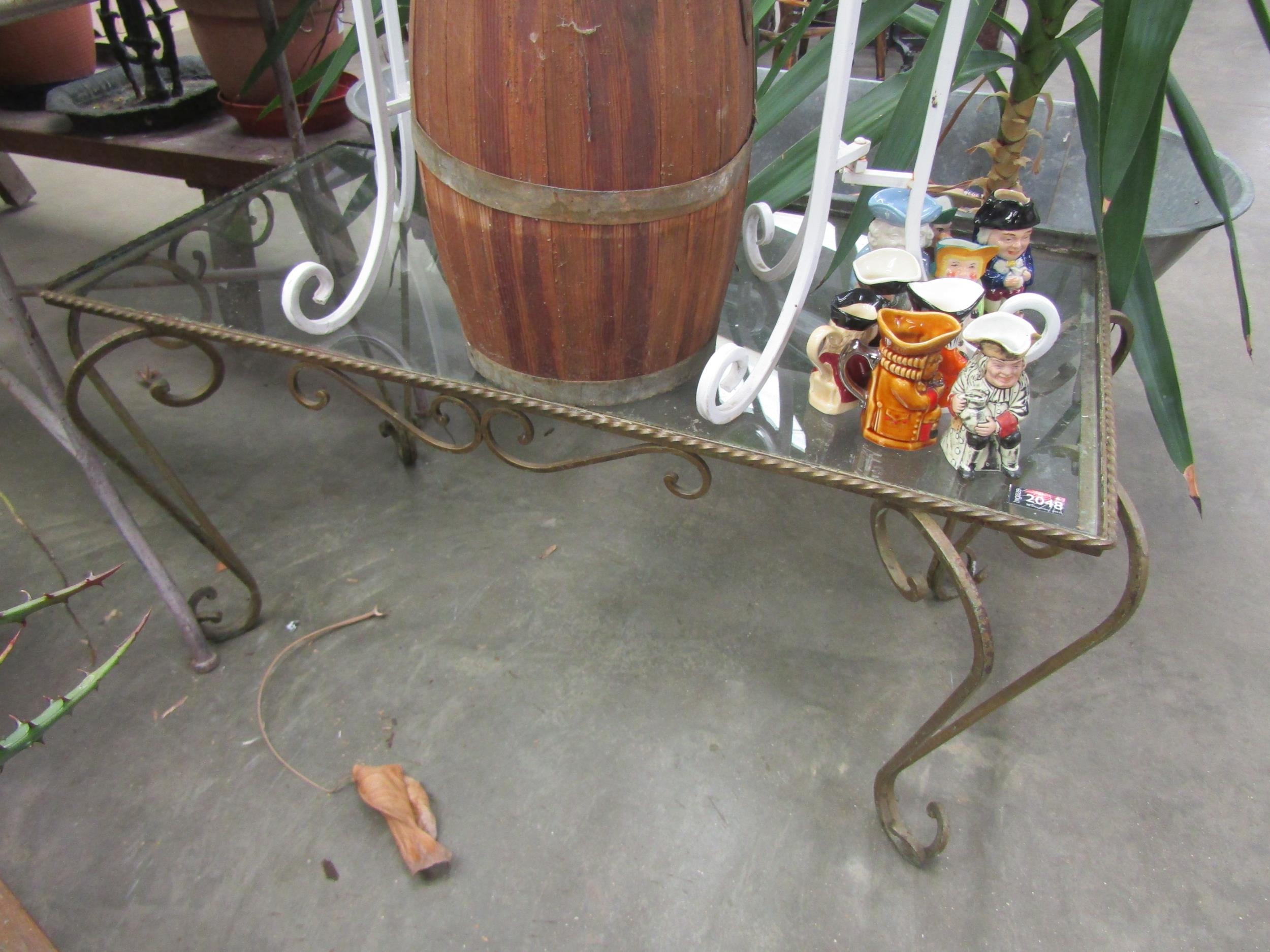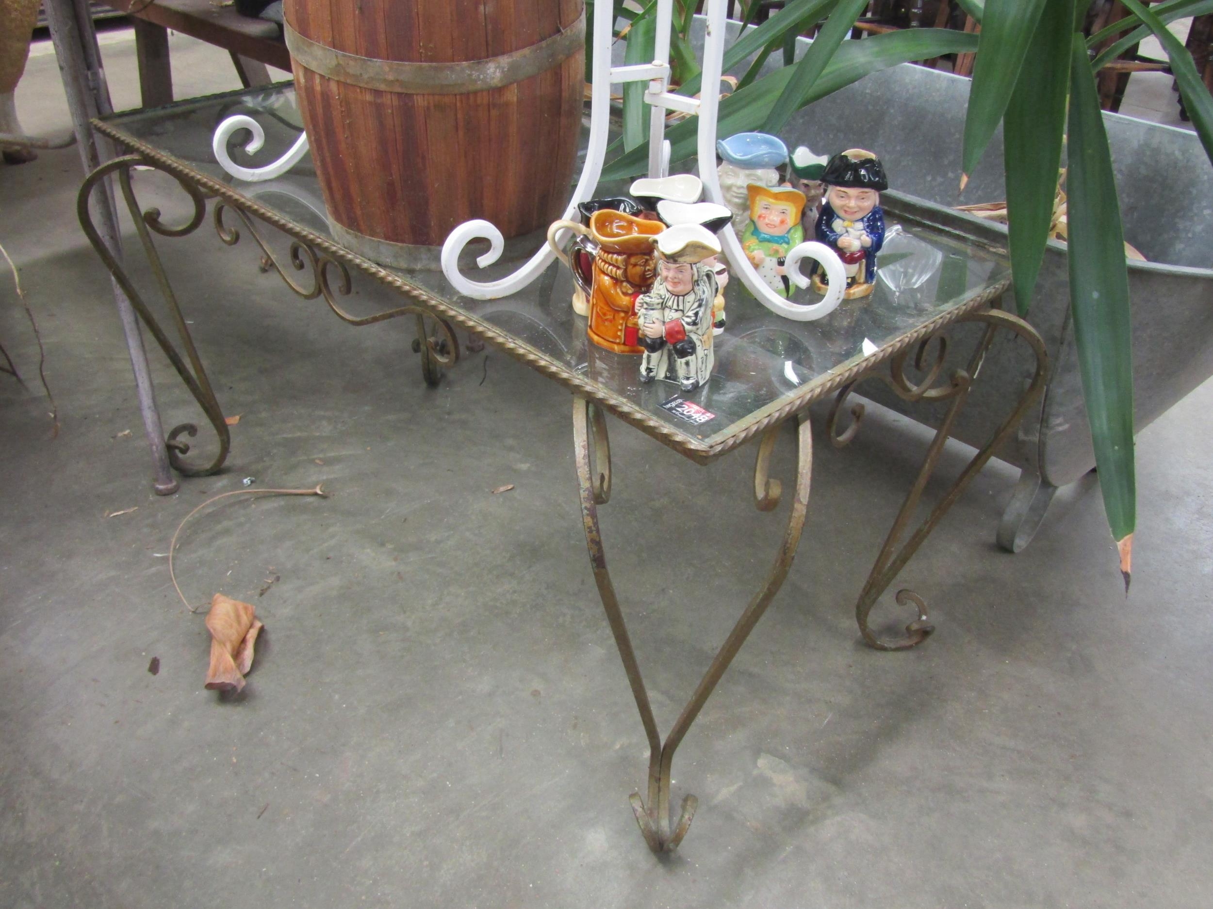 A wrought iron glass top coffee table
