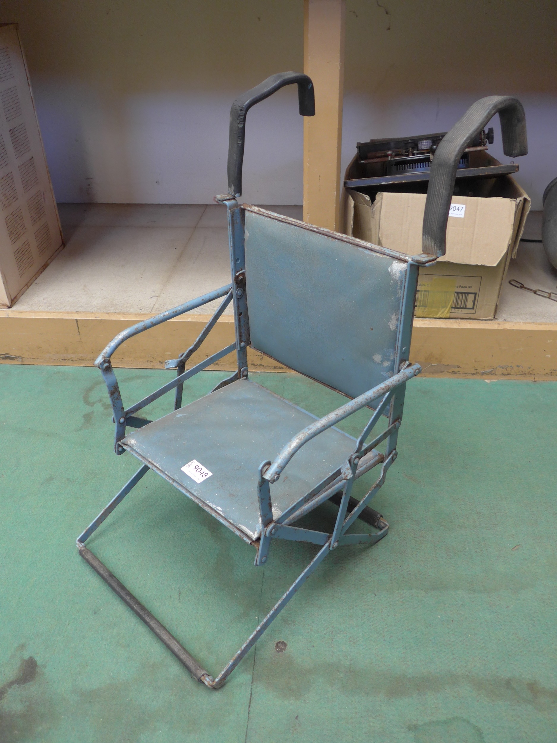 A metal folding childs chair