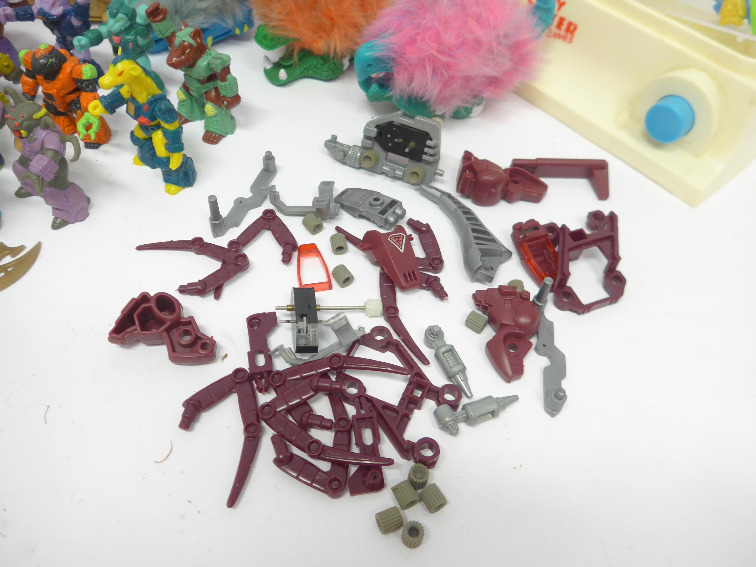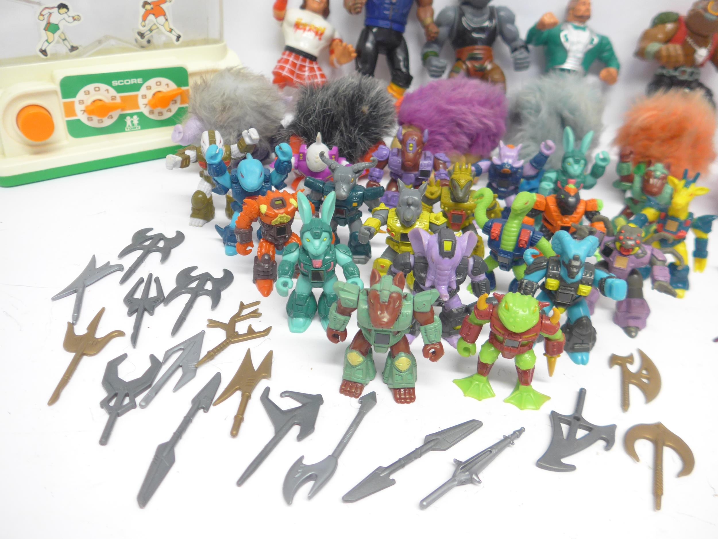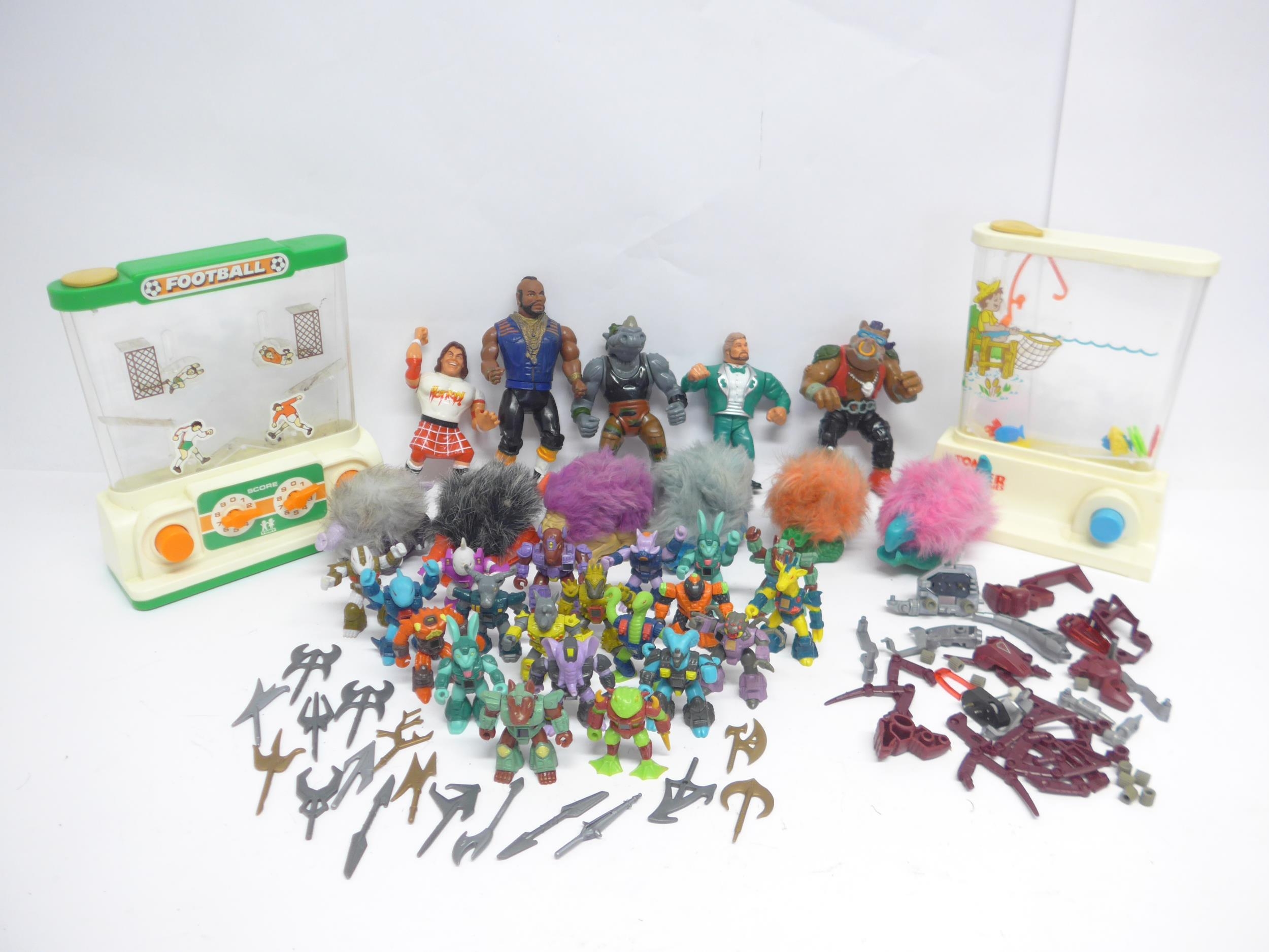 A collection of 1980s vintage action figures, toys and parts, including twenty Hasbro/Takara Battle Beasts figures and seventeen weapons, Bandai/Tonka Rock Lords Narlies, Hasbro WWF "Million Dollar Man" Ted Biase and Rowdy Roddy Piper wrestling figures, Galoob A-Team B.A. Baracas figure, Mirage/Playmates Teenage Mutant Ninja Turtles Bebop and Rocksteady figures, two Tomy Water Games, and a quantity of Tomy Zoids parts
