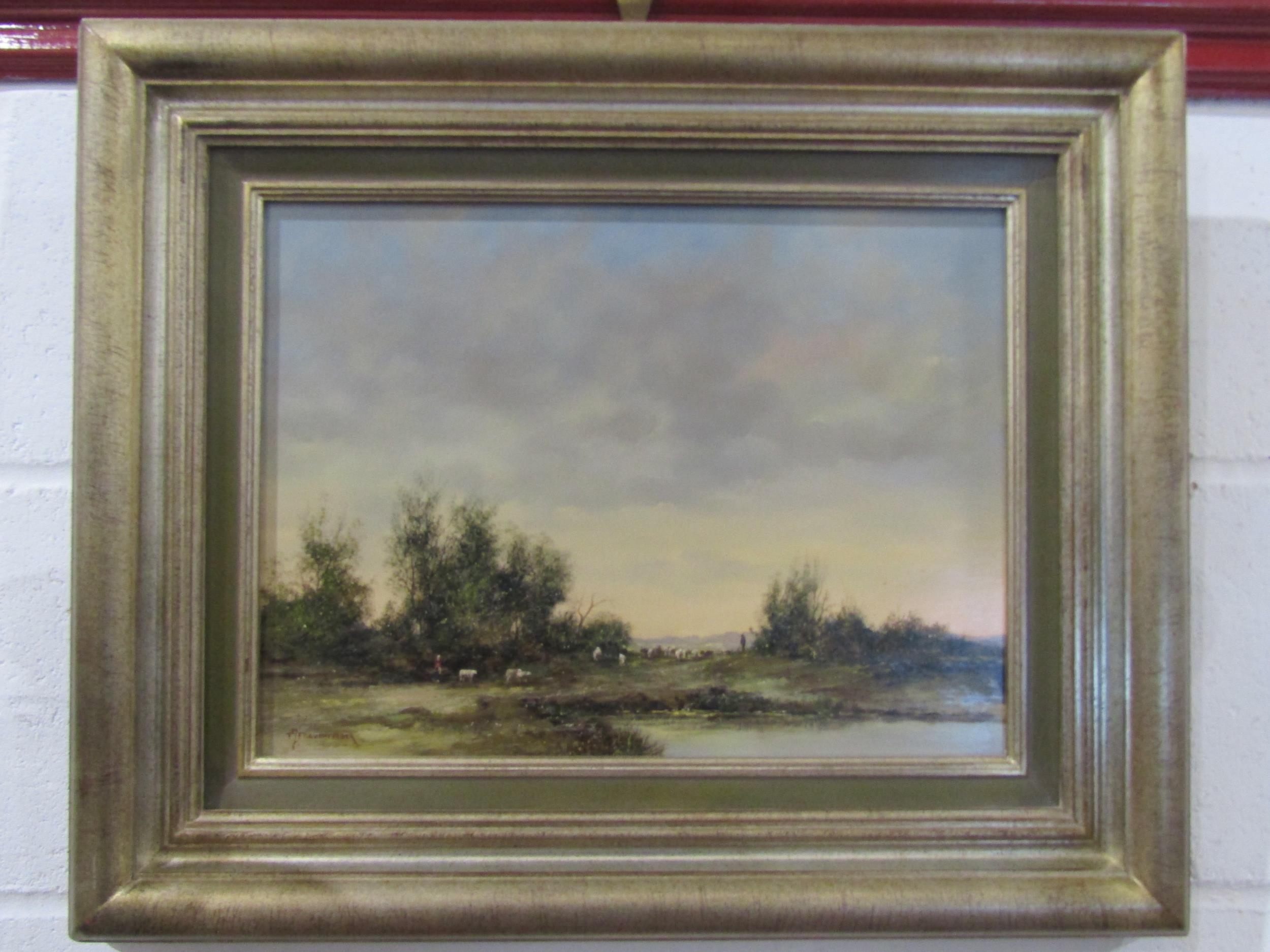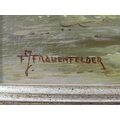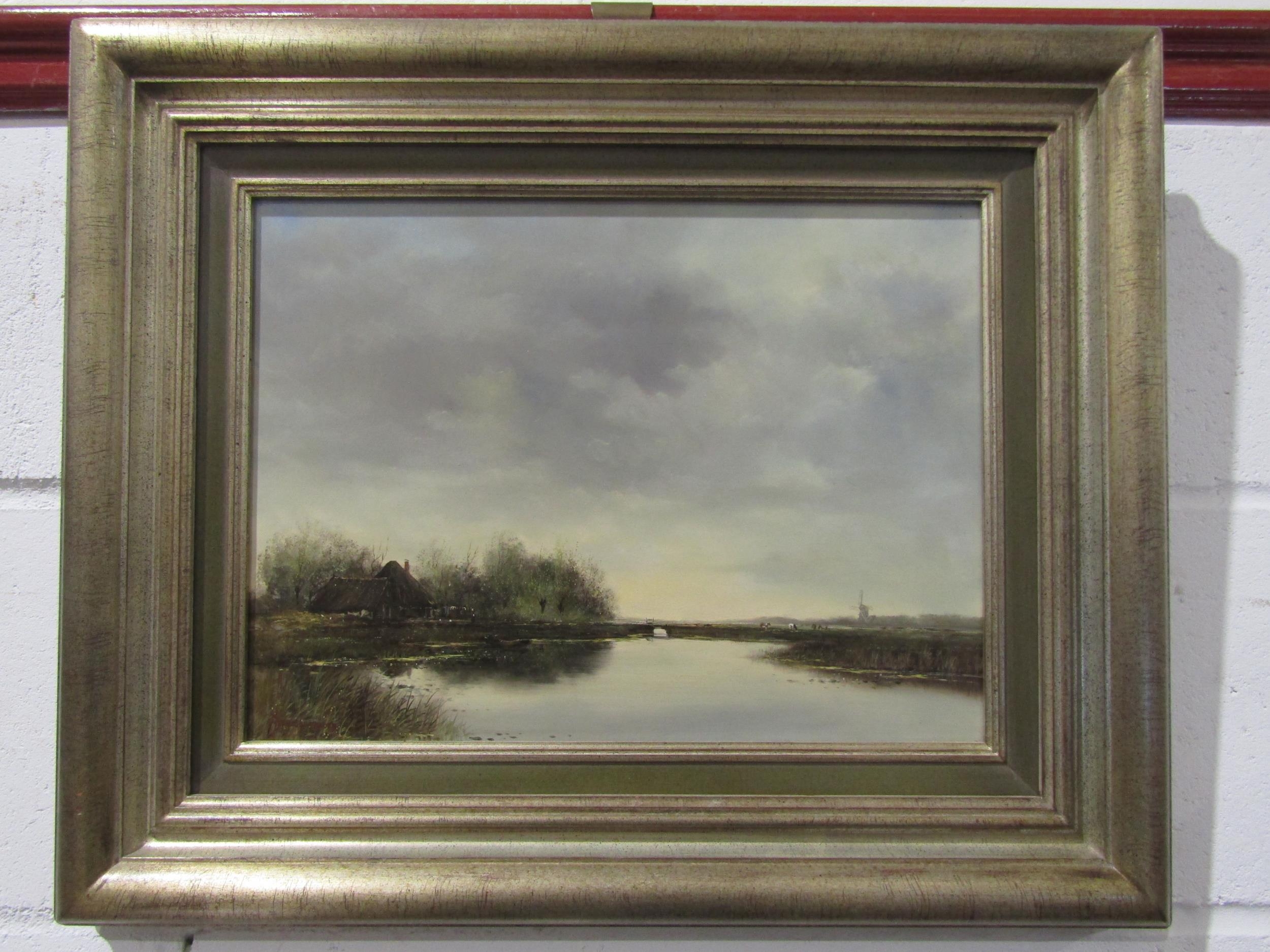 J FRAUENFELDER: A pair of oils on panel Dutch country scenes with sheep and windmill. Both signed lower left, framed. 28cm x 38.5cm image sizes