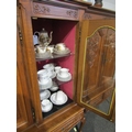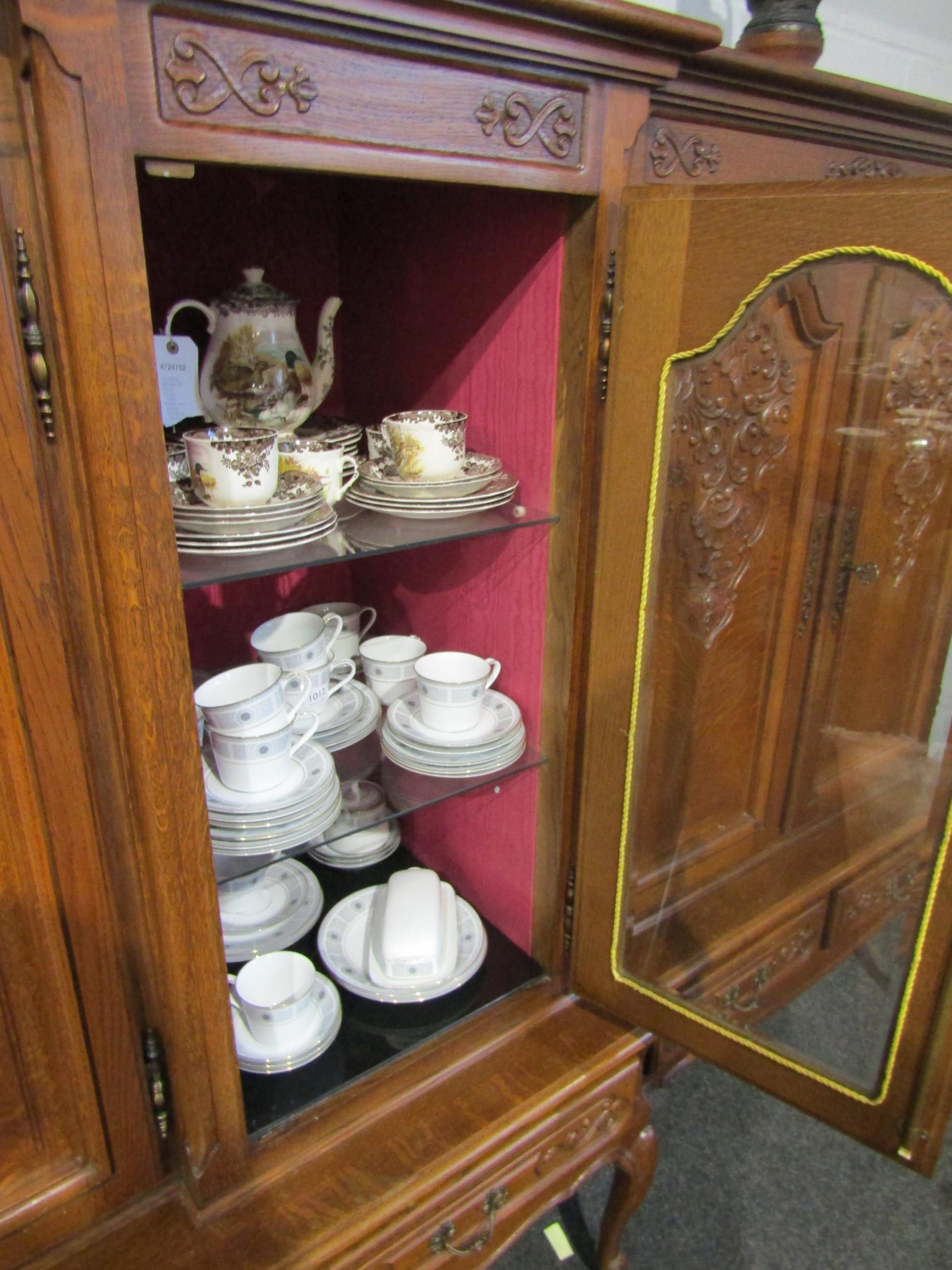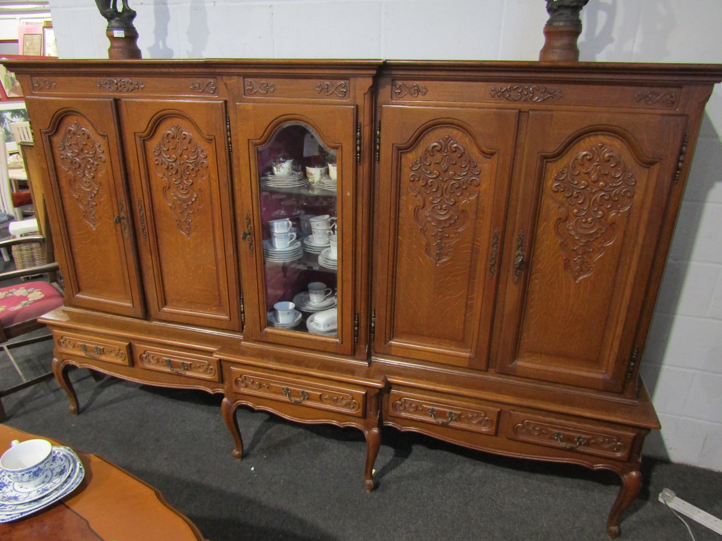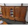 A large medium oak breakfront five door bookcase/cabinet with keys over a five drawer base on French cabriole leg supports, 160cm tall x 250cm wide x 58cm deep approximately