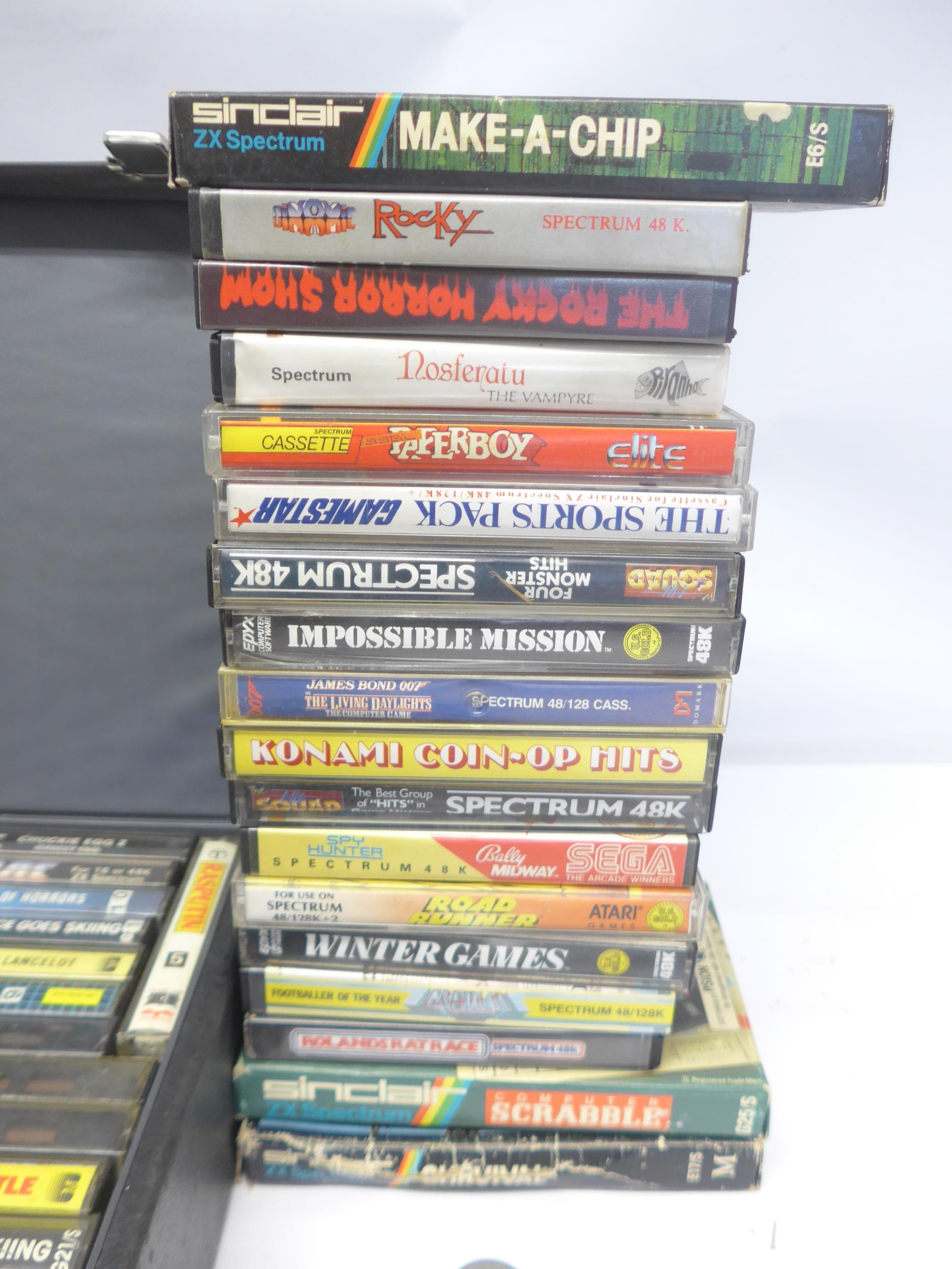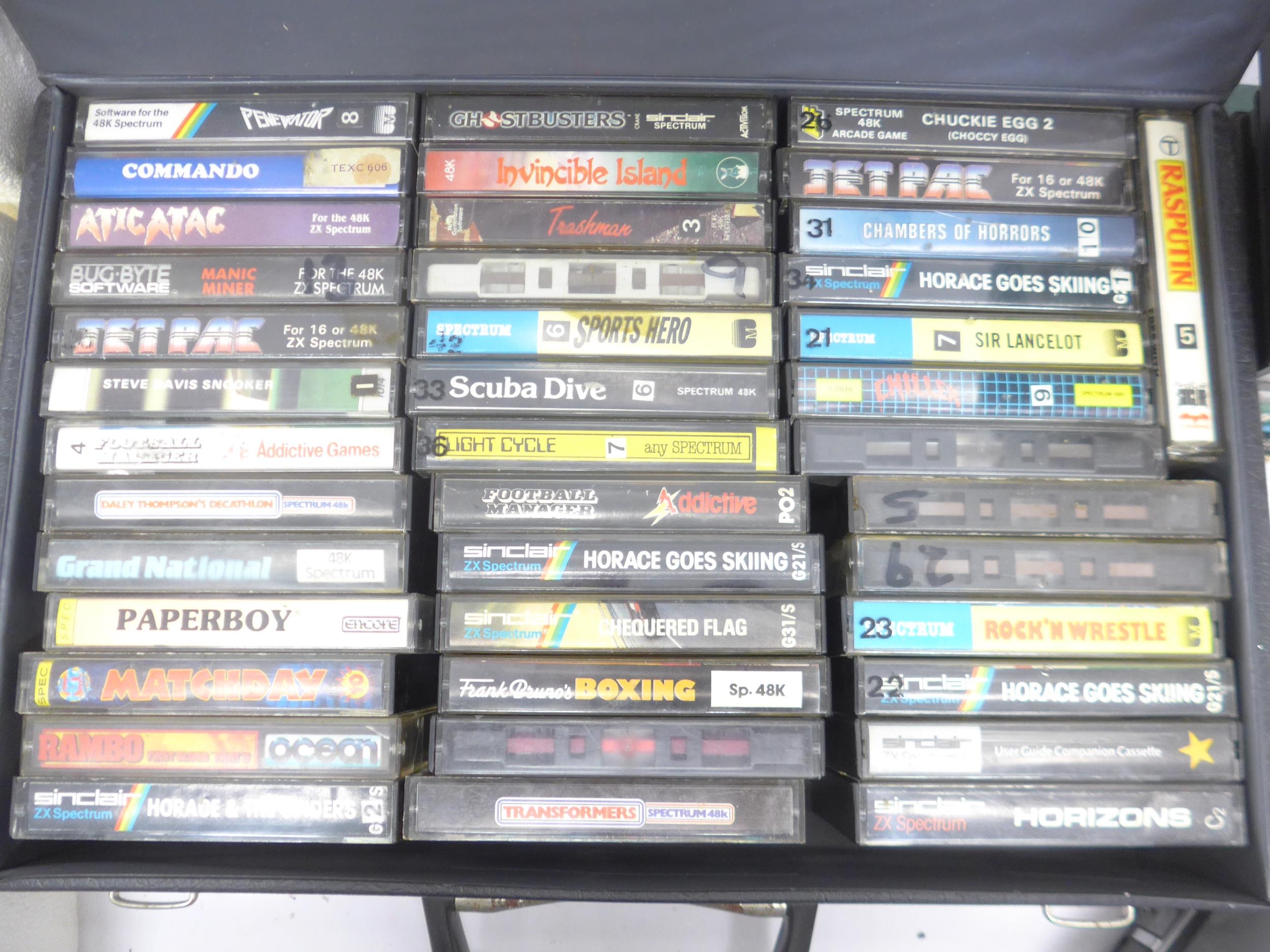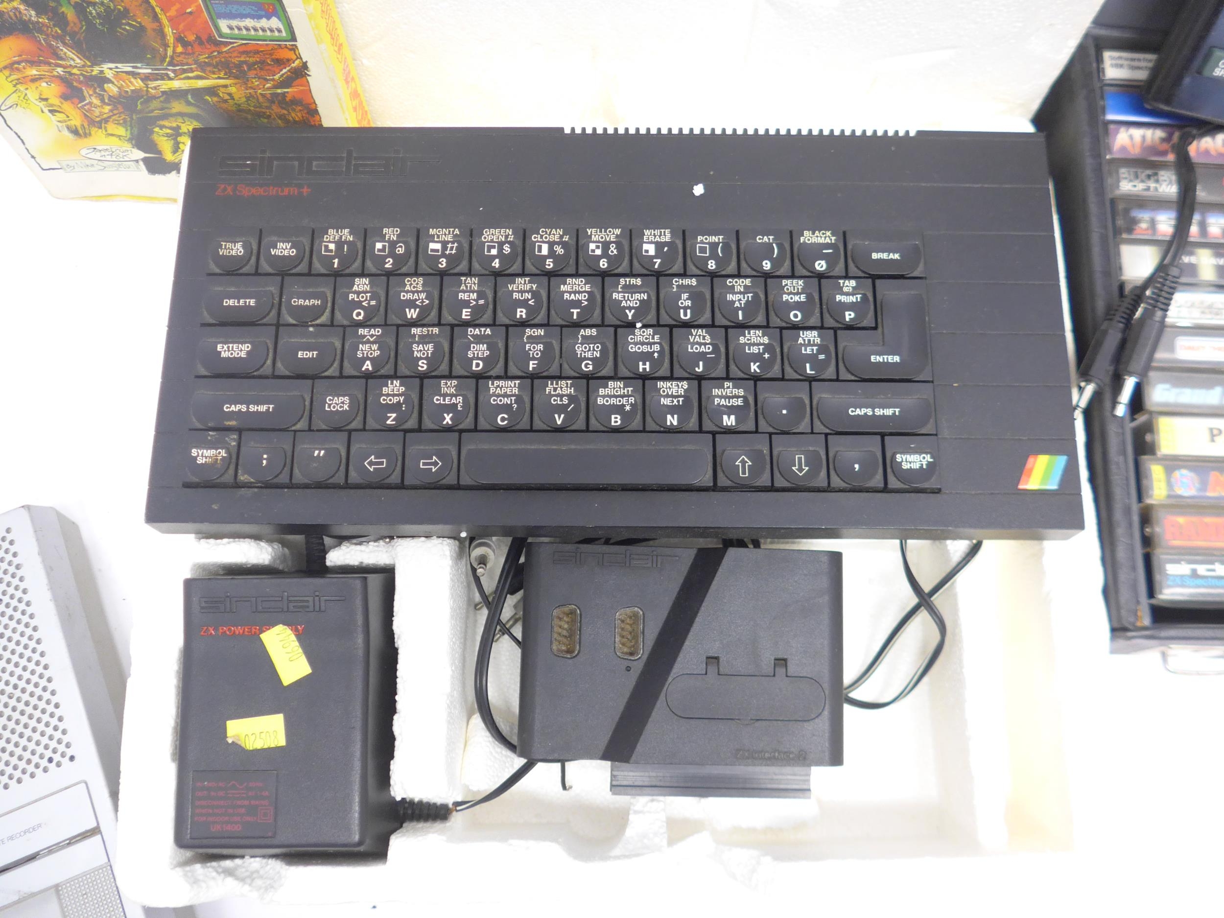 Retro Gaming - A boxed Sinclair Spectrum Plus personal computer and an unboxed ZX Spectrum 48K personal computer, with two cassette recorders and a collection of over fifty games