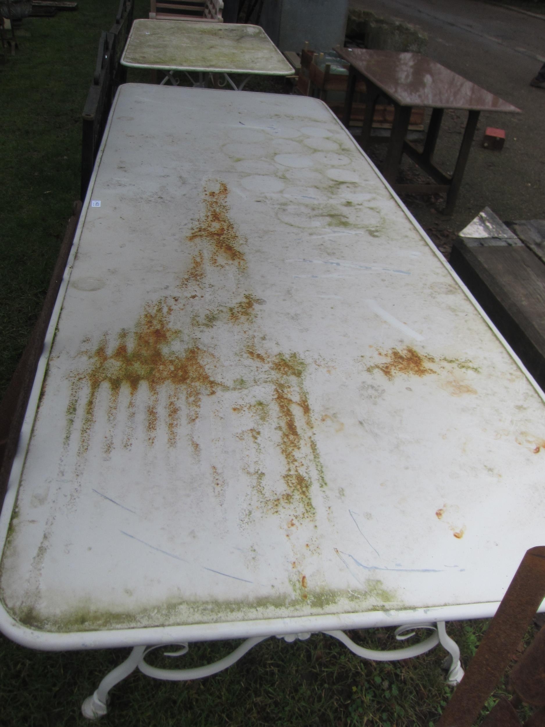 A large white painted metal French style garden banquet table, 91cm x 251cm long