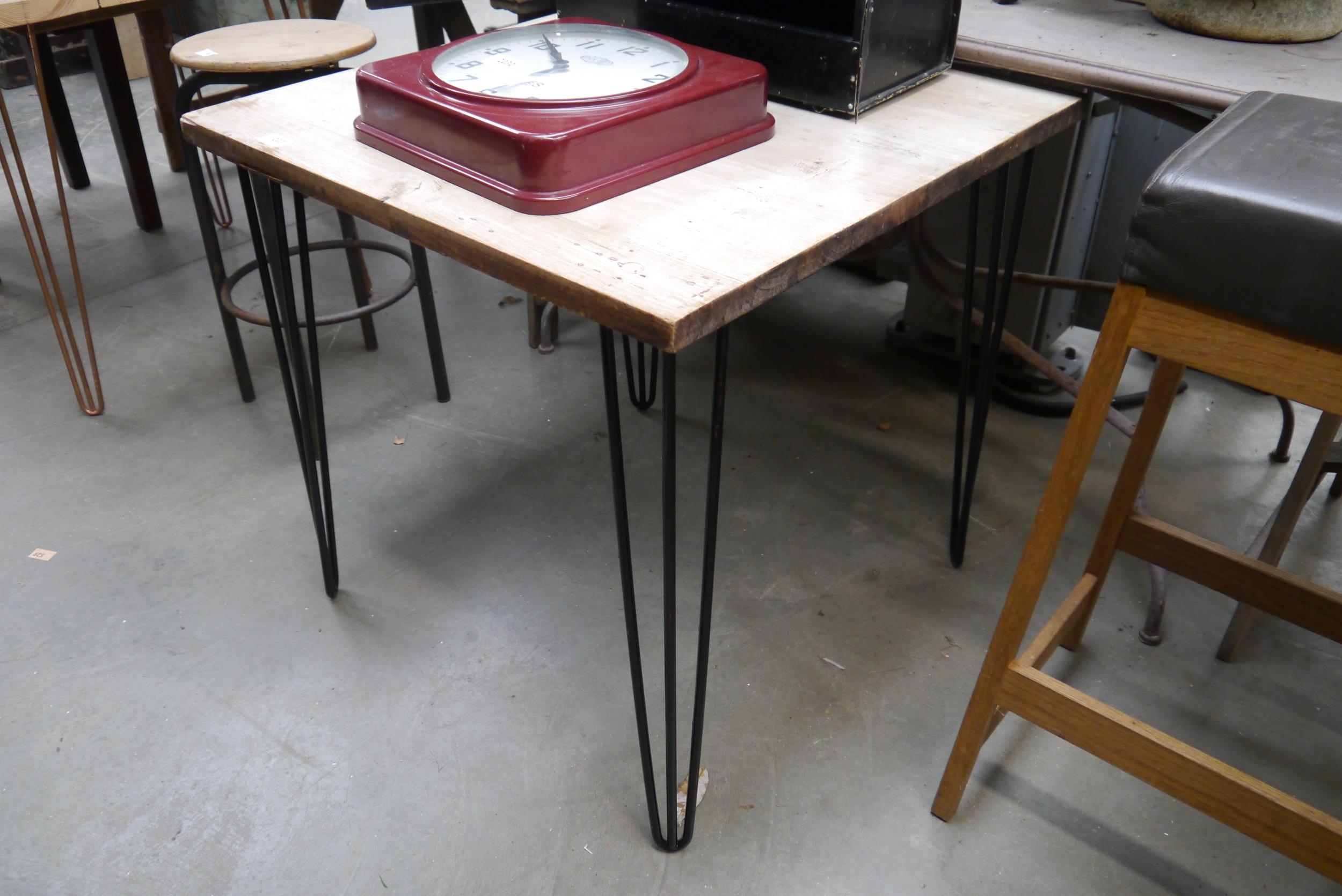 An oak café table on metal hair pin legs 2ft square