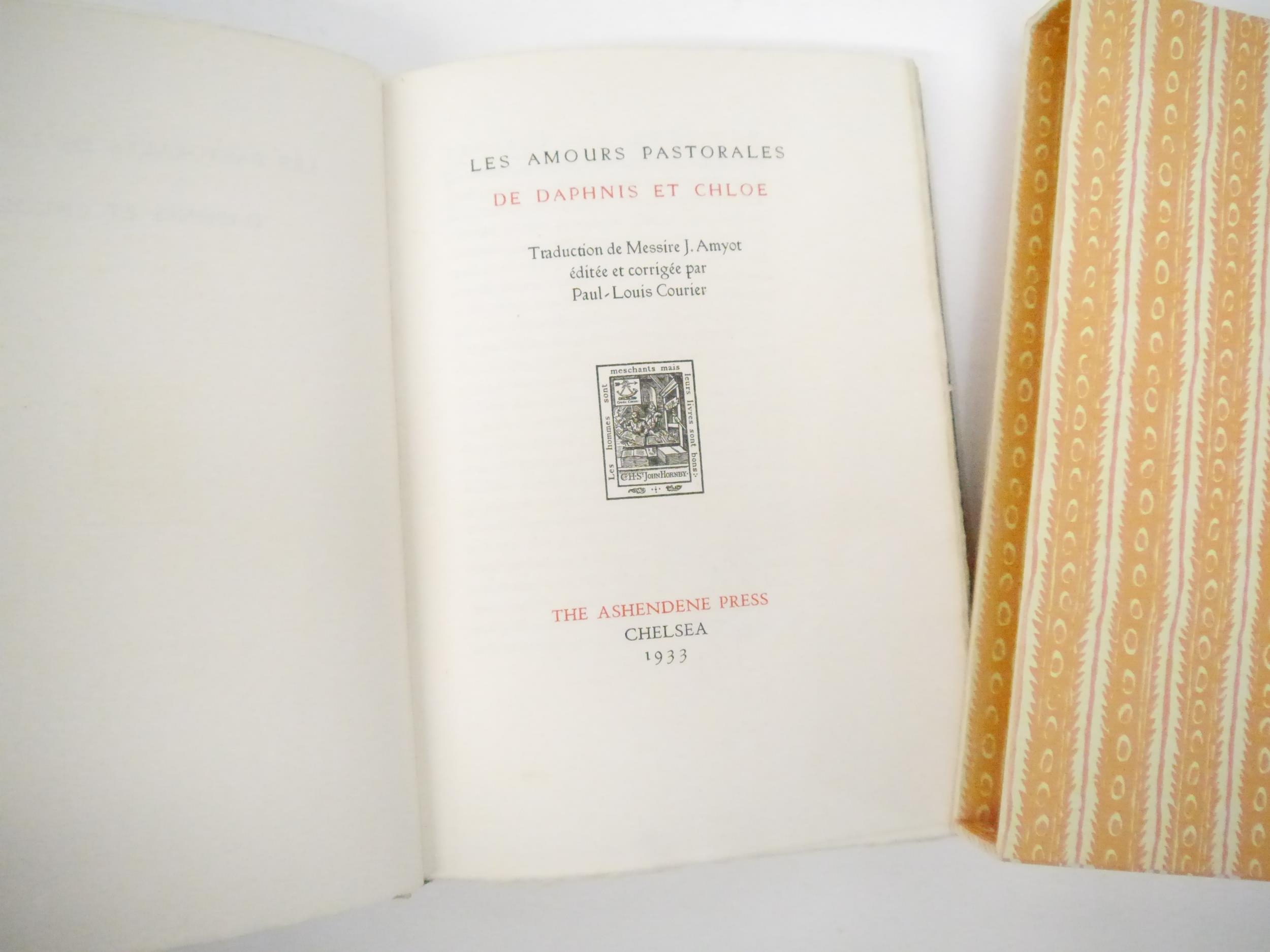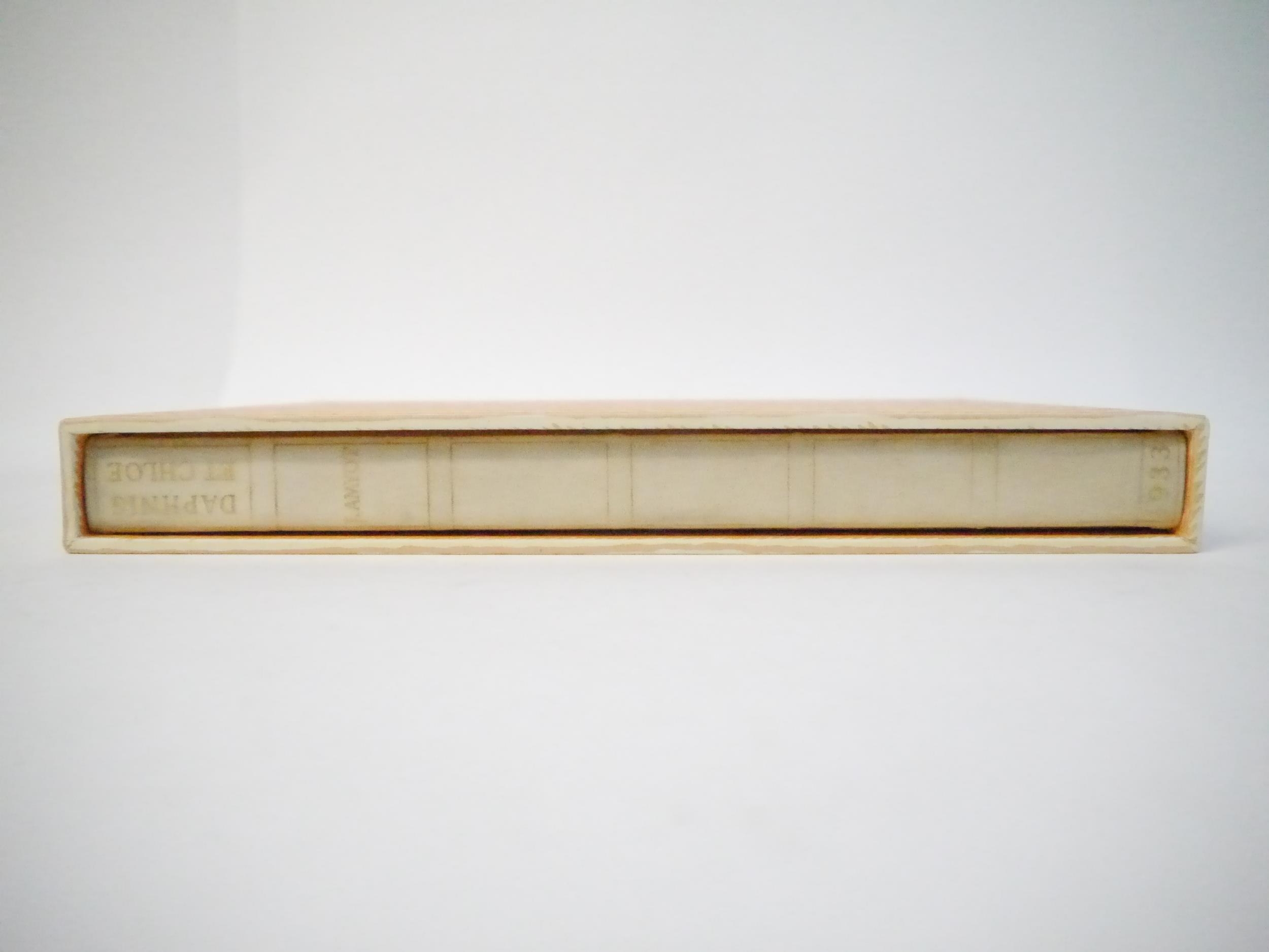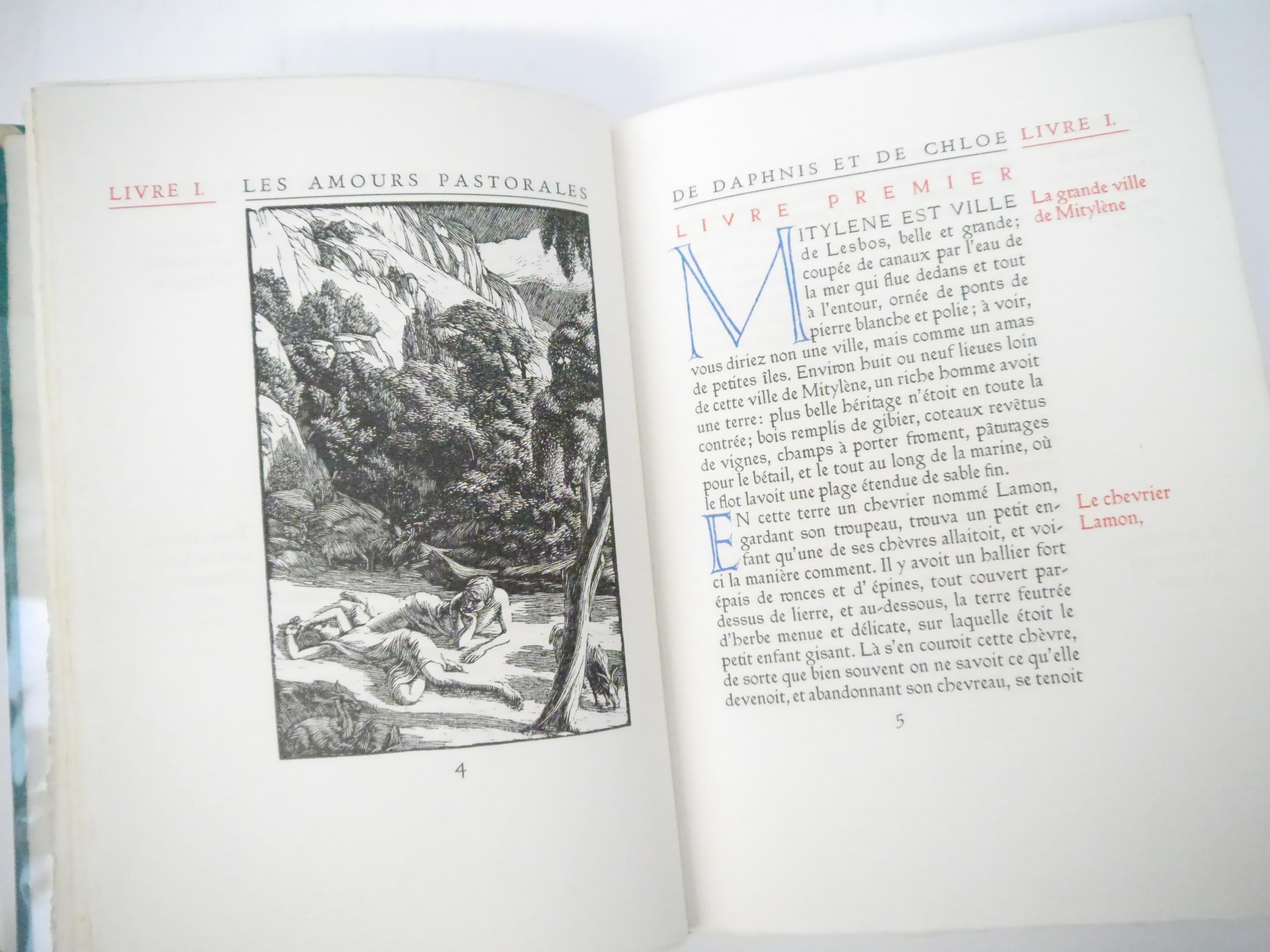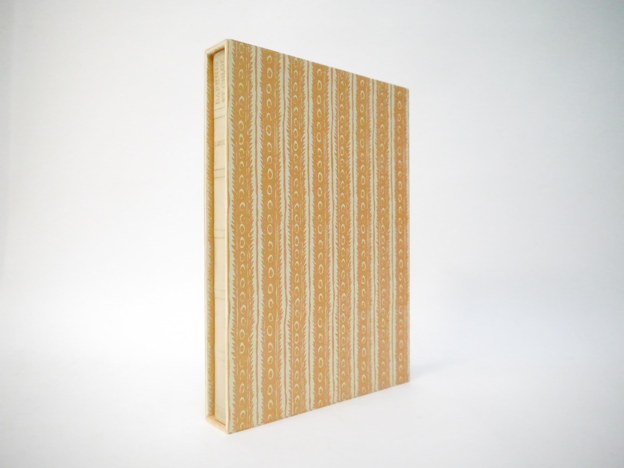 Ashendene Press. Gwendolen Raverat (ill.); Longus: 'Les Amours Pastorales de Daphnis et Chloe. Traduction de Messire J. Amyot editee et corrigee par Paul-Louis Courier', Chelsea, Ashendene Press, 1933, limited edition, one of 290 copies on hand made paper, printed in red and black in Ptolemy type, initials and decorations supplied by hand in blue by Graily Hewitt and his assistants, 26 illustrations drawn & cut on wood by Gwen Raverat, of which 4 full page, "imprimé par C. H. St. John Hornby sur sa presse a bras a Shelley House, Chelsea", [4],iv,164pp, 4to, original quarter vellum, lettered and ruled in gilt, turquoise paper covered boards with vellum corner-tips, circular gilt design by Gwen Raverat to centre of front cover. An excellent copy housed in a new well-made slipcase covered in the same patterned paper as the original. The penultimate book from The Ashendene Press. The Ashendene Daphnis et Chloe was intended for publication in 1931, but that edition was printed on Japanese vellum, and because the sheets were packed before the slow-drying ink had sufficiently hardened, all but 10 copies had to be destroyed. The whole edition was reprinted on English handmade paper by H.Gage-Cole, apprentice pressman to William Morris at the Kelmscott Press and pressman at the Doves Press.