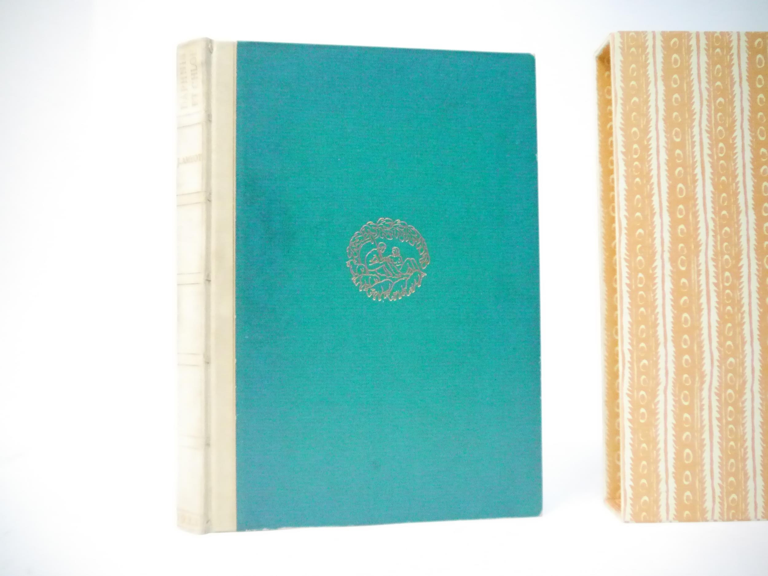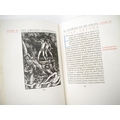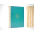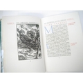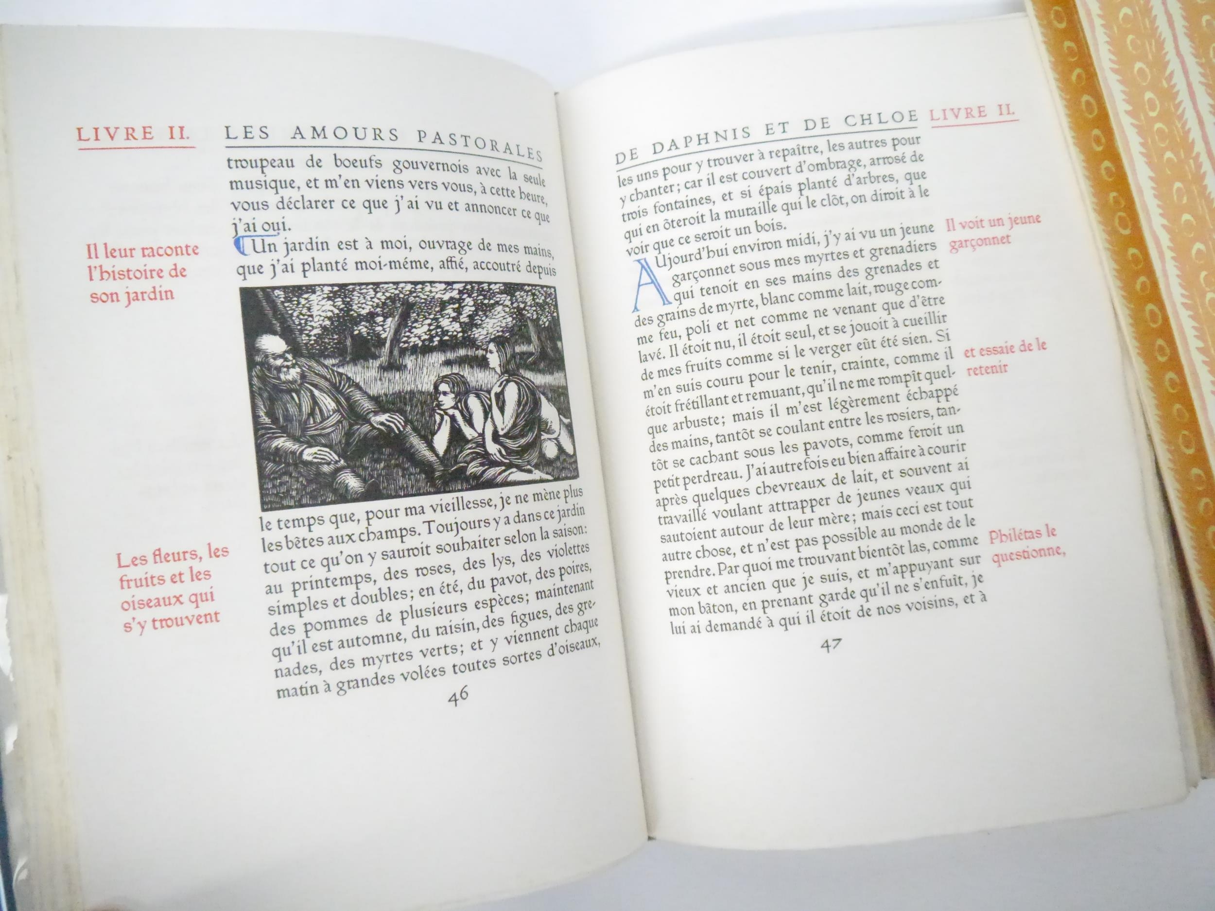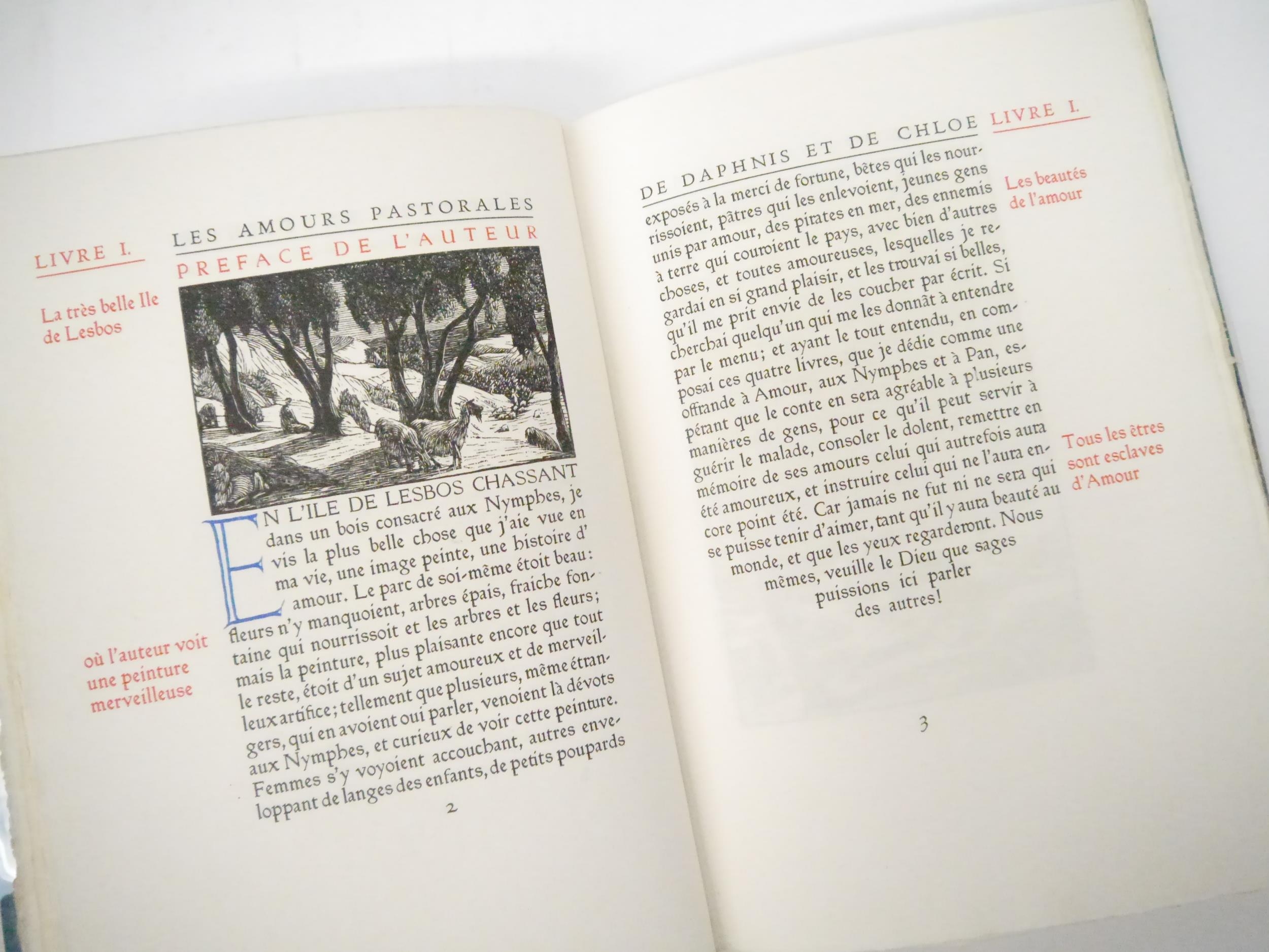 Ashendene Press. Gwendolen Raverat (ill.); Longus: 'Les Amours Pastorales de Daphnis et Chloe. Traduction de Messire J. Amyot editee et corrigee par Paul-Louis Courier', Chelsea, Ashendene Press, 1933, limited edition, one of 290 copies on hand made paper, printed in red and black in Ptolemy type, initials and decorations supplied by hand in blue by Graily Hewitt and his assistants, 26 illustrations drawn & cut on wood by Gwen Raverat, of which 4 full page, "imprimé par C. H. St. John Hornby sur sa presse a bras a Shelley House, Chelsea", [4],iv,164pp, 4to, original quarter vellum, lettered and ruled in gilt, turquoise paper covered boards with vellum corner-tips, circular gilt design by Gwen Raverat to centre of front cover. An excellent copy housed in a new well-made slipcase covered in the same patterned paper as the original. The penultimate book from The Ashendene Press. The Ashendene Daphnis et Chloe was intended for publication in 1931, but that edition was printed on Japanese vellum, and because the sheets were packed before the slow-drying ink had sufficiently hardened, all but 10 copies had to be destroyed. The whole edition was reprinted on English handmade paper by H.Gage-Cole, apprentice pressman to William Morris at the Kelmscott Press and pressman at the Doves Press.