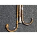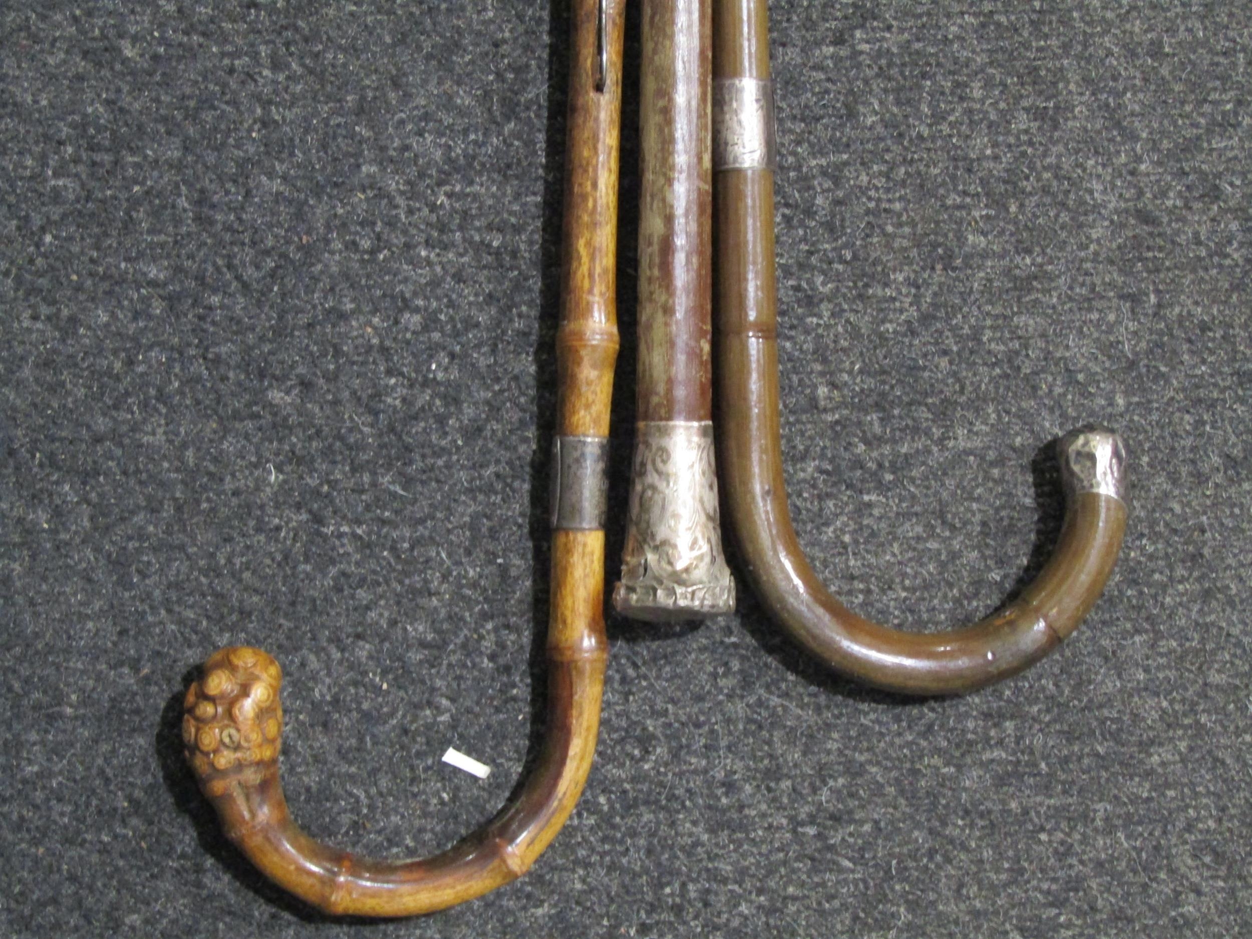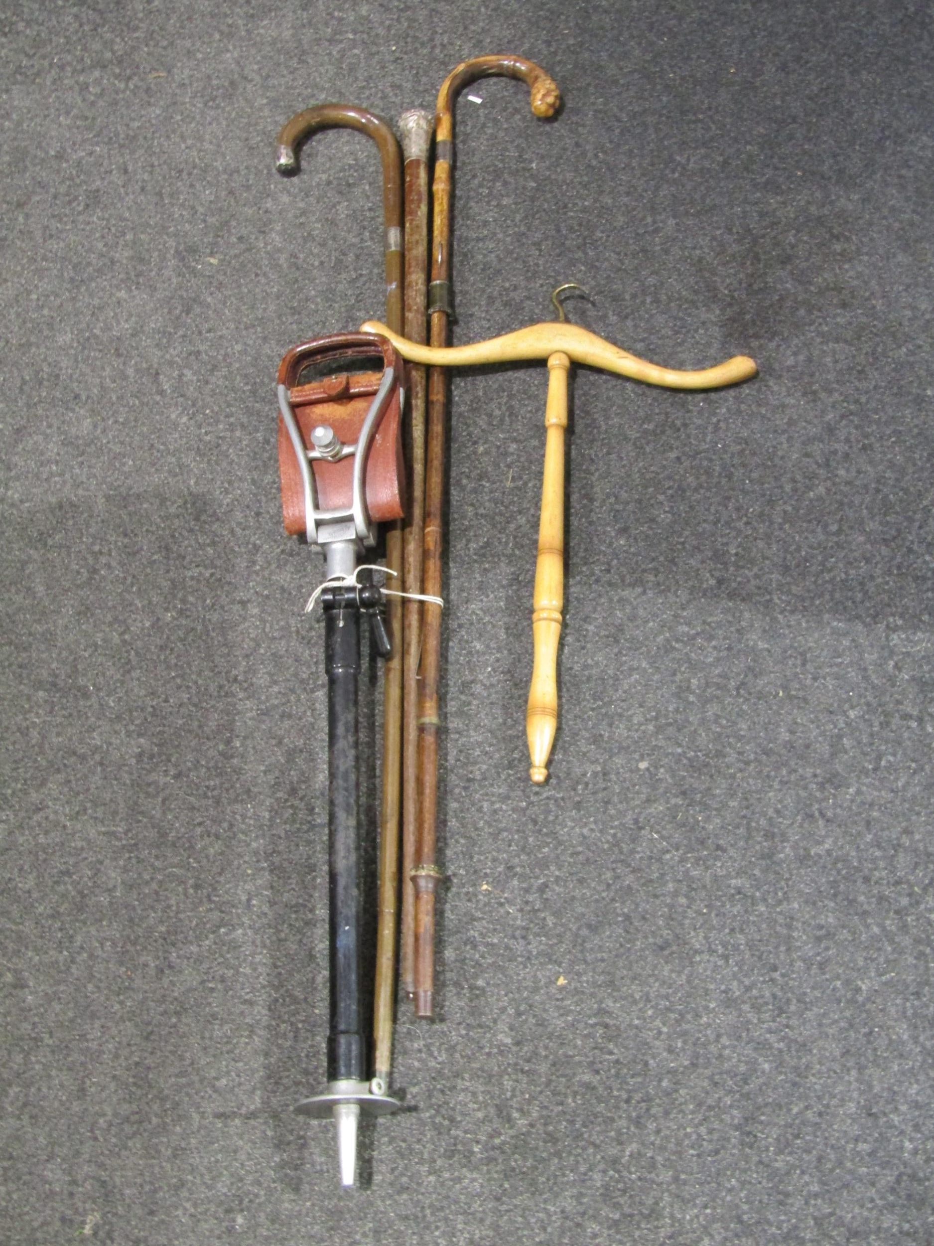 A bundle of walking sticks with shooting stick and hanger, two with silver handles and bands (5)