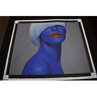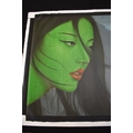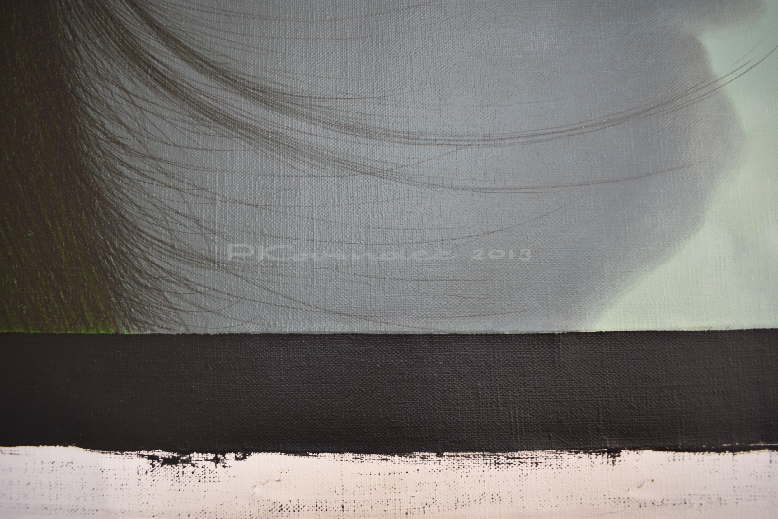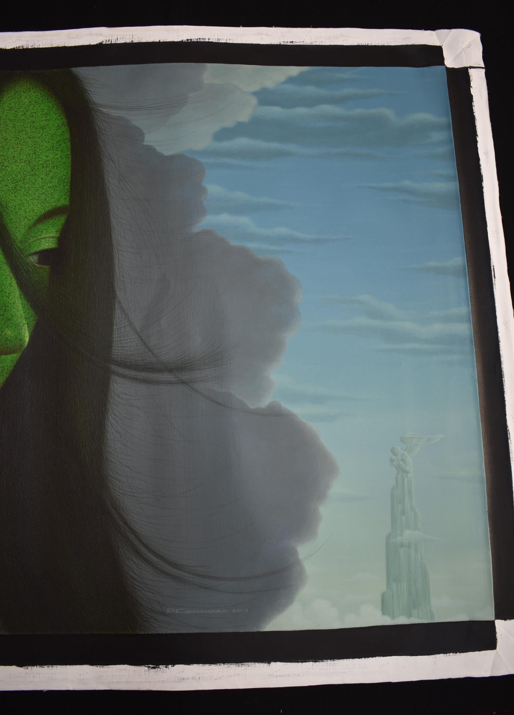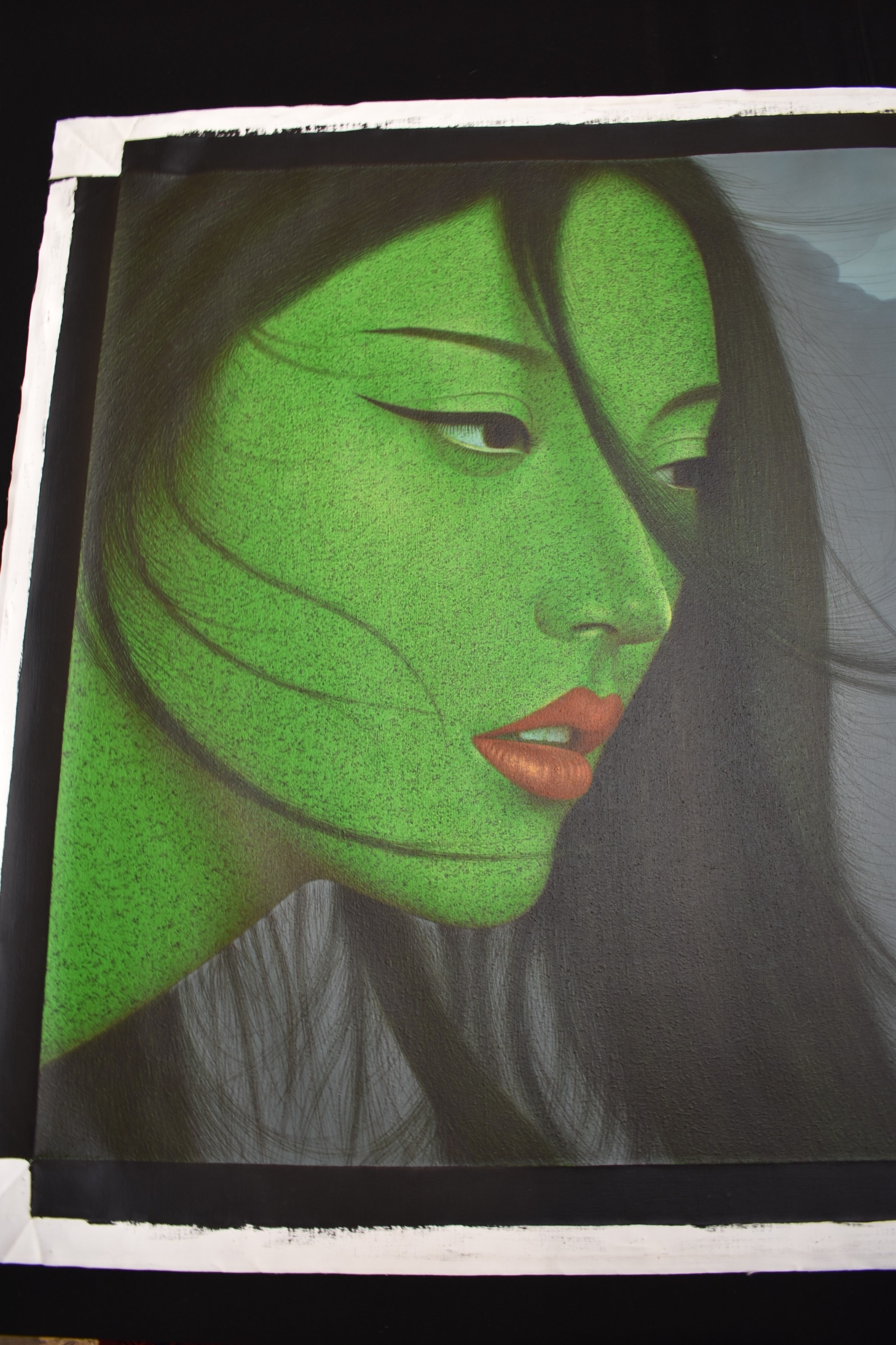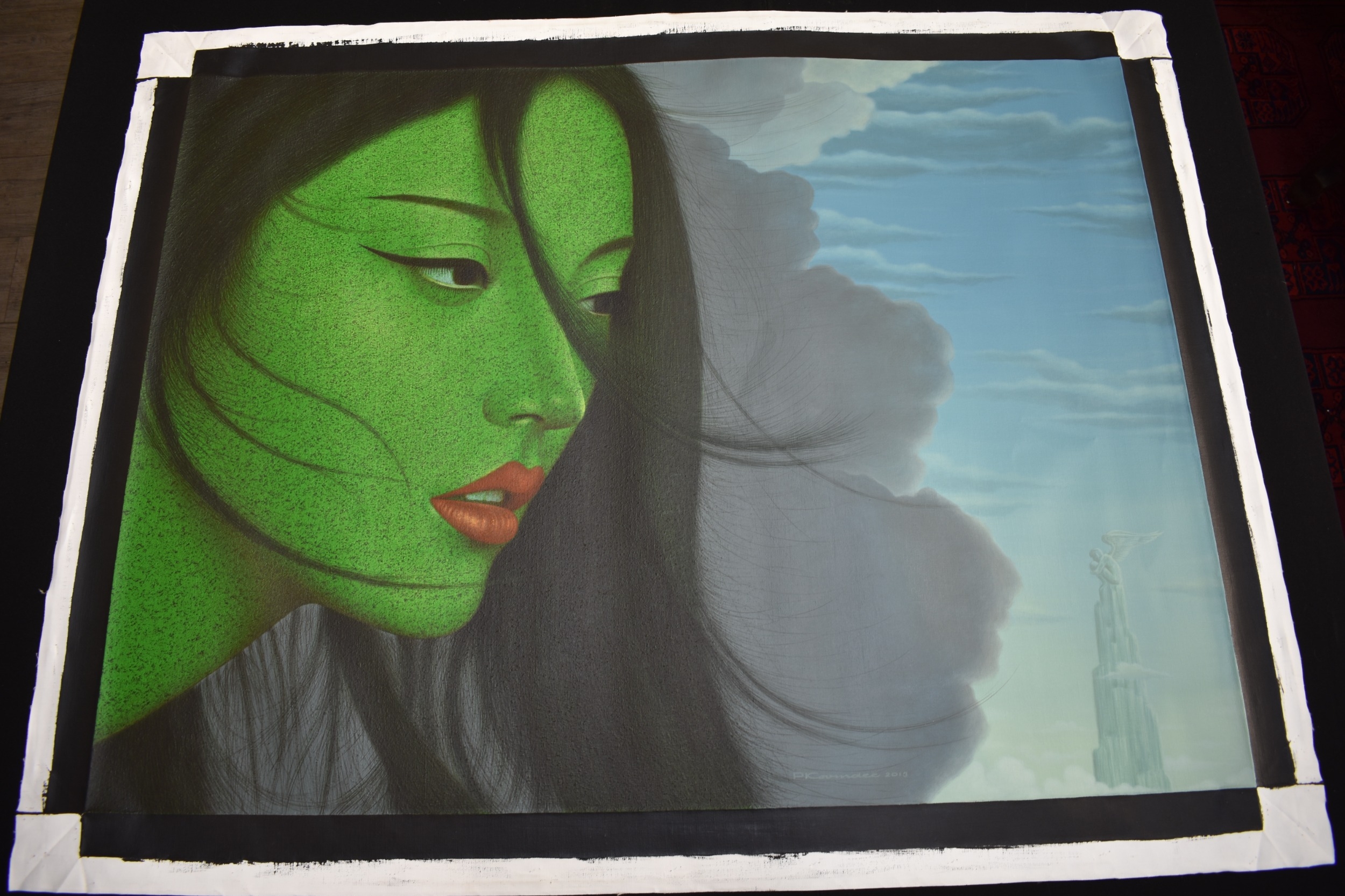 PAIROJ KARNDEE Thai Contemporary Artist: Female portrait, untitled side profile of Angel in clouds with crouched Angel on summit top to background, green tonal skin, acrylic on canvas. The artist has been influenced by the mysterious Apsaras - the celestial maidens of ancient Asian culture depicted in the galleries of Cambodia's Angkor Wat. His techniques painstakingly recreate the stone textures of those images with a time-consuming rendering of acrylic on linen canvas. His figures show a notable range of emotions. Signed and dated, 2013, image size 89.5cm x 119cm