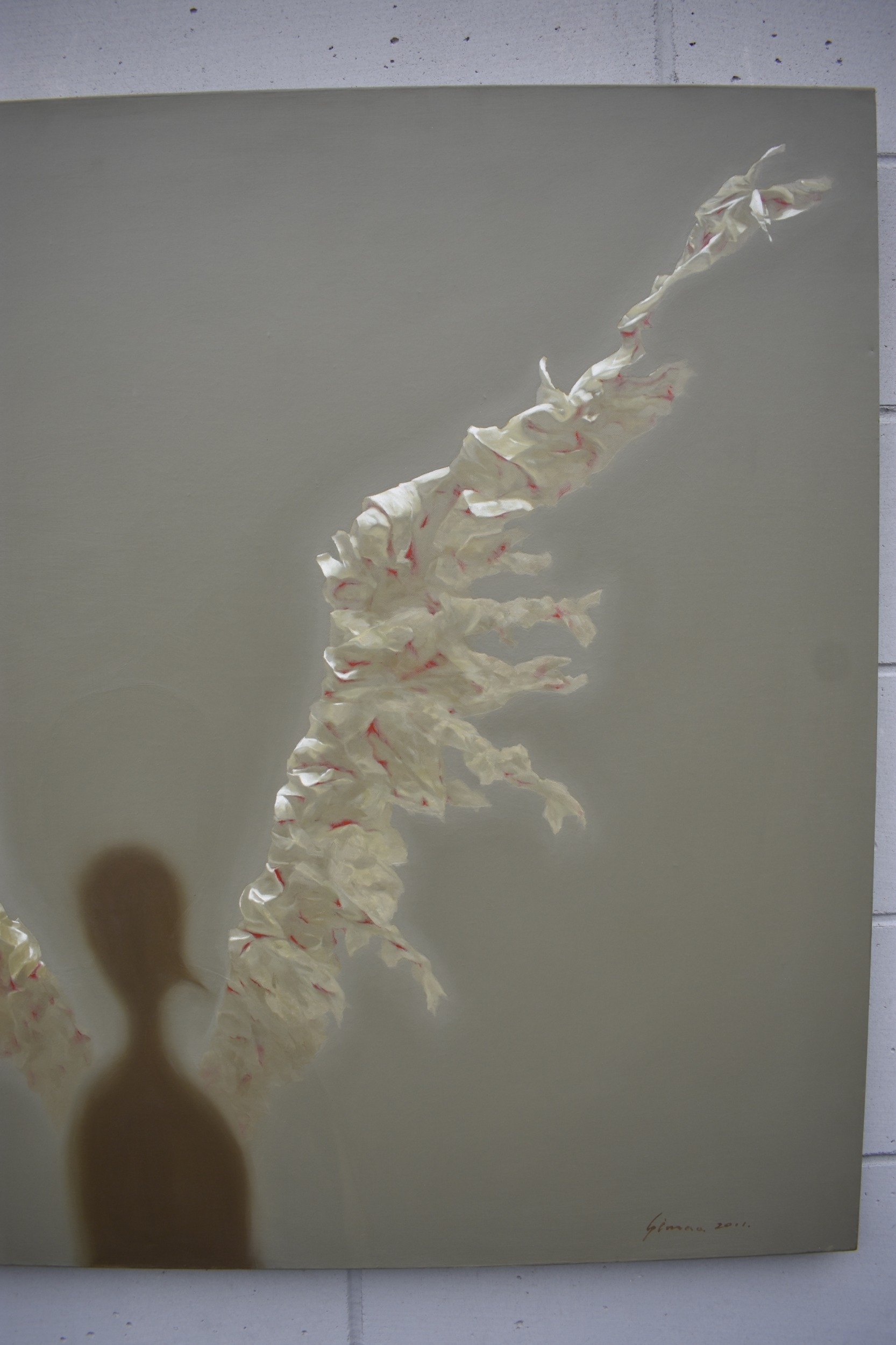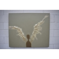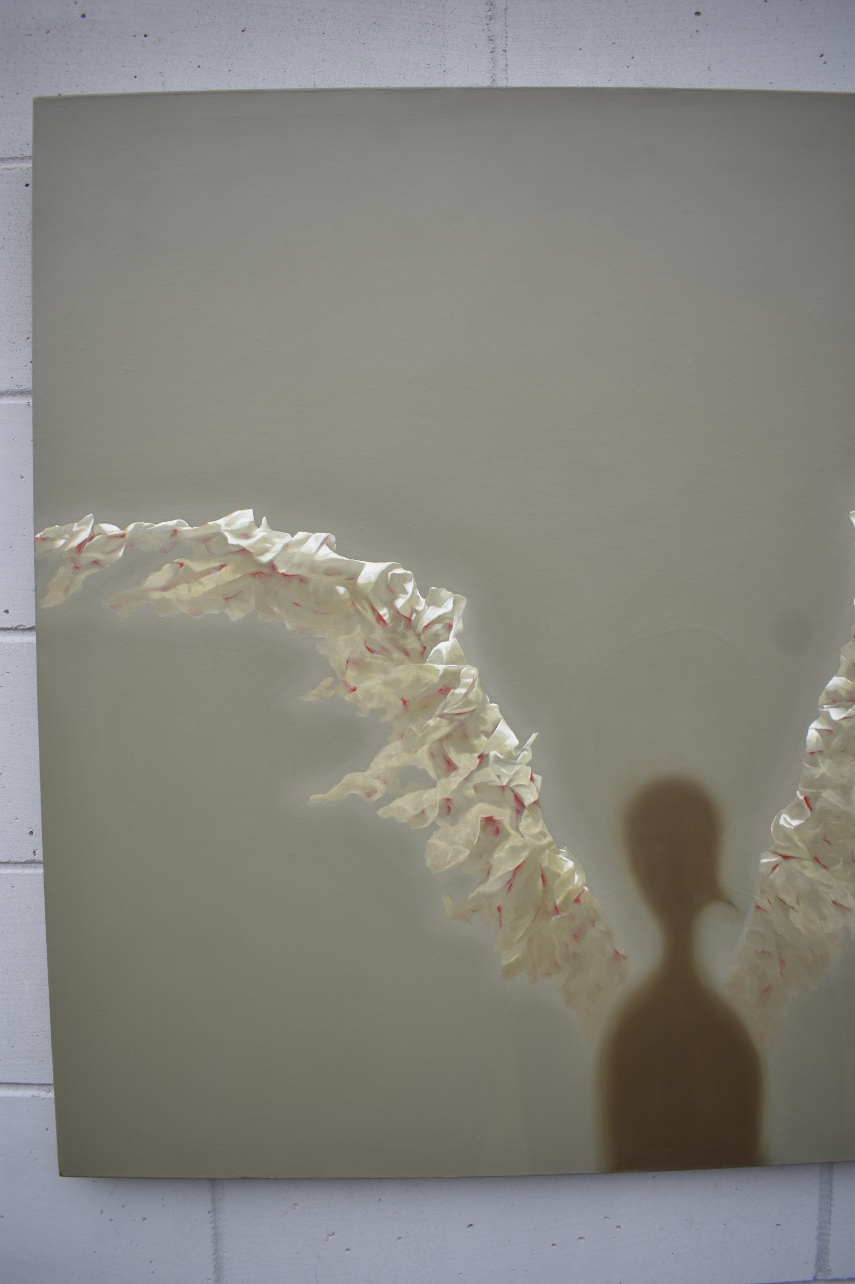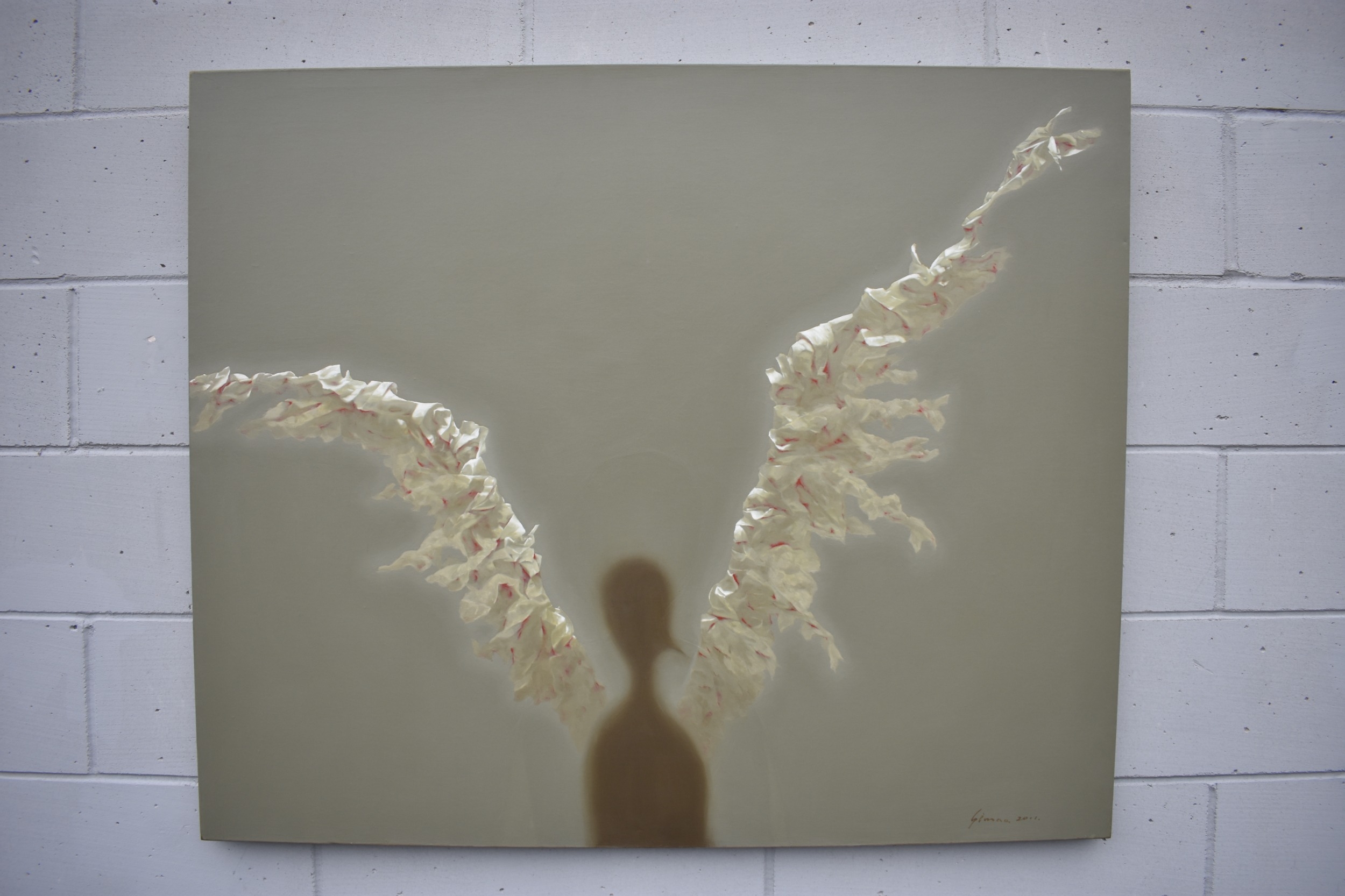 HUANG SIMAO (b.1967) Jingdezhen (China) Contemporary Artist: An oil painting from the "Edge of Reason" Series. The image uses paper as its subject matter. This painting depicts the shadow form of a figure with paper wings spreading out to either side. Most likely representing an Angel, dated 2011. It represents the fragility of life both psychologically and physically. 100.5cm x 120.5cm long