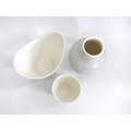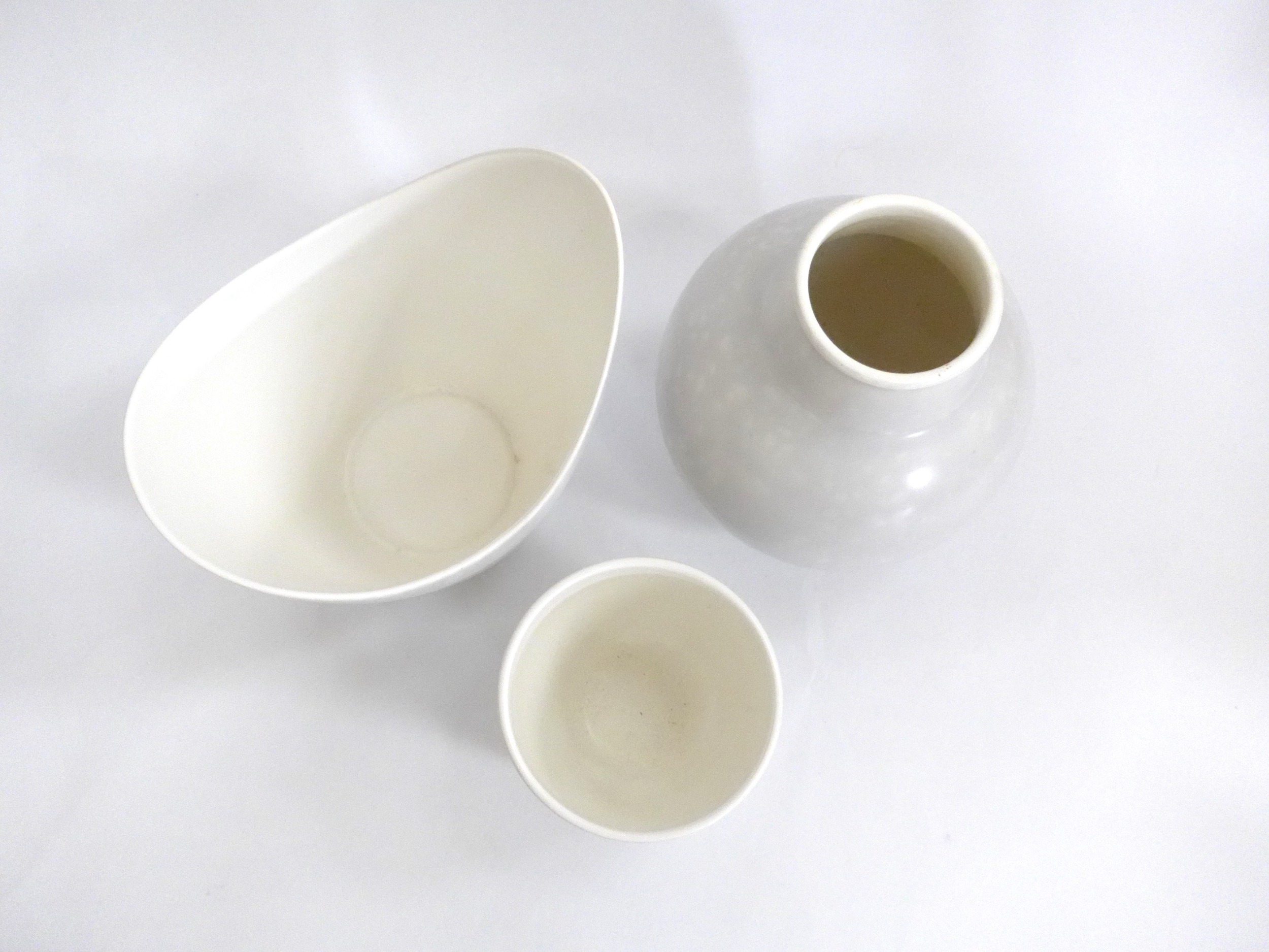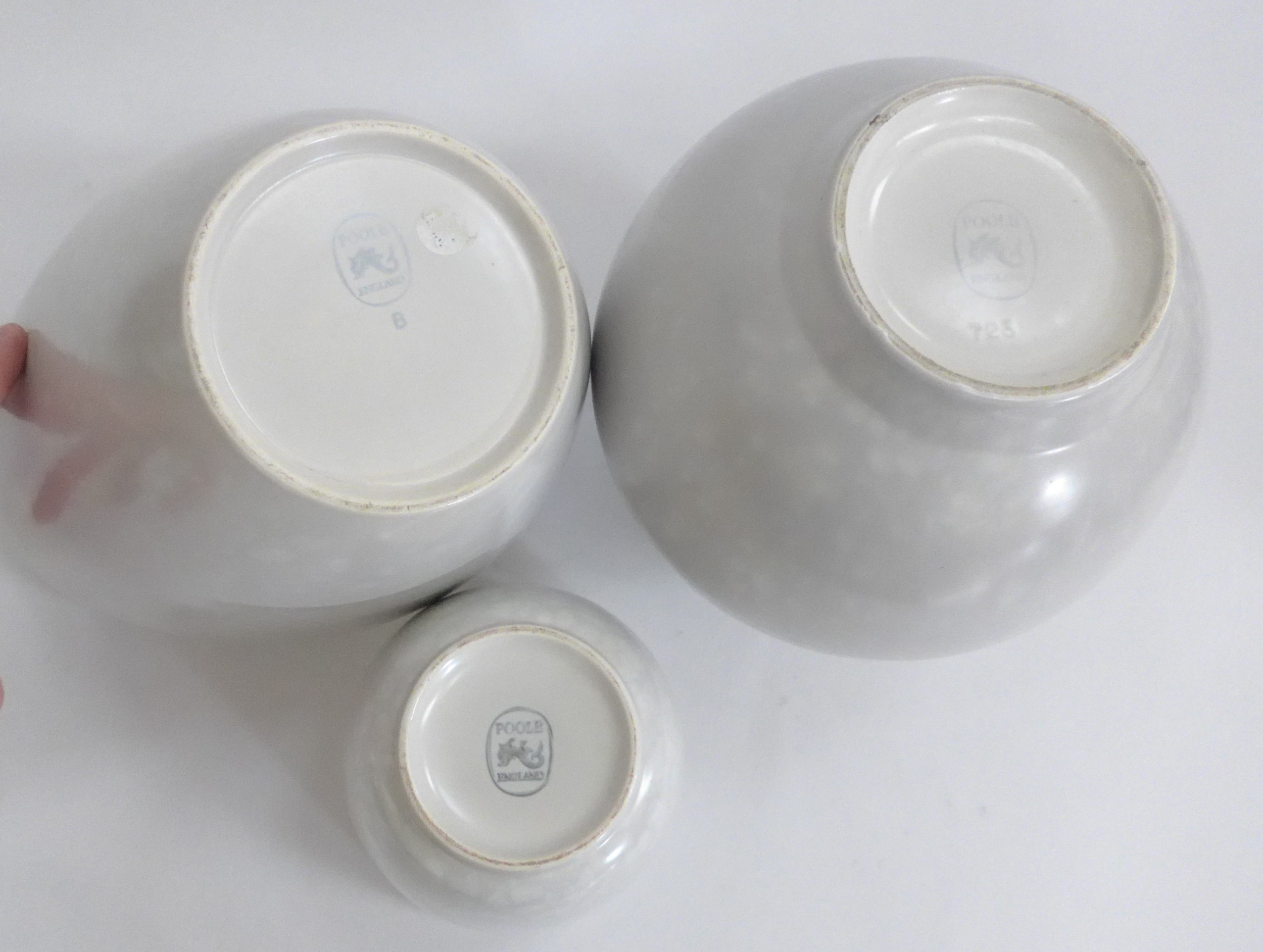 Two Poole Freeform vases and a bowl designed by Alfred Read & Guy Sydenham, various shapes, mottled grey glazes. 'Dolphin' backstamps. Tallest 20cm high (3)