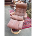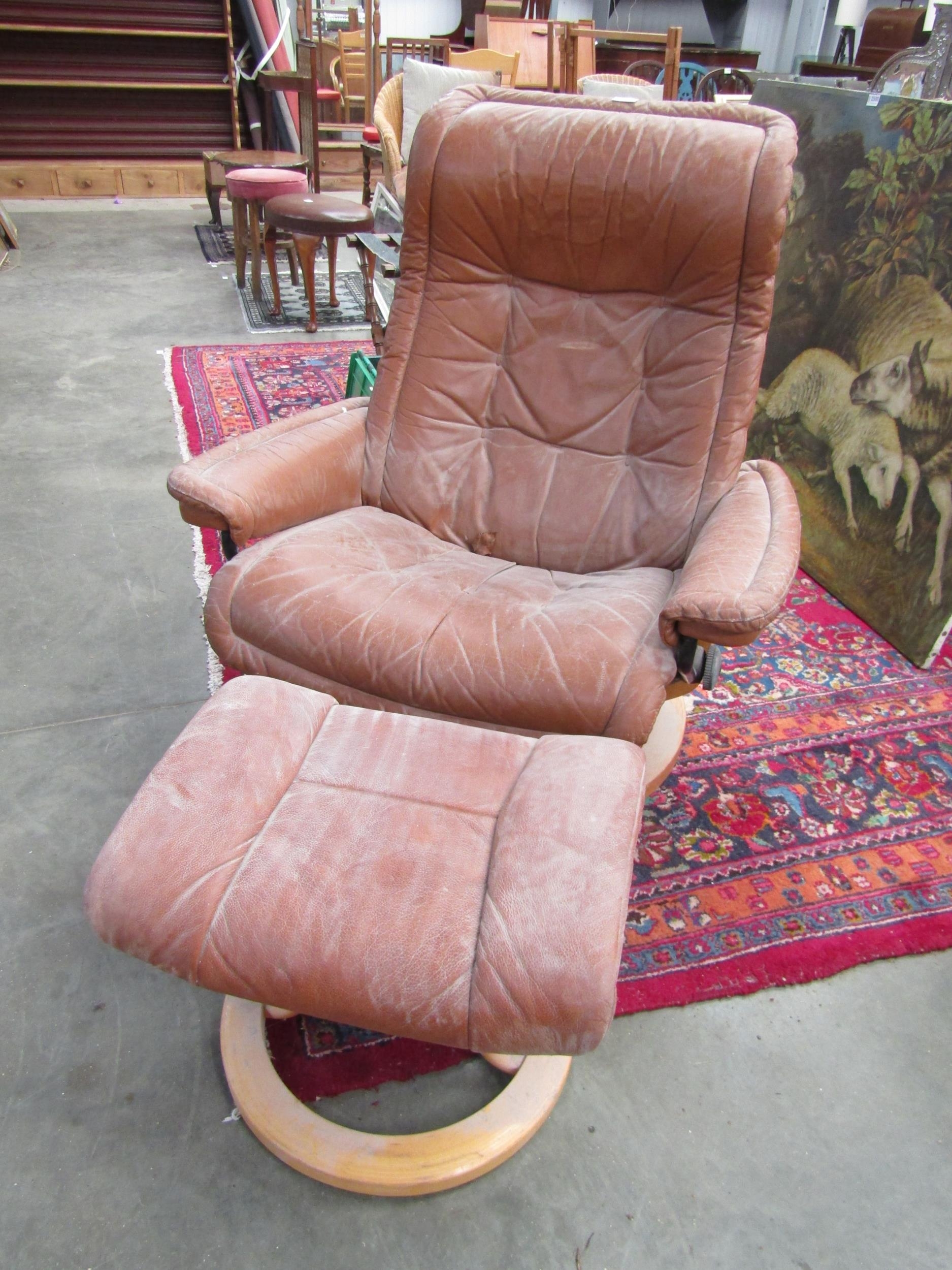 A worn leather workman's easy chair