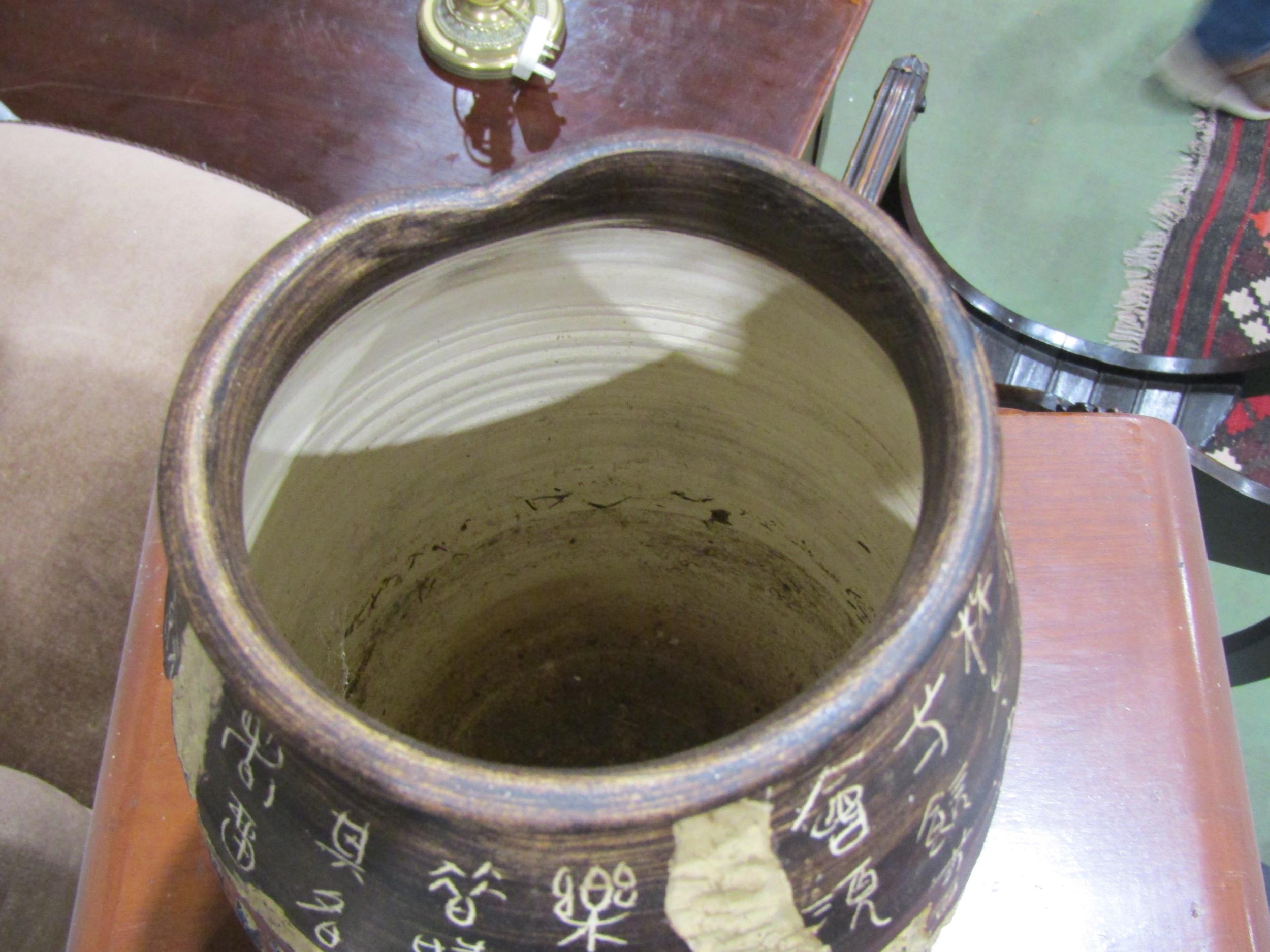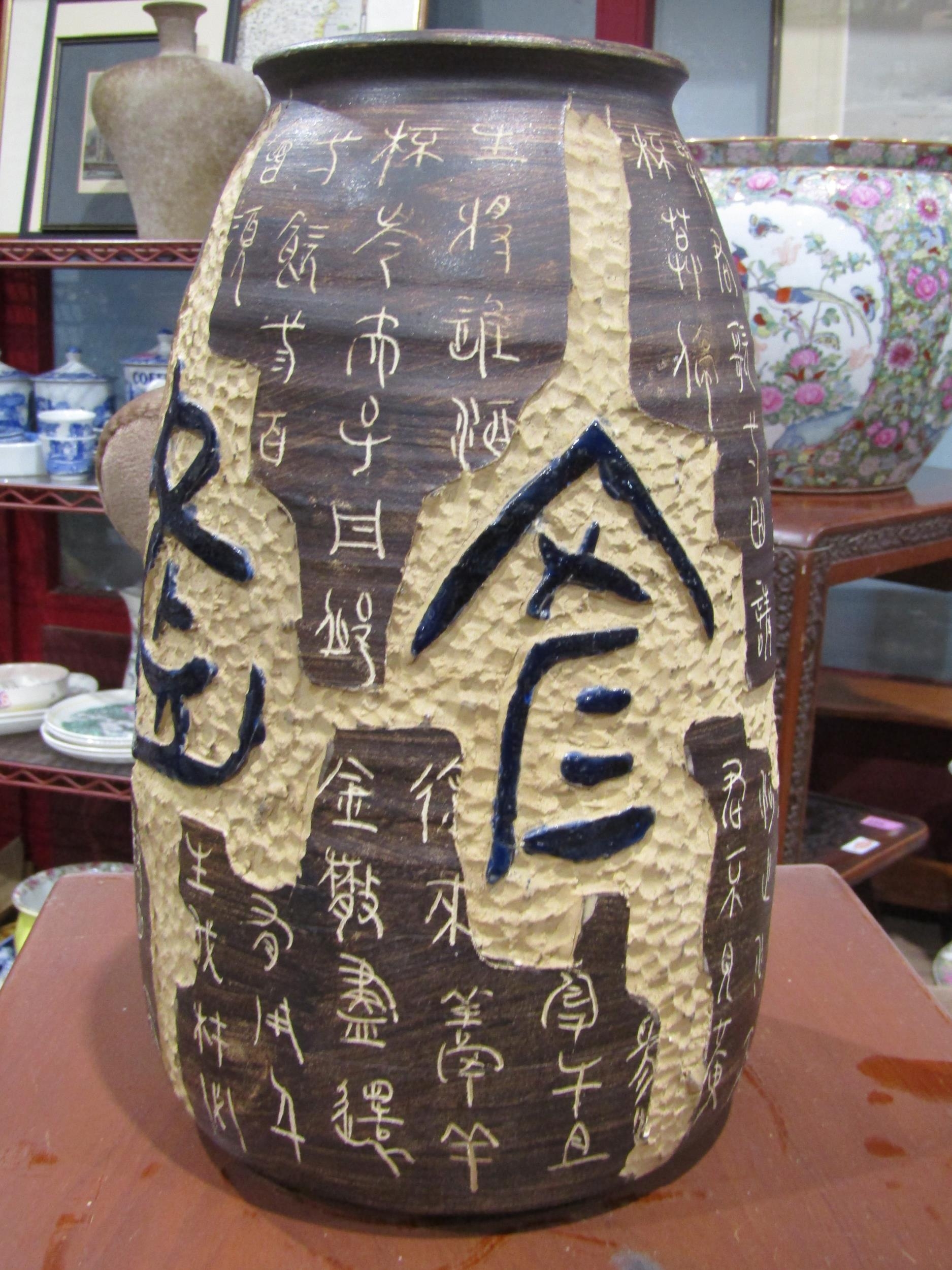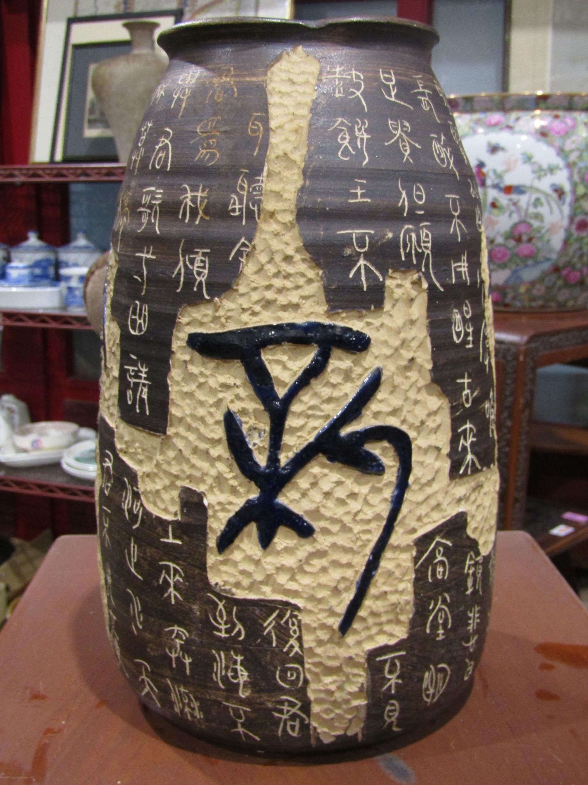 A 20th Century Chinese studio pottery vase with all-over script design and character marks to base, 30cm tall