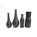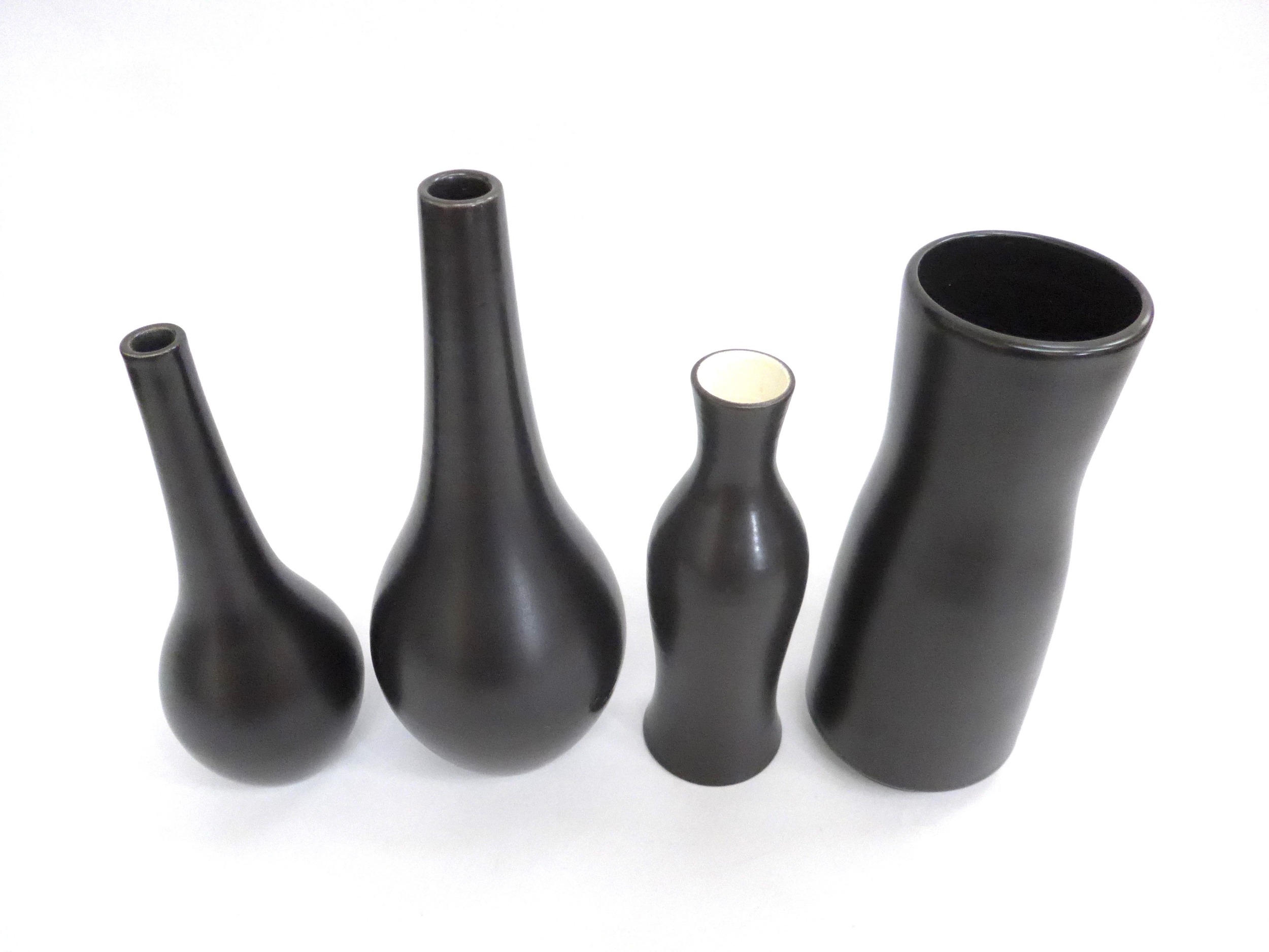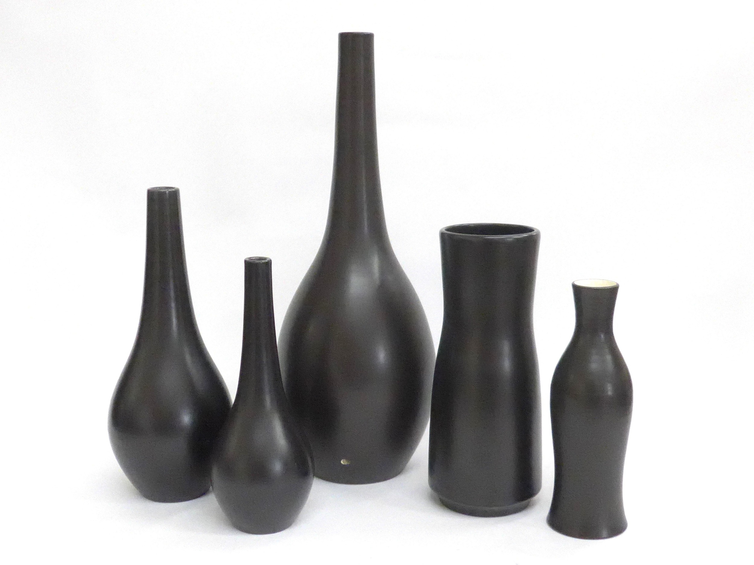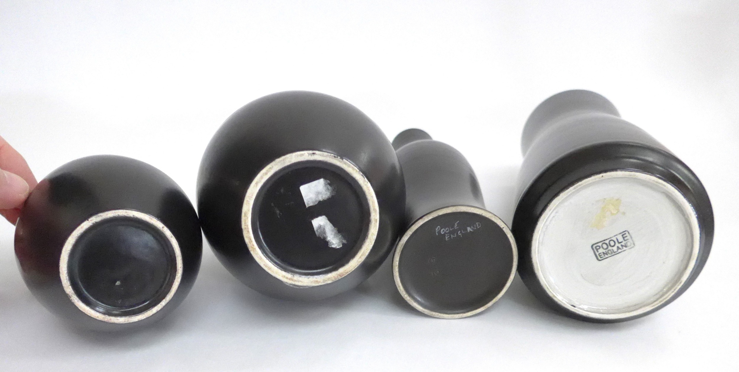 Five Poole Freeform vases designed by Alfred Read & Guy Sydenham, various shapes including 692,698 and others, Black Panther glazes. One converted to a lamp base. Various backstamp marks. Tallest 38cm high