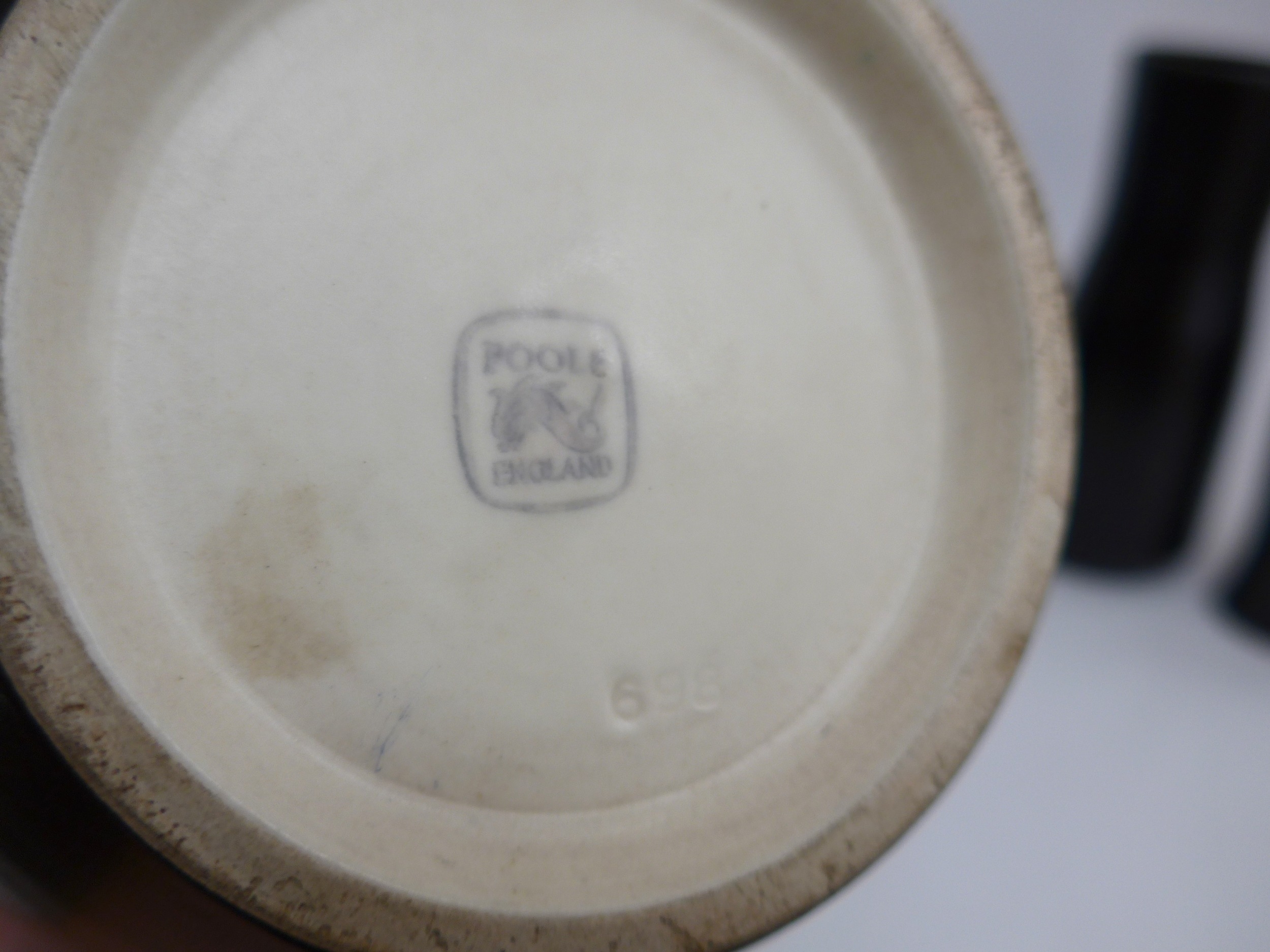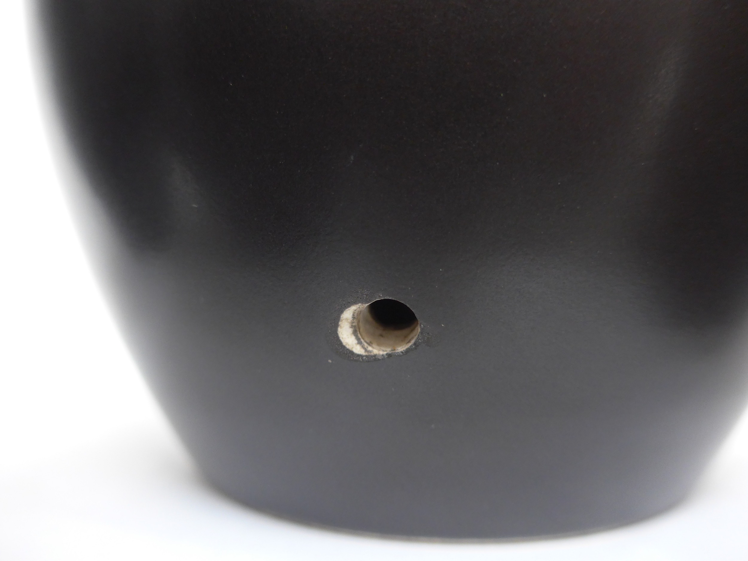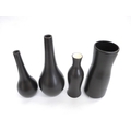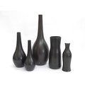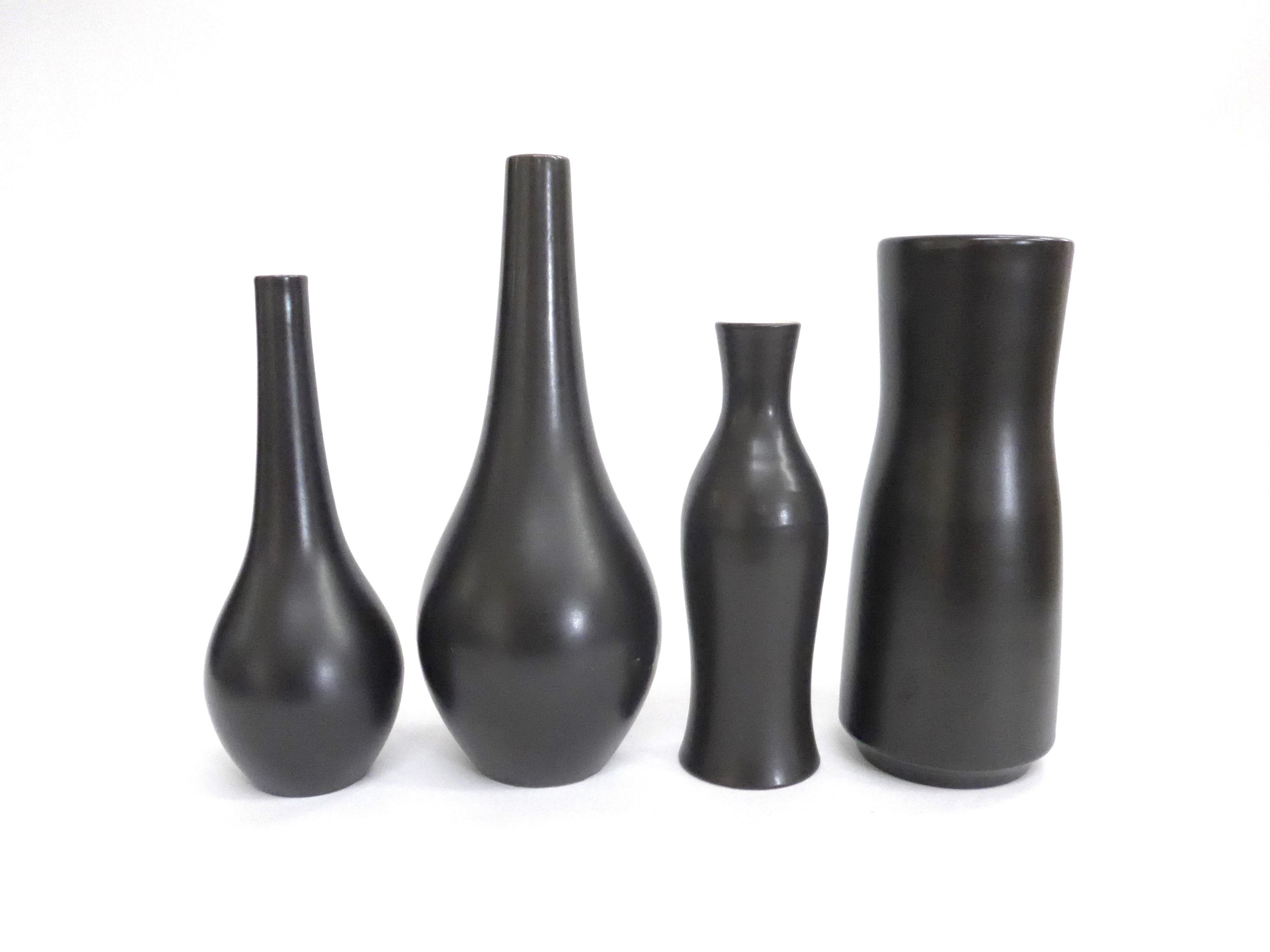 Five Poole Freeform vases designed by Alfred Read & Guy Sydenham, various shapes including 692,698 and others, Black Panther glazes. One converted to a lamp base. Various backstamp marks. Tallest 38cm high