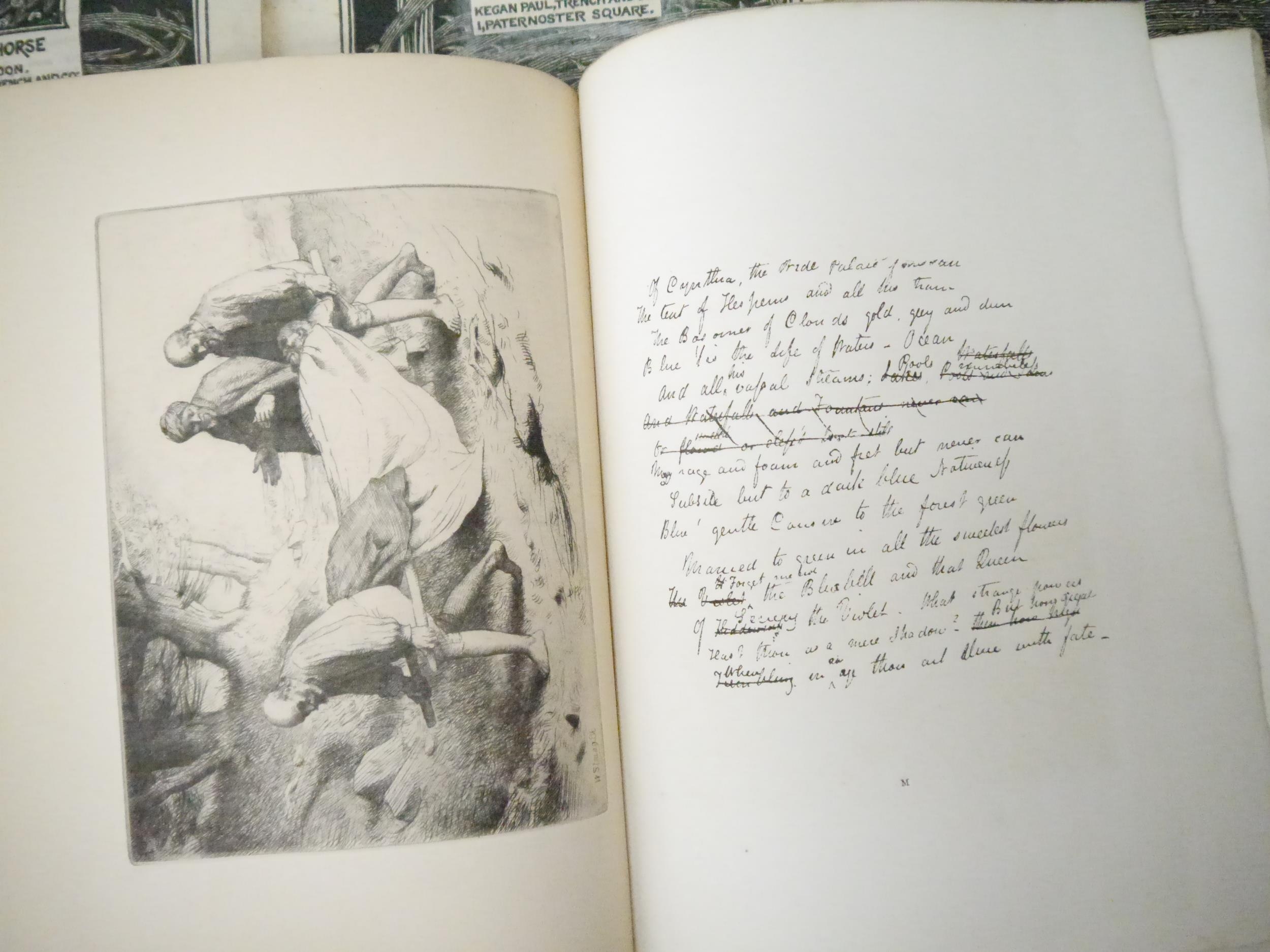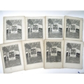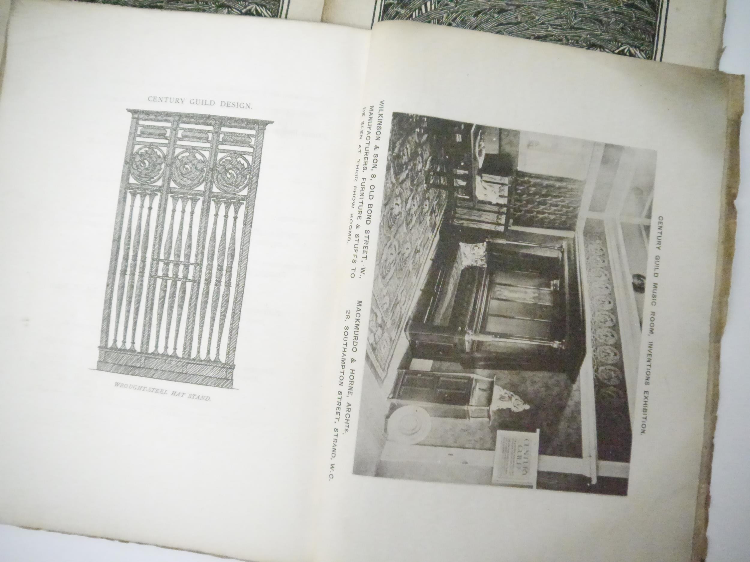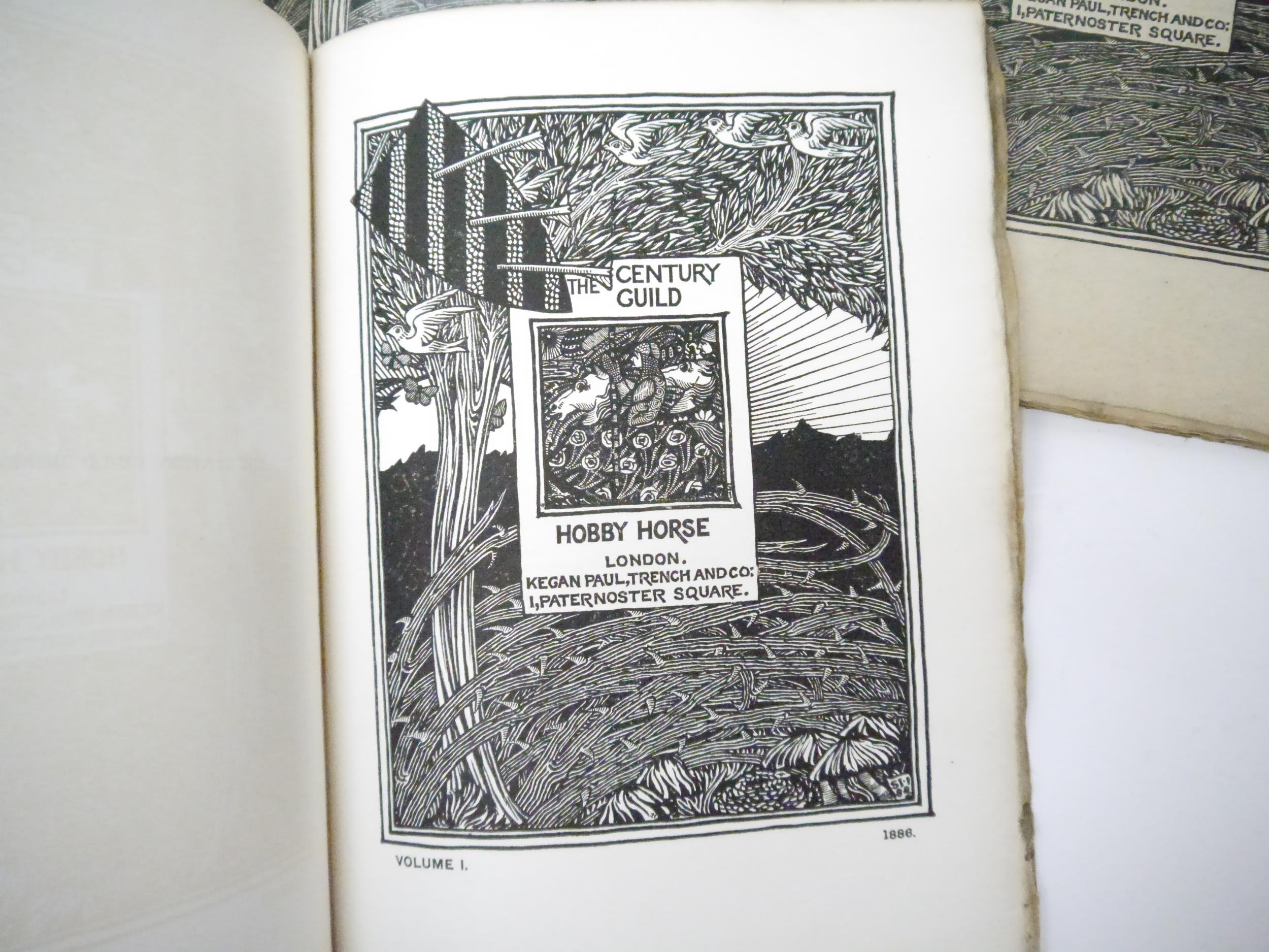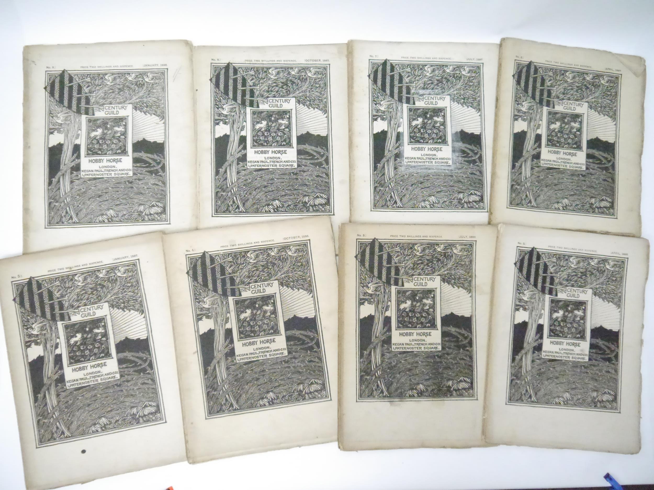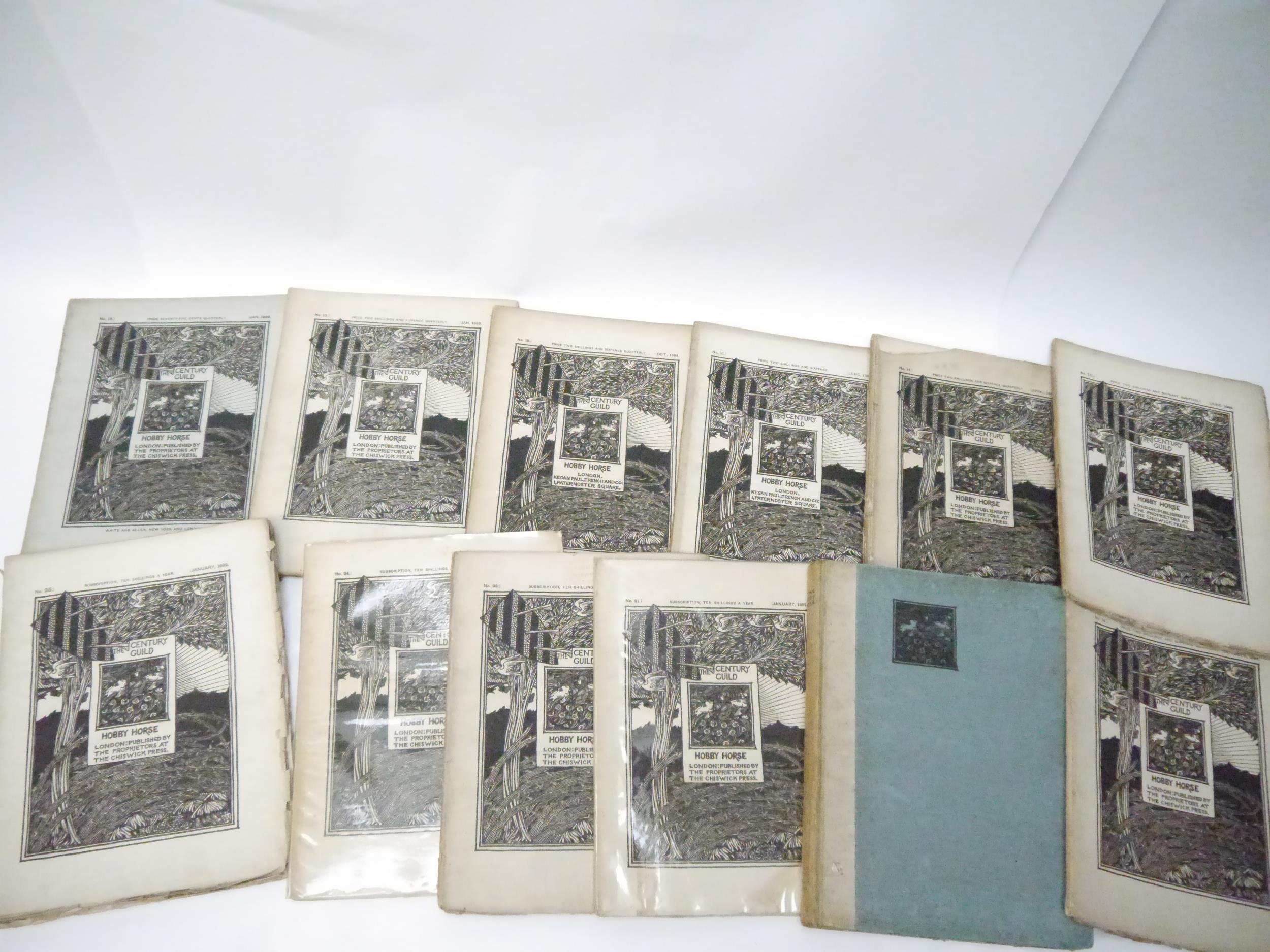 A.H. Mackmurdo, Herbert P. Horne and Selwyn Image (edited, illustrated): 'The Century Guild Hobby Horse', London, Kegan Paul & Chiswick Press, 29 assorted issues April 1886-July 1892, comprising numbers 2-27 consecutive, 22 of these in wraps, 7 in two bound volumes, with a few duplicates: No. 2, April 1886, frontis by Ford Madox Brown, orig. wraps; No.3, July 1886, frontis by William Strang, orig. wraps; No. 4, October 1886, double page frontis of a William Blake broadsheet + 2 plates of Pre-Raphaelite stained glass windows at St. Martin's Church, Scarborough, orig. wraps; No.5, January 1887, frontis by G.F. Watts + 2 full page plates, orig. wraps; No.6, April 1887, frontis by Frederic Shields, 3 full page woodcut plates after Arthur Burgess, orig. wraps; No. 7, July 1887, frontis by E. Burne-Jones + 2 plates (photogravure of a drawing by Rossetti and a facsimile of William Blake's Sibylline leaf on Homer and Virgil), orig. wraps; No.8, October 1887, frontis by Selwyn Image + 1 full page plate, orig. wraps, together with duplicate copy complete with frontis and plate, orig. wraps, top wrap with part loss upper corner; No.9, January 1888, frontis + 2 full page plates, orig. wraps; bound volume of four No.'s, volume 3, being No.'s 9,10,11 & 12, bound without wraps, boards loose and worn, includes No. 10, with frontis by F. Sandys + 2 plates, issues 9,11 & 12 also with frontises, full page plates; No. 11, June 1888, frontis + 2 plates, orig. wraps; No.12, October 1888, frontis + full page plate by Frederick Sandys, orig. wraps; No.13, January 1889, frontis + full page plate by C. W. Whall, orig. wraps, together with duplicate of No. 13, frontis + 1 plate complete, orig. wraps; No.14, April 1889, frontis after D.G. Rossetti + full page plate by Herbert P. Horne, orig. wraps; No.15, July 1889, frontis after Edward Burne-Jones + 1 full page plate, orig. wraps; No. 16, October 1889, frontis by Frederic Shields + 1 full page plate, orig. wraps; bound volume of four No.'s, volume 5, No.'s 17,18,19 & 20, January, April, July & OCtober 1890, No.17, Jan. 1890, frontis by Frederic Leighton + 1 full page plate by Selwyn Image; No. 18, April 1890, frontis after Hans Holbein + 1 full page plate; No. 19, frontis by Ford Madox Brown + 1 full page plate; No. 20, October 1890, frontis by Frederic Shields + 1 full page plate by Selwyn Image, each issue with original wraps bound in, plus a woodcut pictorial general title page for volume five and two leaves contents and list of illustrations for volume five, original quarter Japanese vellum, printed paper covered boards; No. 21, January 1891, frontis + 1 full page plate by Selwyn Image, orig. wraps (top wrap with two repaired closed tears); No. 23, July 1891, frontis + 1 full page plate facsimile of a woodcut by J.F. Millet, orig. wraps; No. 24, October 1891, frontis + 1 full page plate, both after Jean Francois Millet from original impressions in the collection of M. Camille Pissarro, orig. wraps; No. 25, January 1892, frontis after Sir Peter Lely, orig. wraps; No. 26, April 1892, frontis after J.F. Millet + 1 full page plate after Edward Calvert, orig. wraps (wraps worn, loose); No. 27, July 1892, folding frontis by Selwyn Image, lacks wraps, but with volume 7 general woodcut pictorial title and general contents/list of illustrations at end. All quarto, decorative woodcut titles by Selwyn Image, woodcut decorations and initials and aforementioned full page plates/illustrations. A part set of the highly influential magazine produced by one of the most important 19th century Arts and Crafts organisations. The Century Guild was founded in 1882 by the architect Arthur Heygate Mackmurdo to produce decorative work in every field of interior design including architecture, decorative painting, furniture, metalwork, ceramics and glass. There was an emphasis on crafts rather than mechanical production and in particular the new style of Art Nouveau, evident in the woodcut decorations and monogram by Mackmurdo. The architect Herbert P.Horne and artist & writer Selwyn Image were the fellow members and co-editors but many other artists were involved with the group. In 1884 they started The Century Guild Hobby Horse, concentrating on the visual arts but also including literature and social issues. It was a high quality magazine printed on handmade paper, illustrated with woodcuts and lithographs and used photogravure for reproductions, while the progressive typography and design of the main part was done or guided by Emery Walker and printed at the Chiswick Press. Contributors/content include Oscar Wilde, W.M. Rossetti, Christina Rossetti, William and May Morris, John Ruskin, Arthur Galton, John Addington Symonds, Paul Verlaine, Inigo Jones, Edward Burne-Jones, Simeon Solomon, Arthur Burgess, Ford Madox Brown, William Strang, G.F. Watts, Frederic Shields, Frederick Sandys, Jean Francois Millet etc etc. The Guild influenced C.F.A.Voysey and Charles Rennie Mackintosh and other members of the Arts and Crafts movement; the magazine developed book-design leading to periodicals such as The Yellow Book and The Savoy.