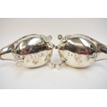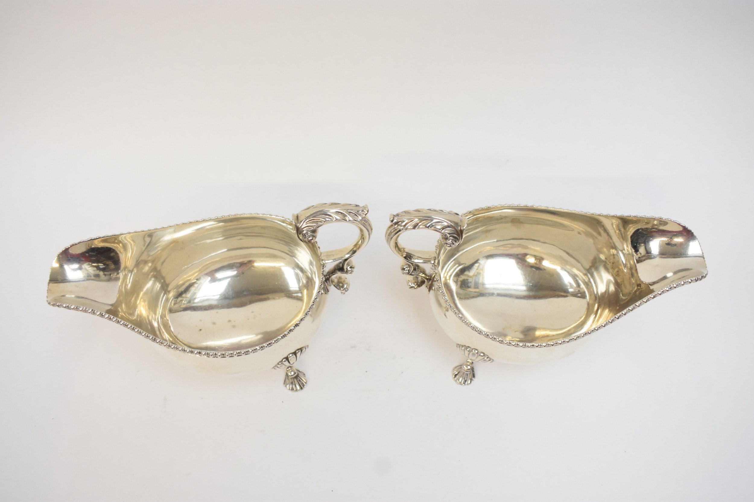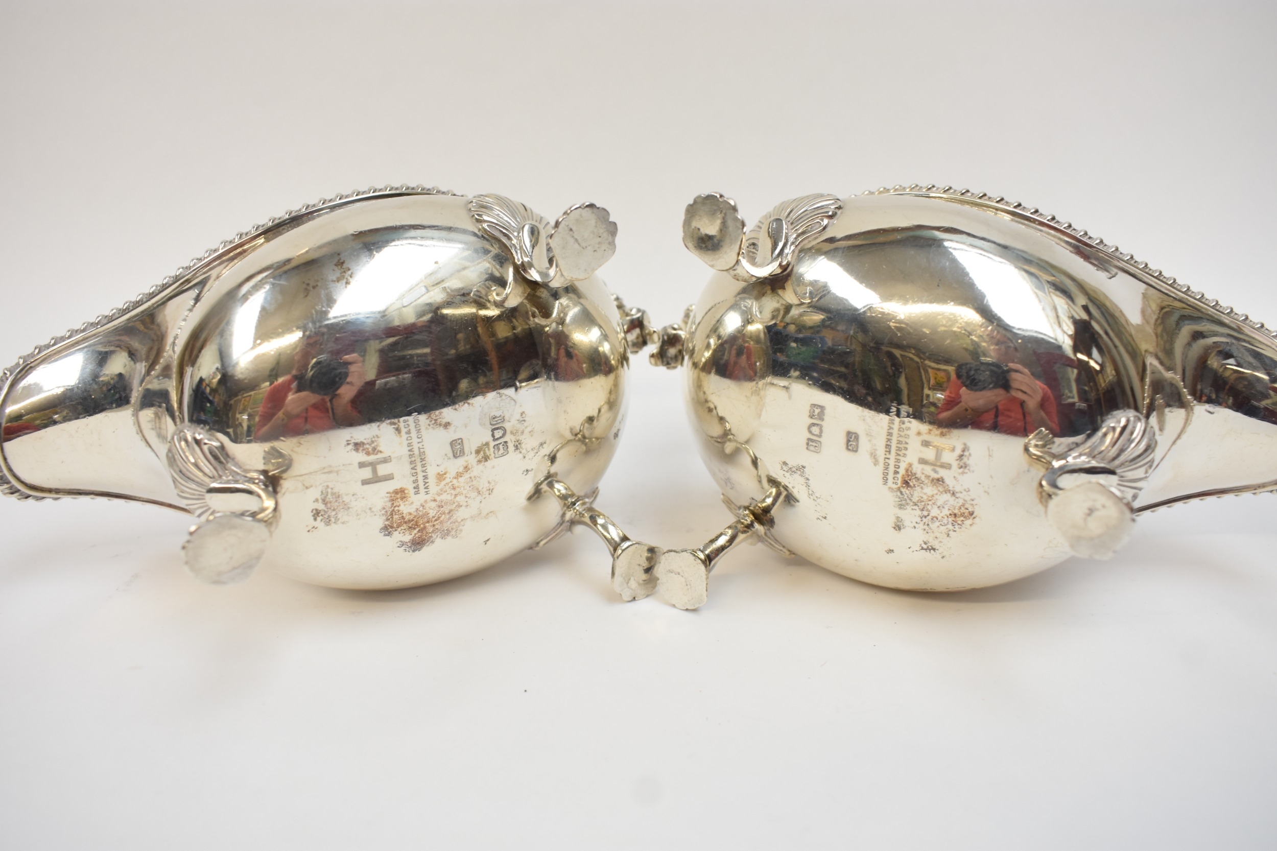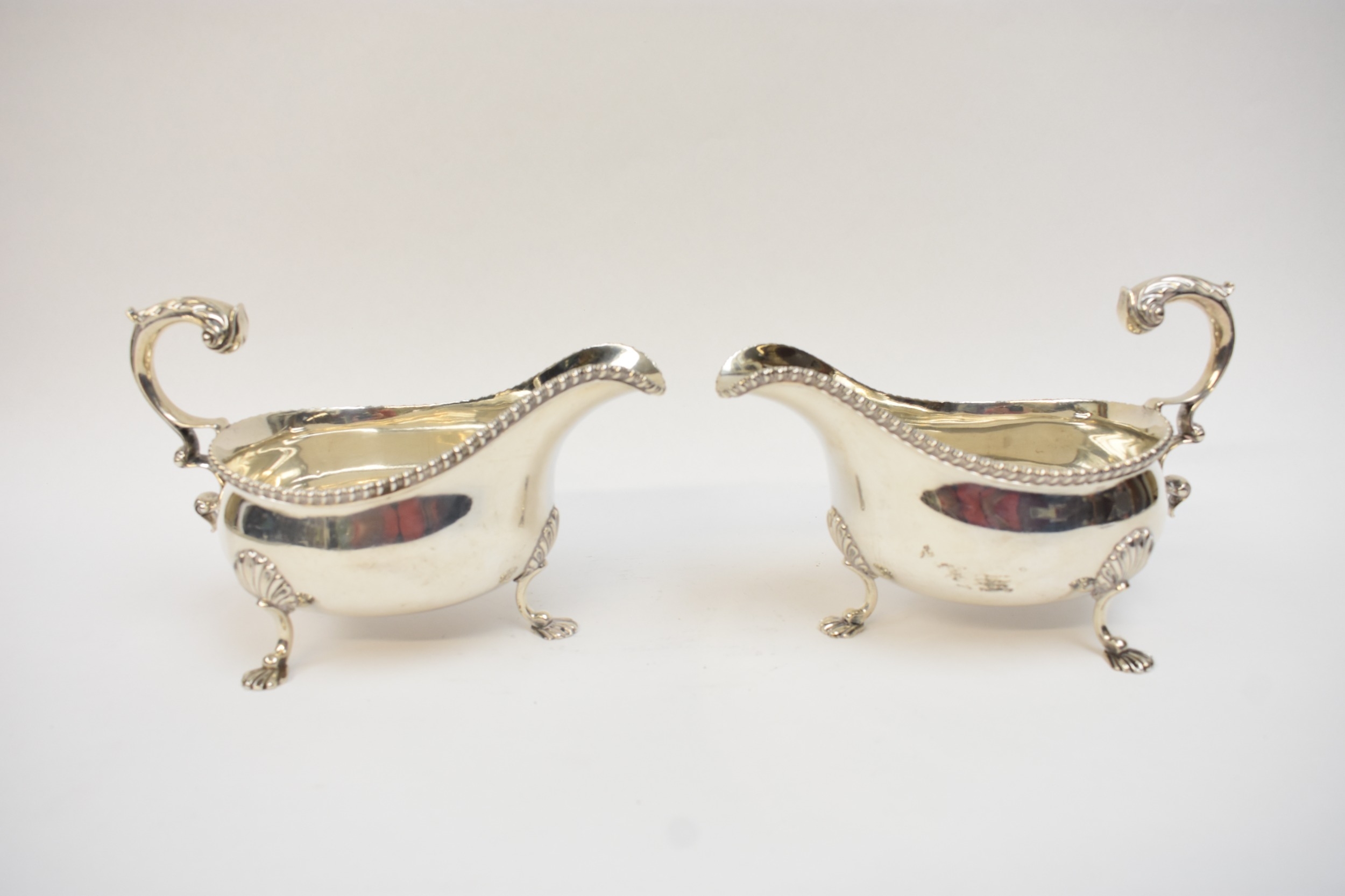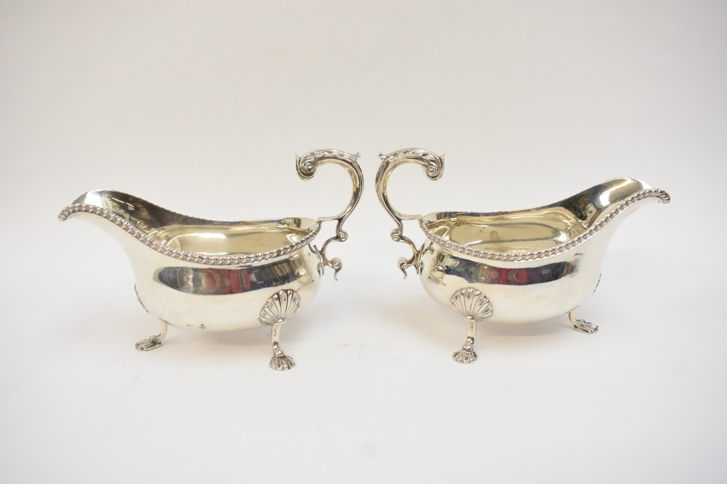 A pair of Edwardian silver sauce boats in the George III style, with gadrooned rims and flying "C" scroll handles, each raised upon three curved legs with scallop-shell shaped knees and feet. London 1901. By R&S Garrard & Co, Haymarket, London. 769g.