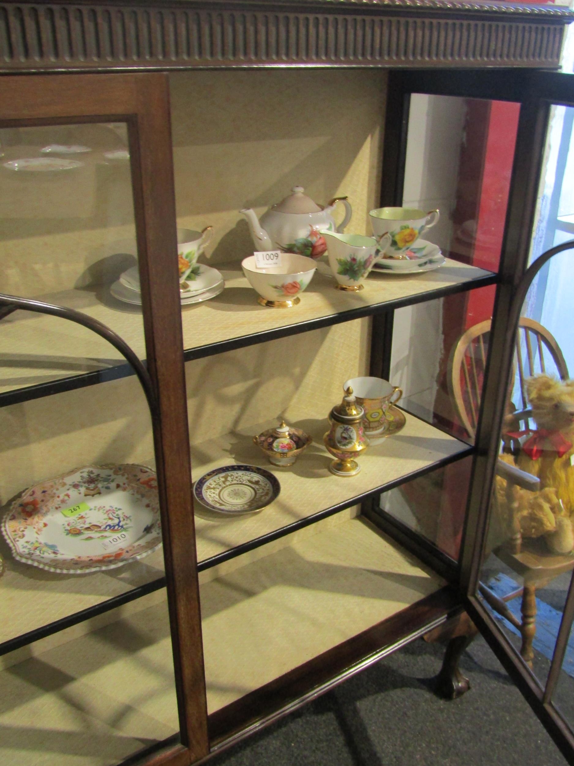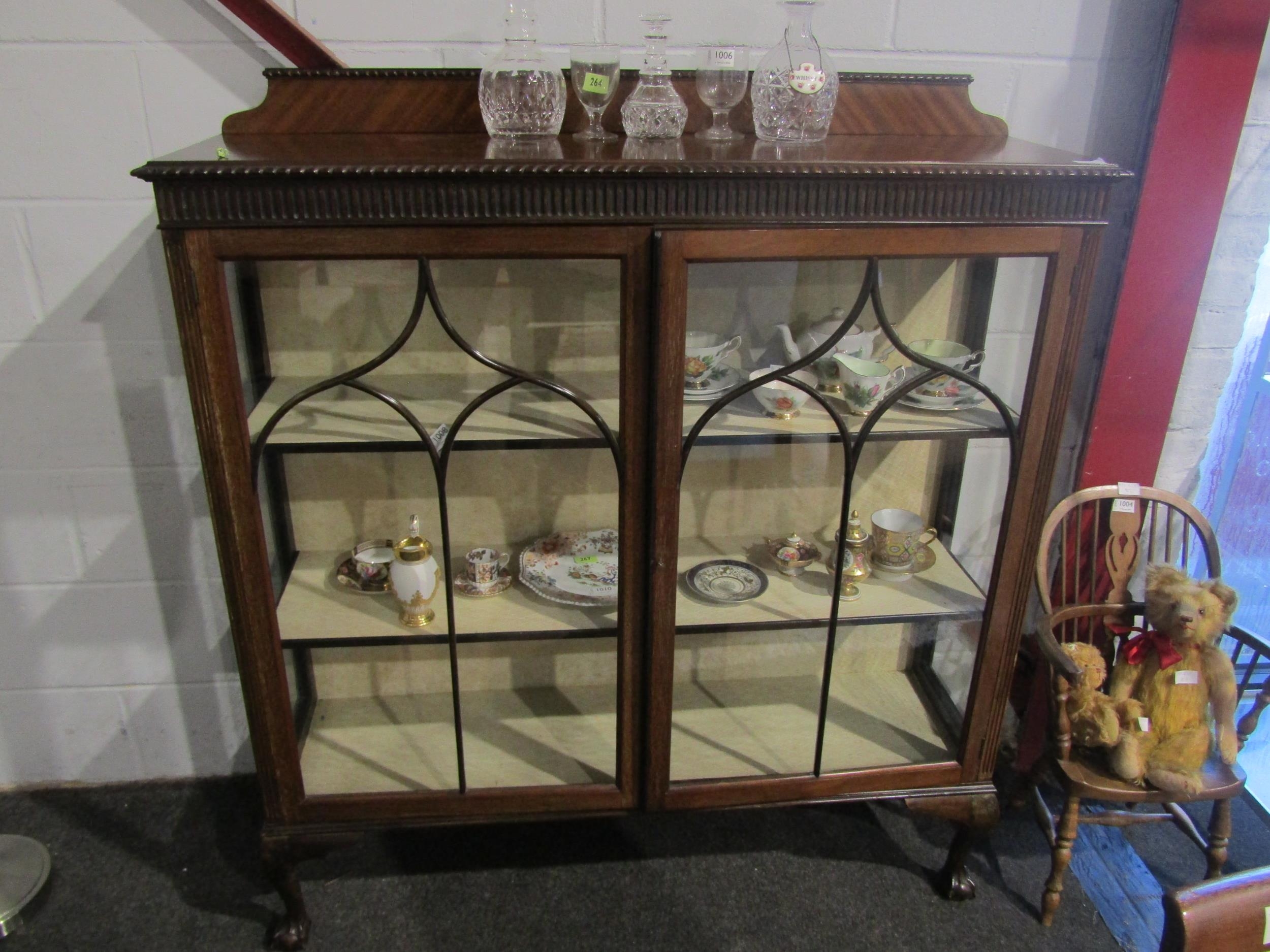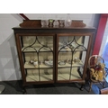 A 1930's mahogany two door display cabinet, astragal detail, on cabriole feet, 134cm tall x 120cm wide x 35cm deep