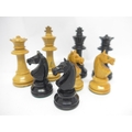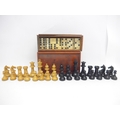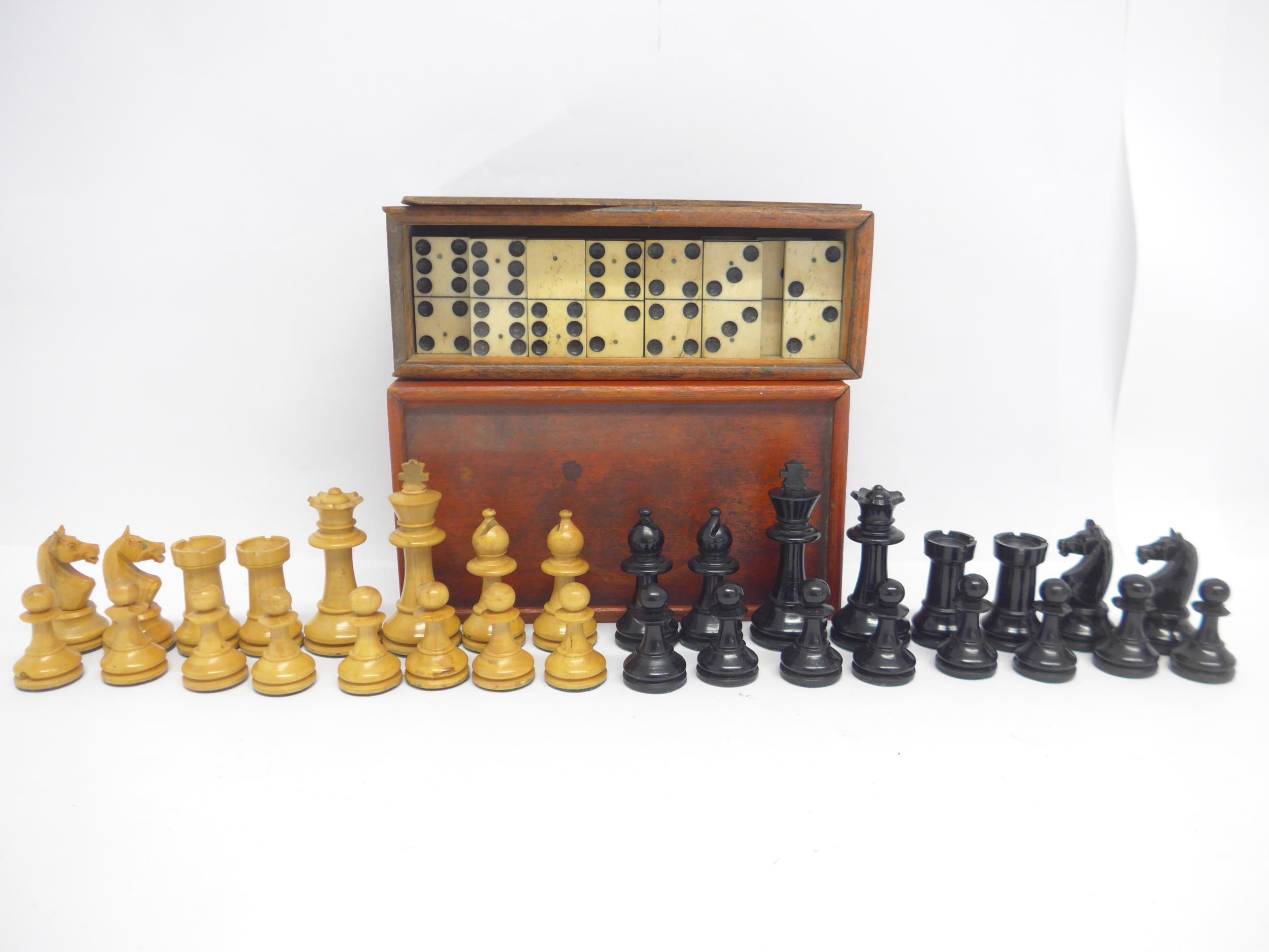 A vintage wooden chess set, tallest piece 7cm, and a set of bone dominoes