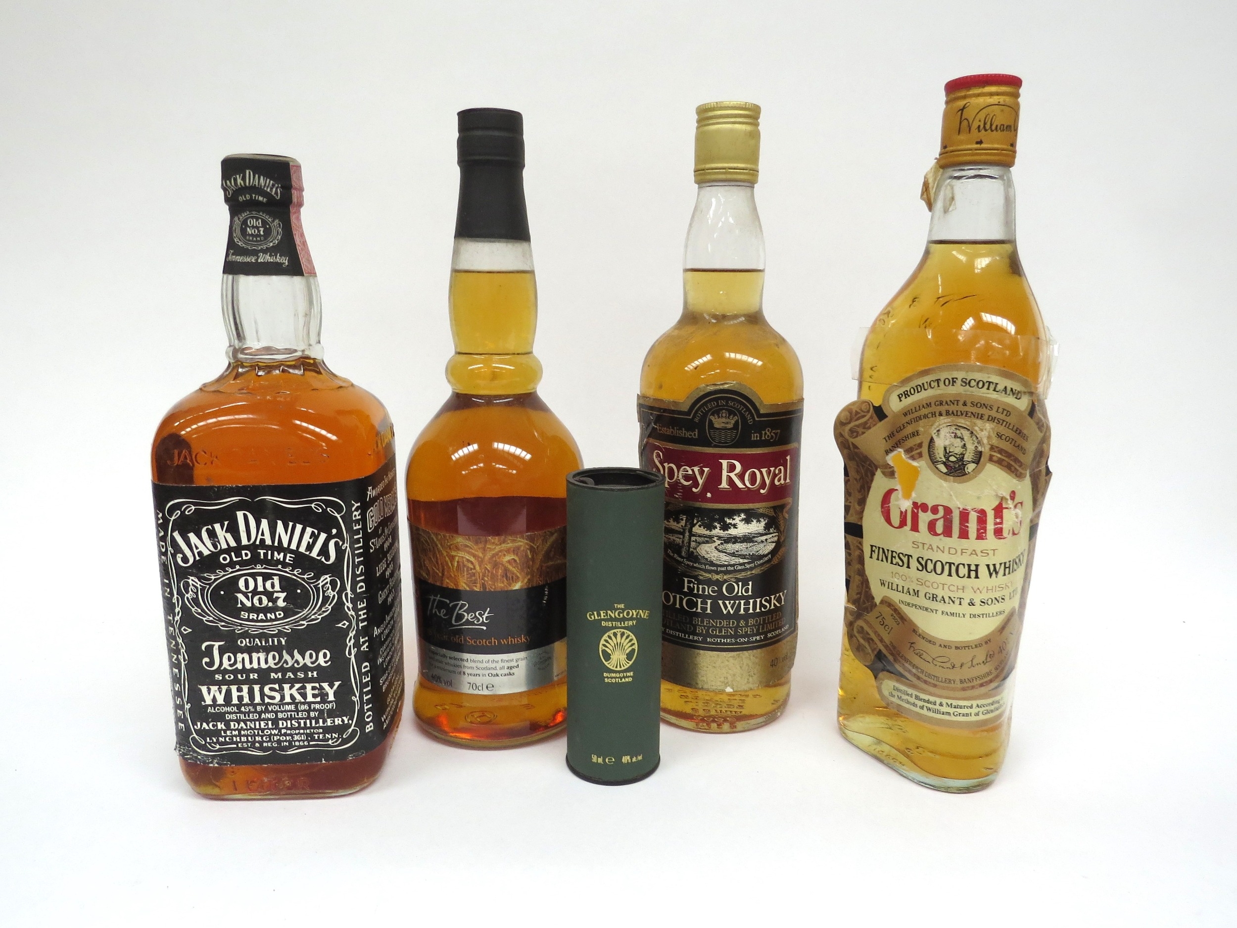 Glen Spey, Spey Royal Fine Old Scotch Whisky 75cl, Grant's Finest Scotch Whisky 75cl, Morrisons The Best 8 Year Old Scotch Whisky 70cl, Jack Daniel's No7 Whiskey 1ltr, Glengoyne 10 Year Old Whisky 50ml (5)