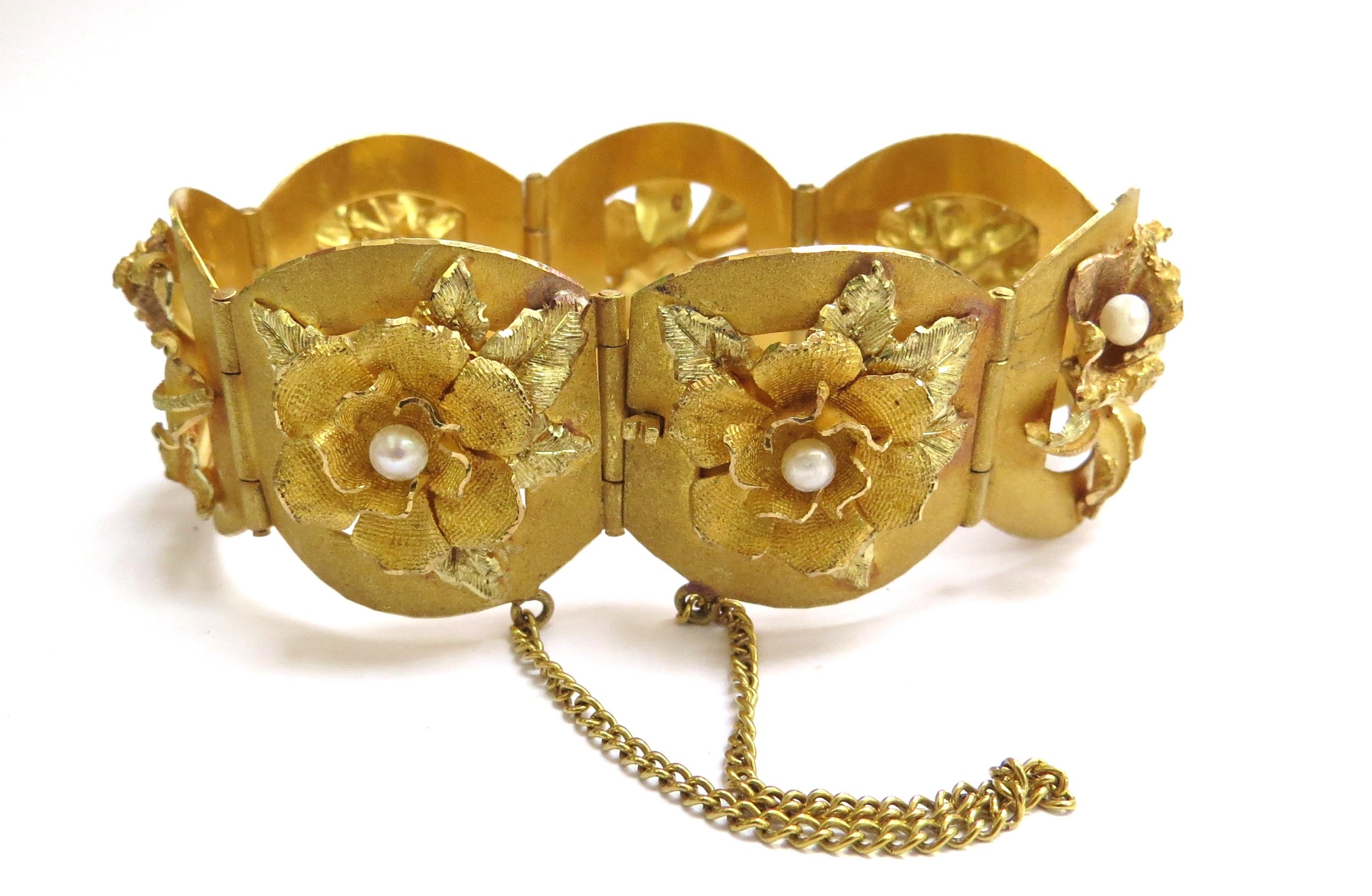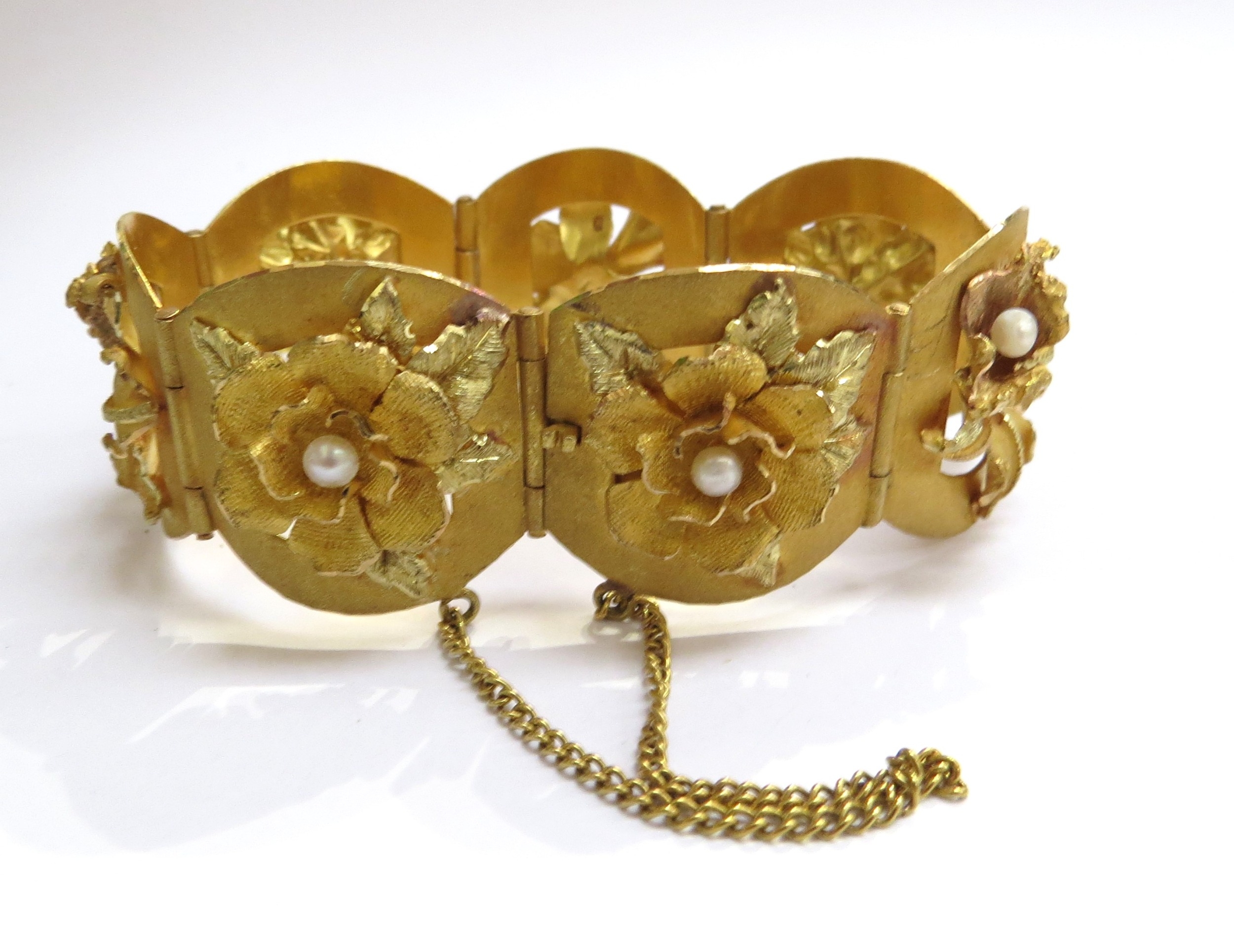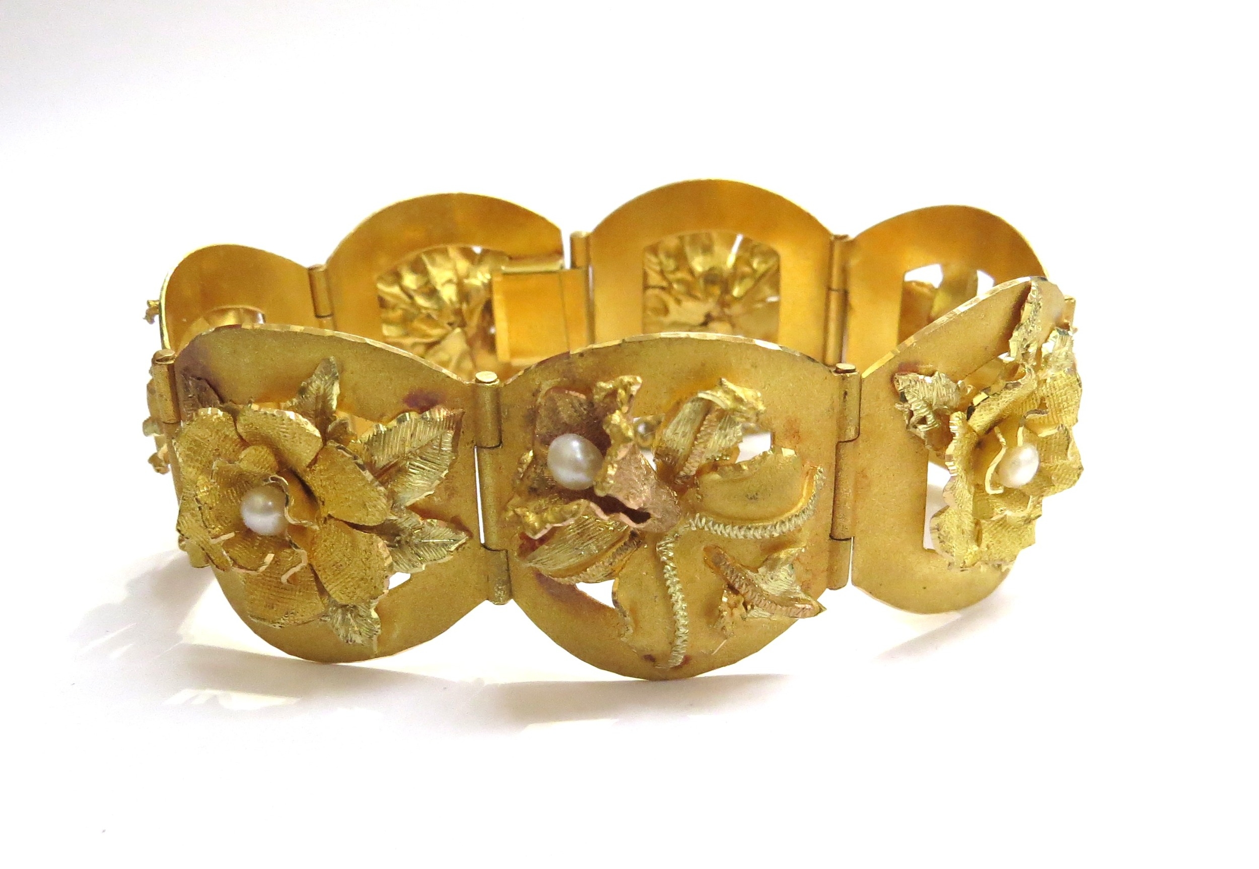 A three tone gold seven panel bracelet each panel with a high relief floral decoration set with single pearl, stamped 18k, 17cm long, 51.2g