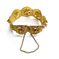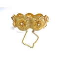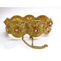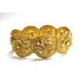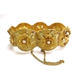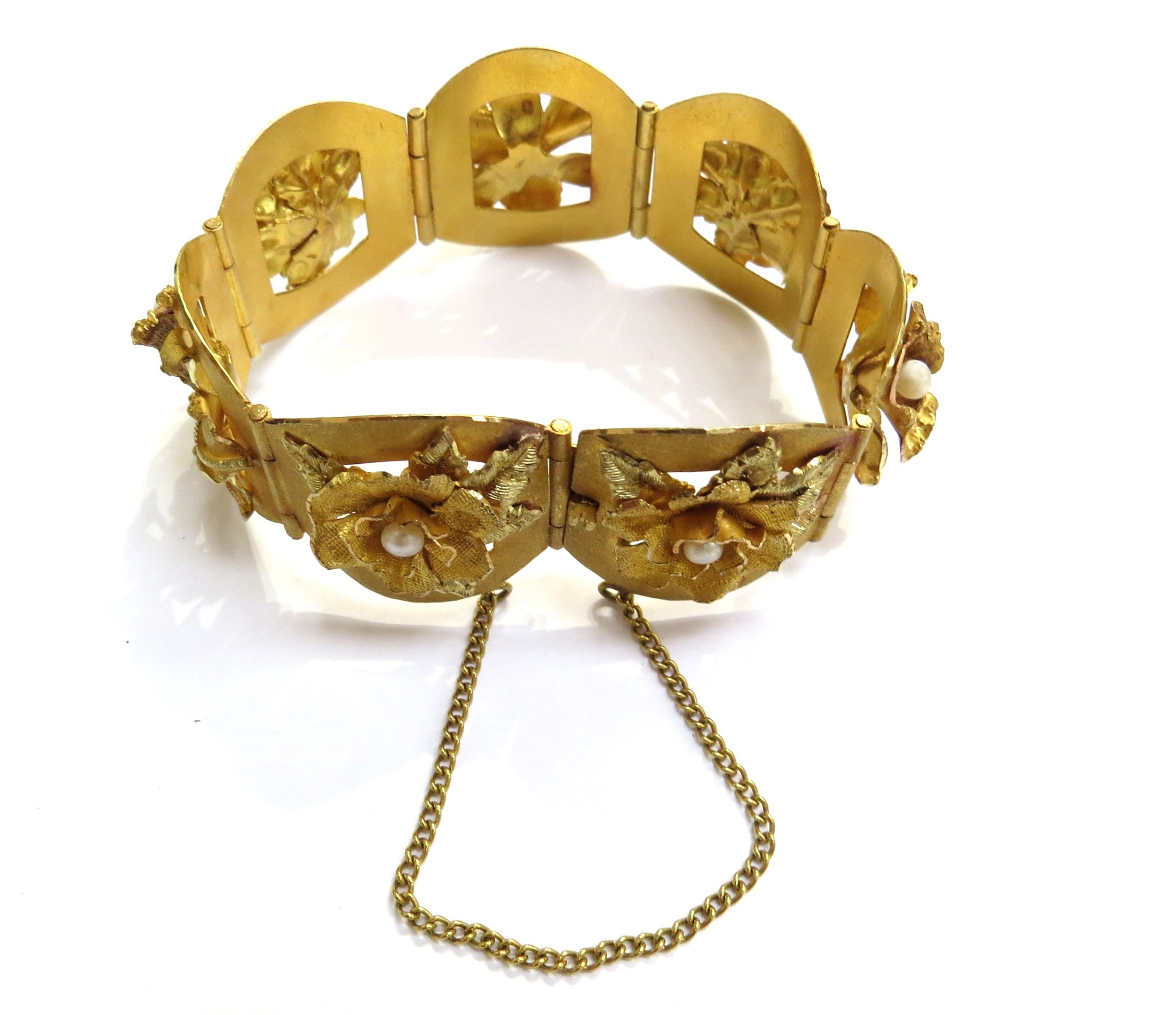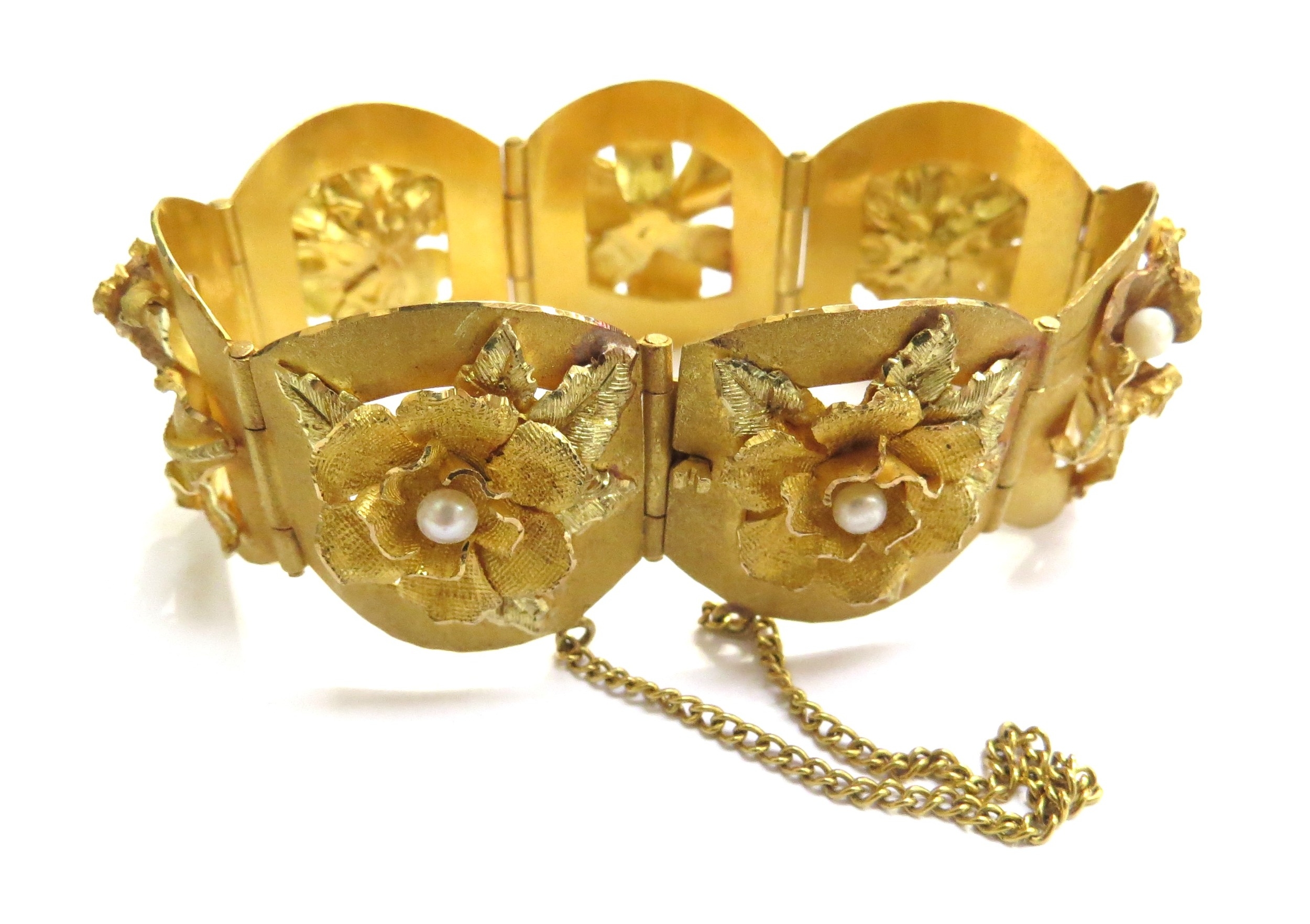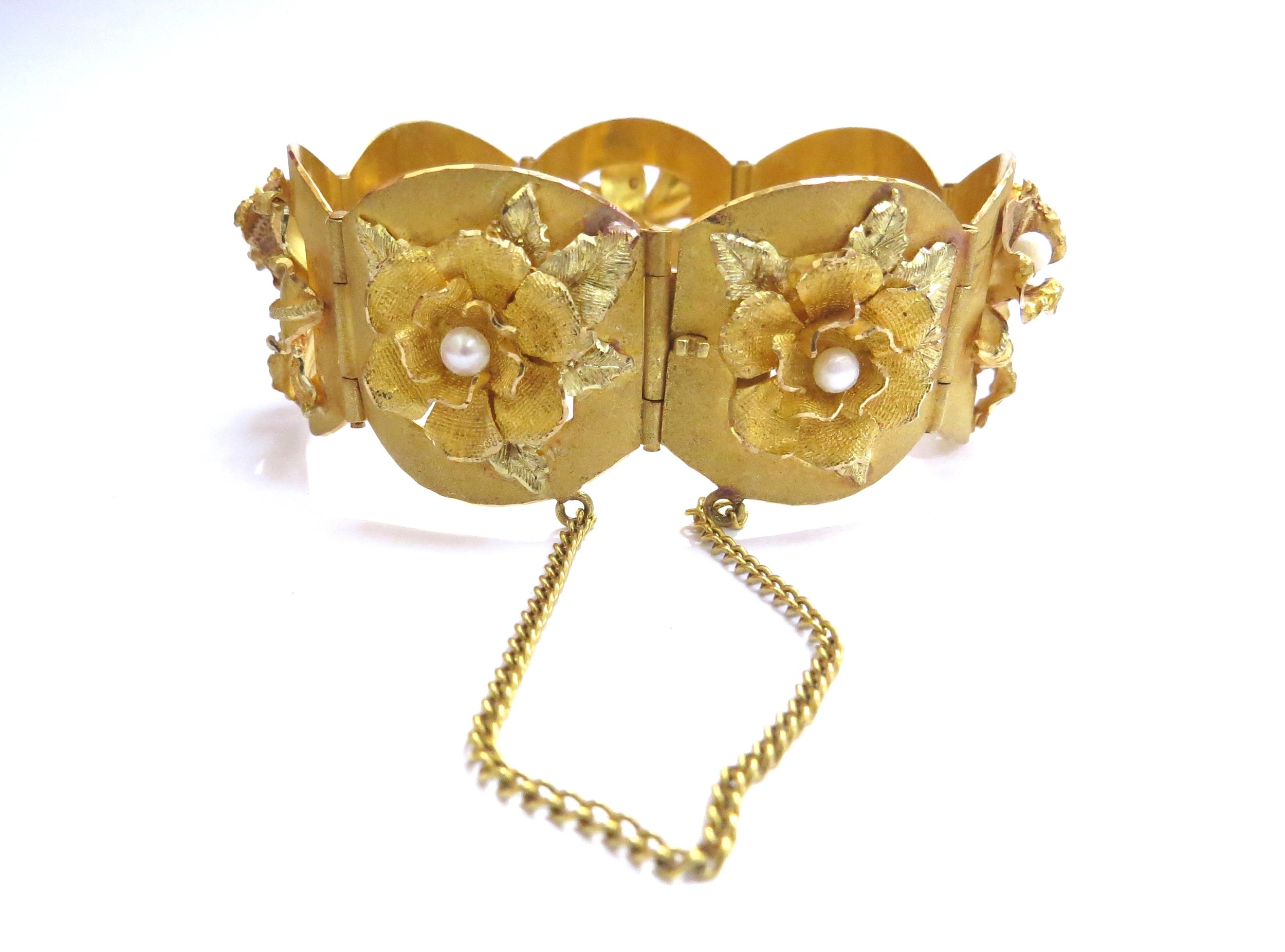 A three tone gold seven panel bracelet each panel with a high relief floral decoration set with single pearl, stamped 18k, 17cm long, 51.2g