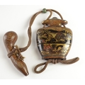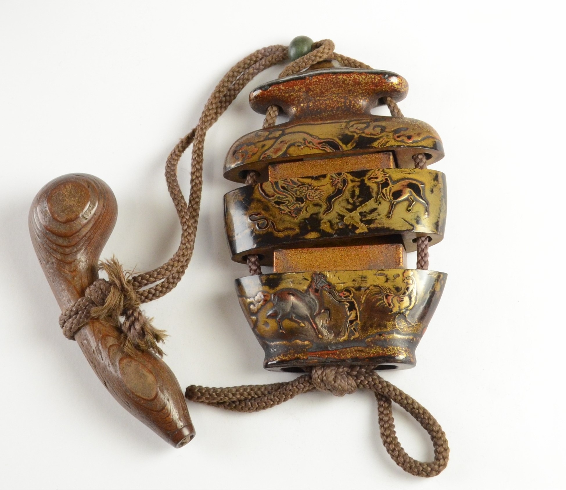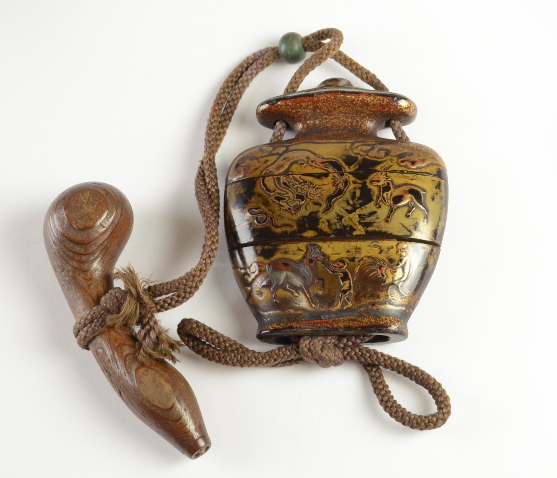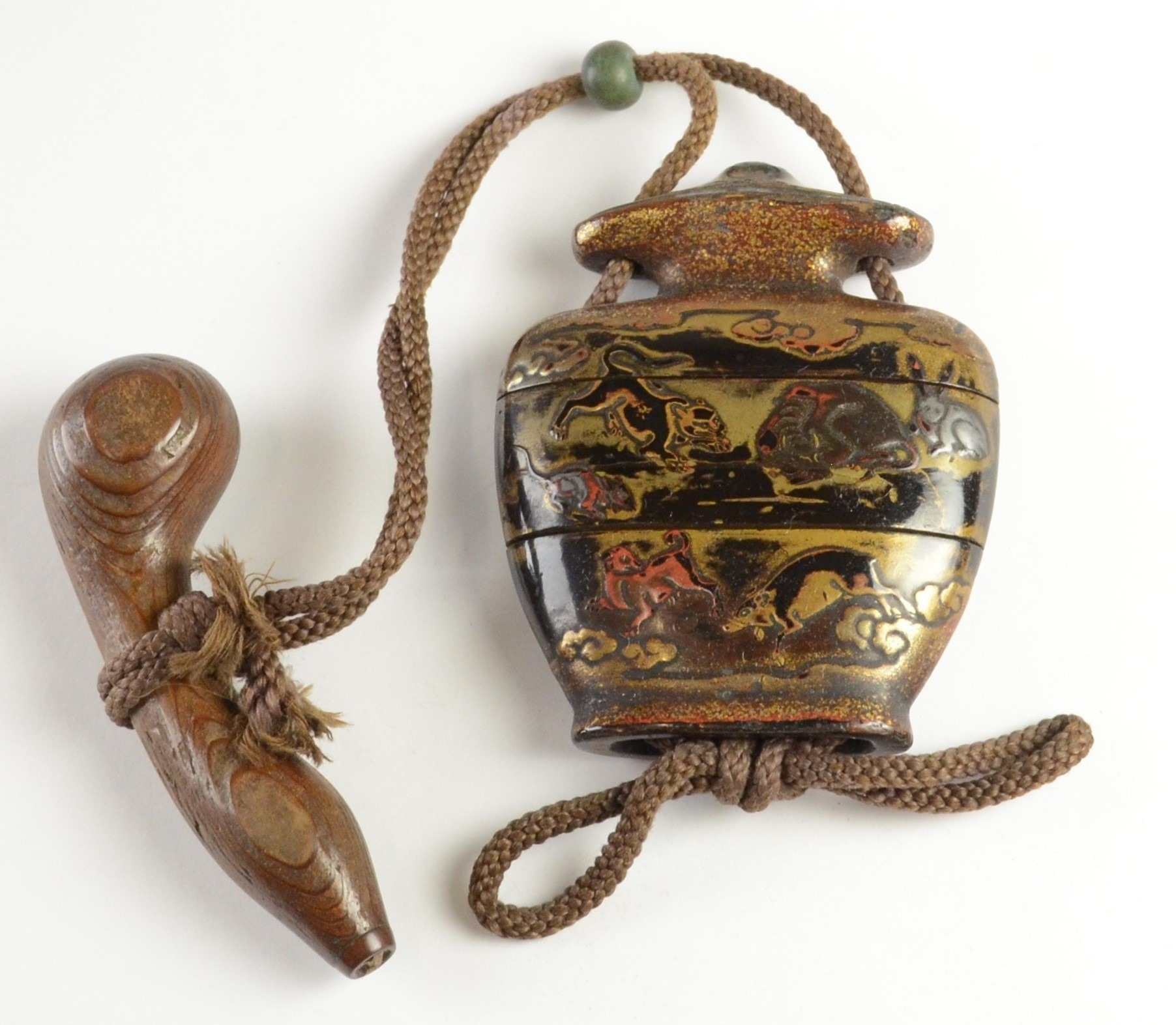 A lacquer two case inro in the form of a jar decorated in negoro depicting Junishi (the twelve animals of the zodiac) with pipe