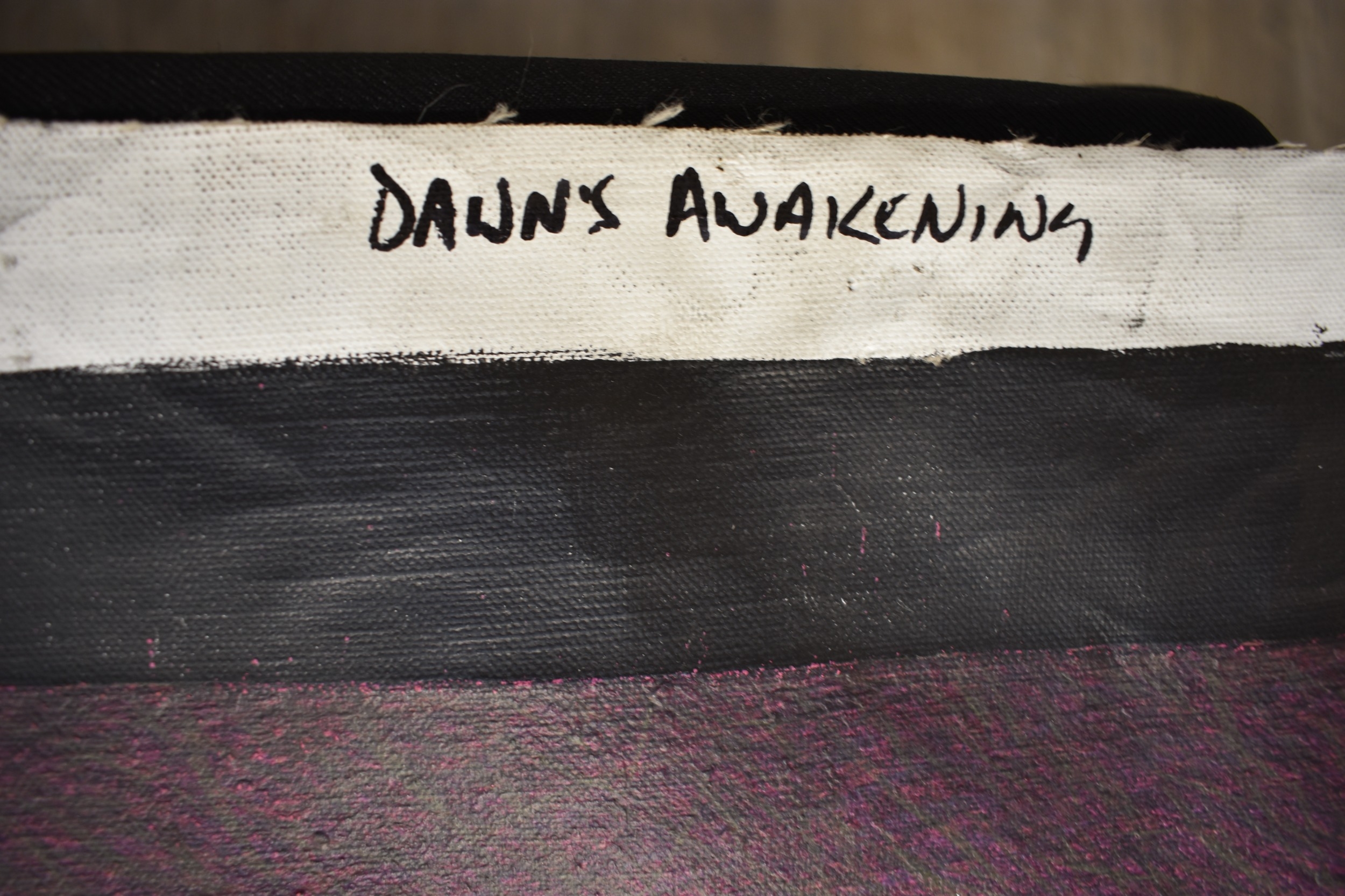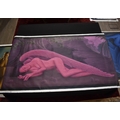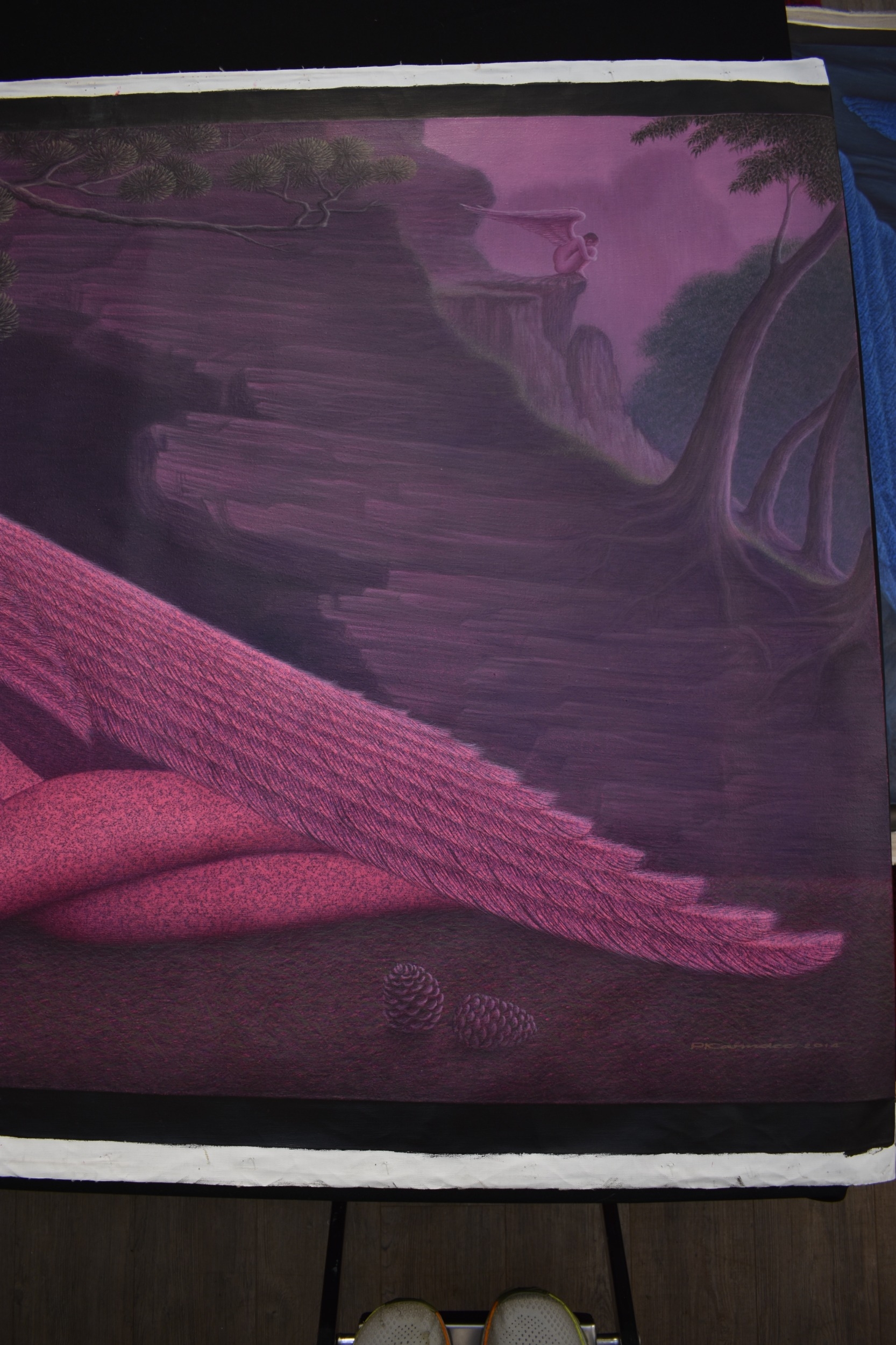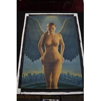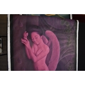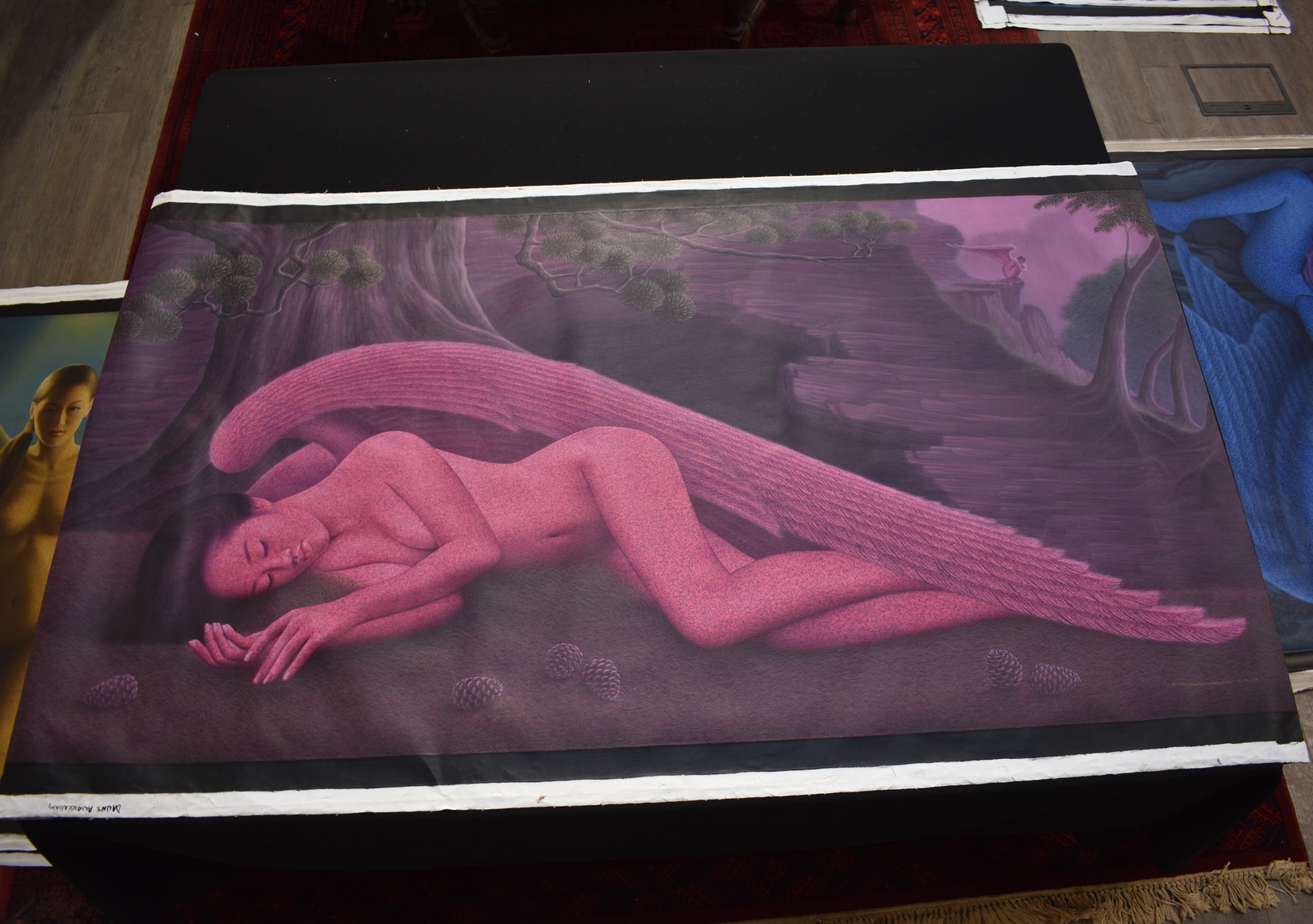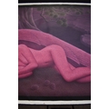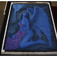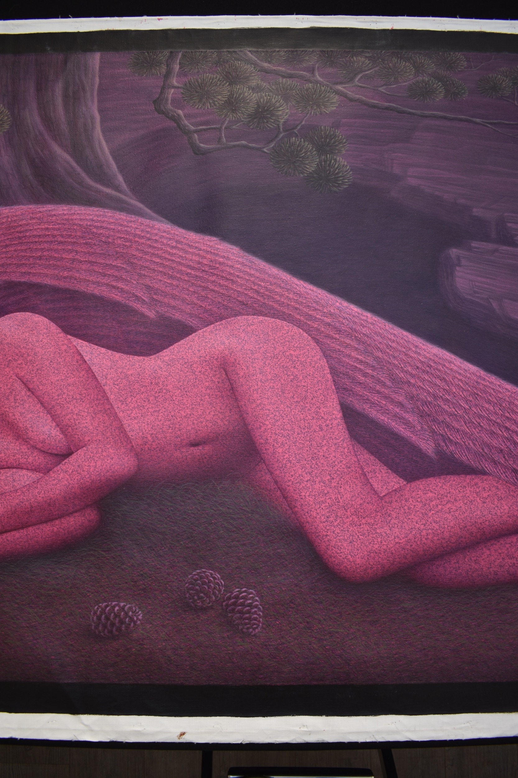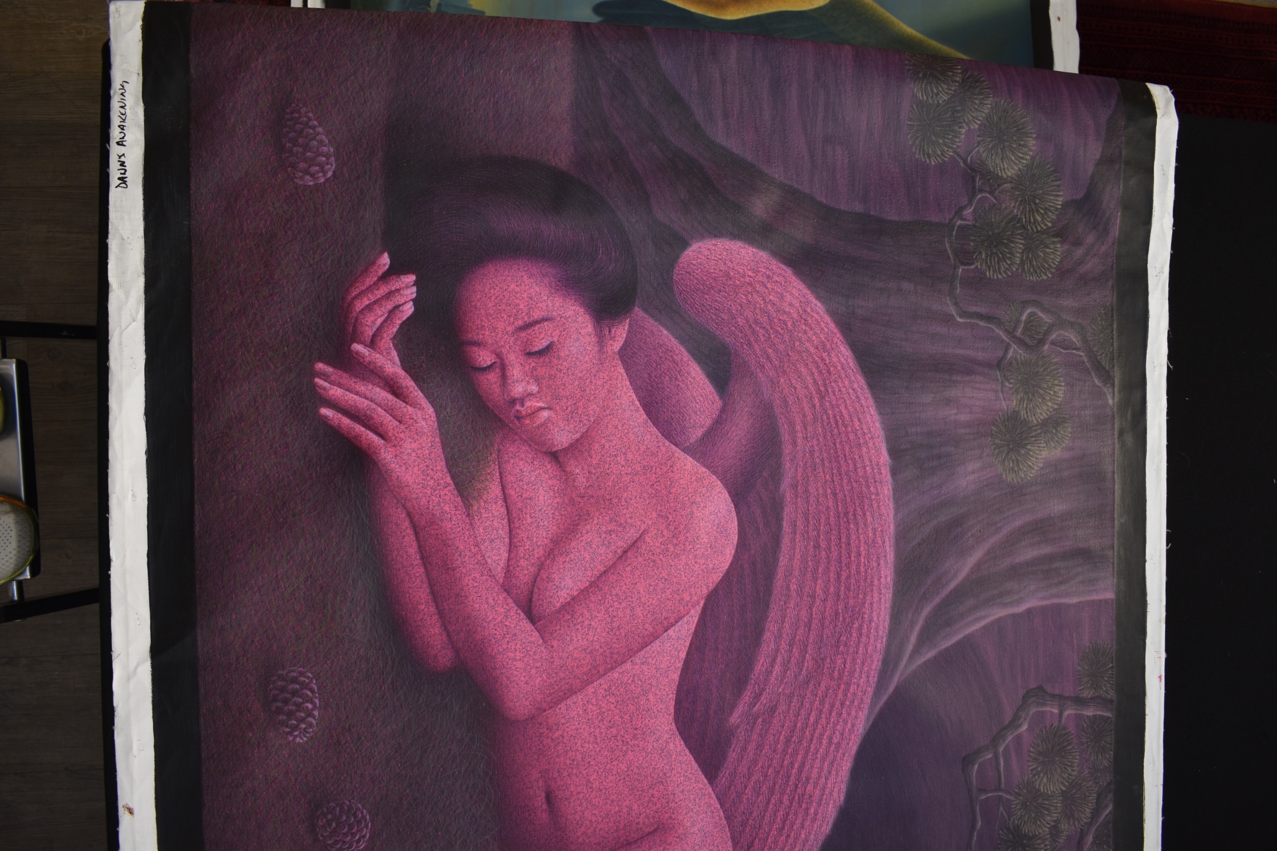 PAIROJ KARNDEE Thai Contemporary Artist: Portrait female in Angel form, titled " Dawn's Angel" the full length angel sleeping under a fir tree with pine cones, wing covering her feet, purple/pink tonal skin, acrylic on canvas. The artist has been influenced by the mysterious Apsaras - the celestial maidens of ancient Asian culture depicted in the galleries of Cambodia's Angkor Wat. His techniques painstakingly recreate the stone textures of those images with a time-consuming rendering of acrylic on linen canvas. His figures show a notable range of emotions. Signed and dated, 2014, images size 99cm x 189cm