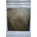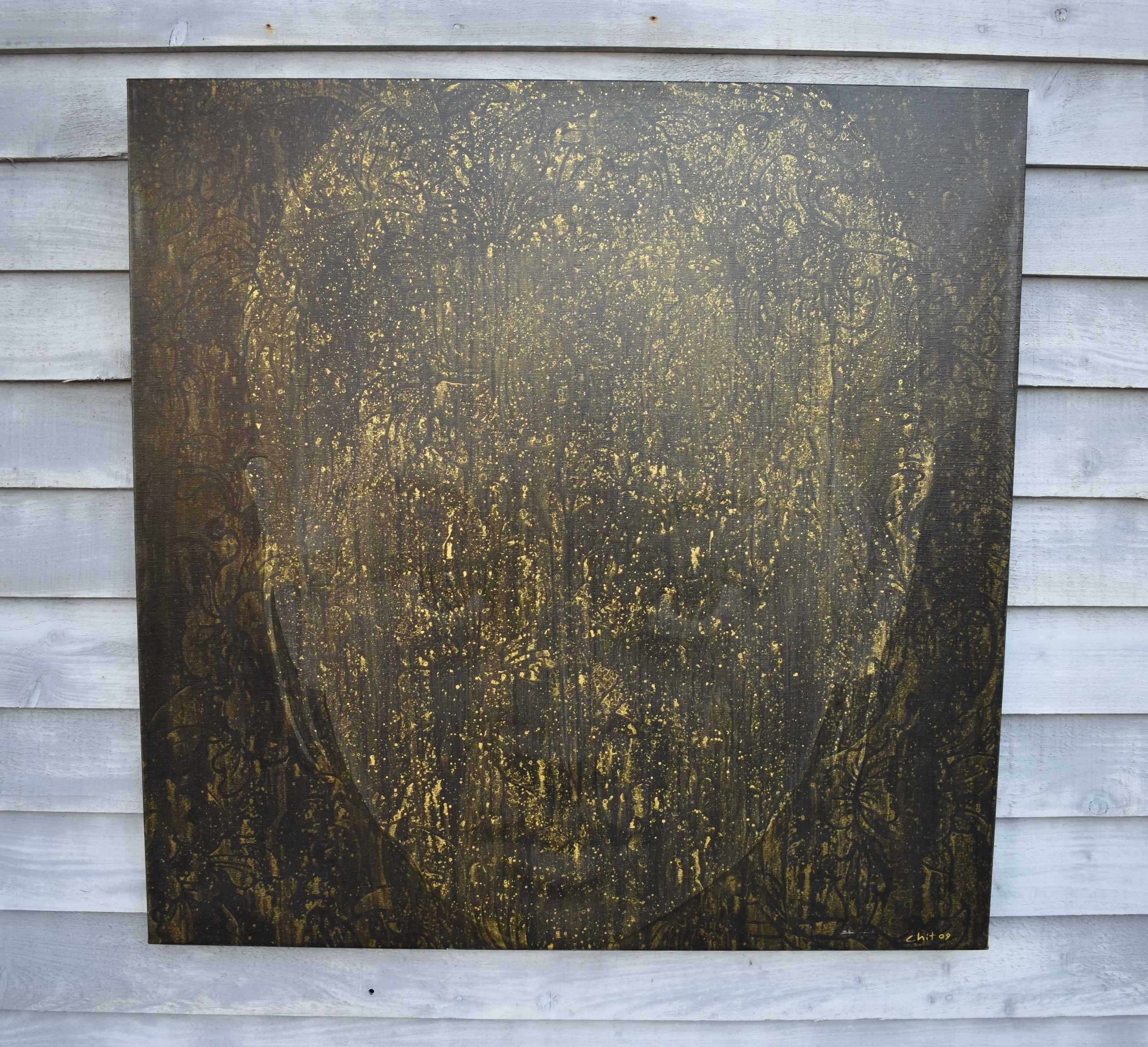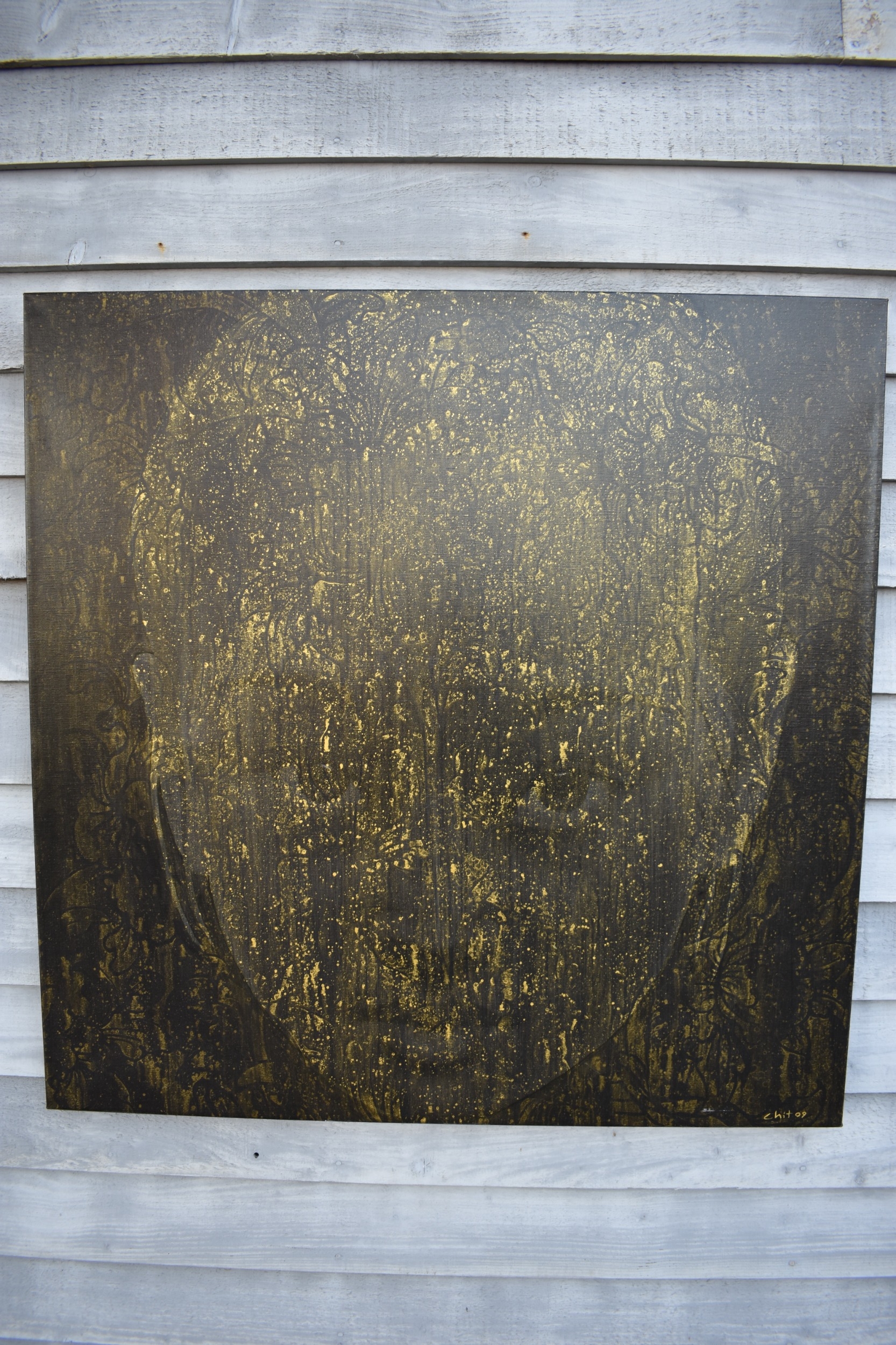 CHIT: Thai Contemporary artist: Mixed media portrait. The front profile image of young girl with black background gilt wax resist highlights, dated '09. 100cm x 100cm