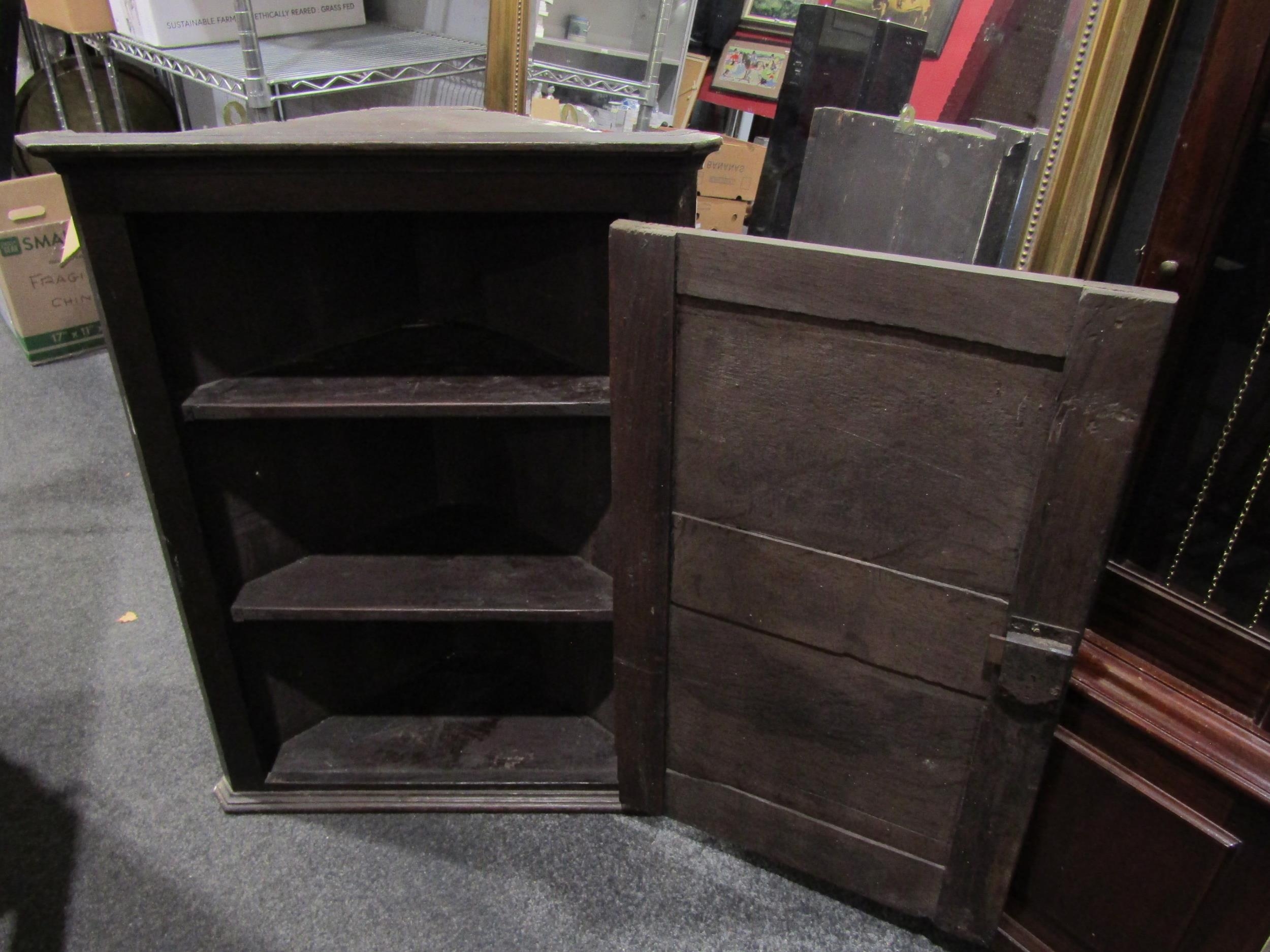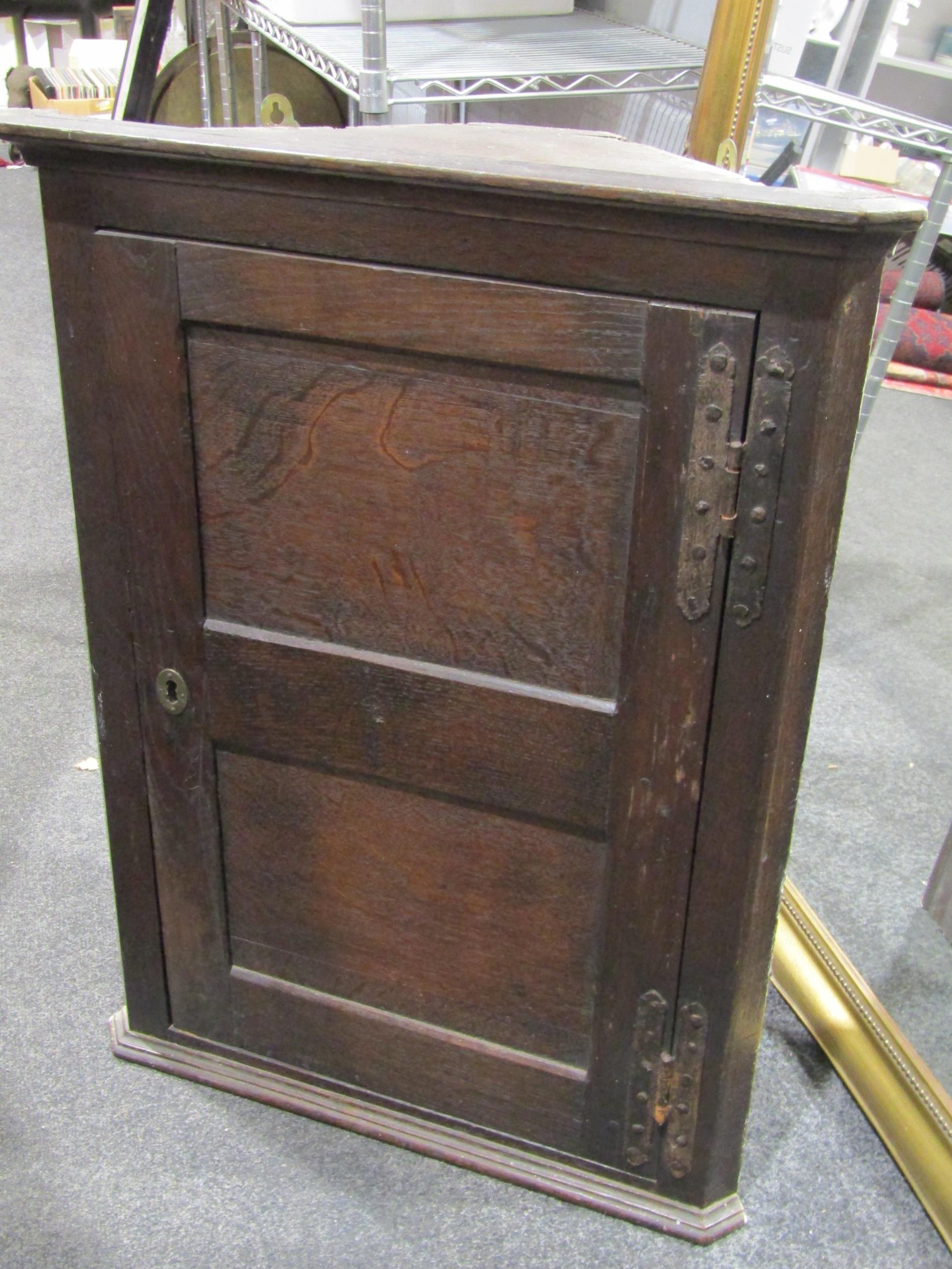 A Georgian oak wall hanging corner cupboard, with key, 84cm ...