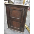 A Georgian oak wall hanging corner cupboard, with key, 84cm tall x 65cm wide